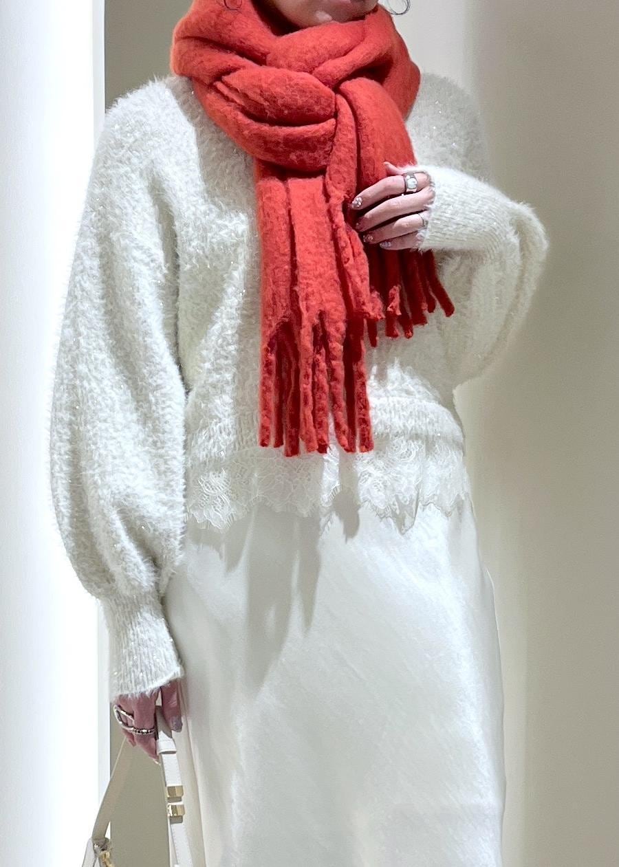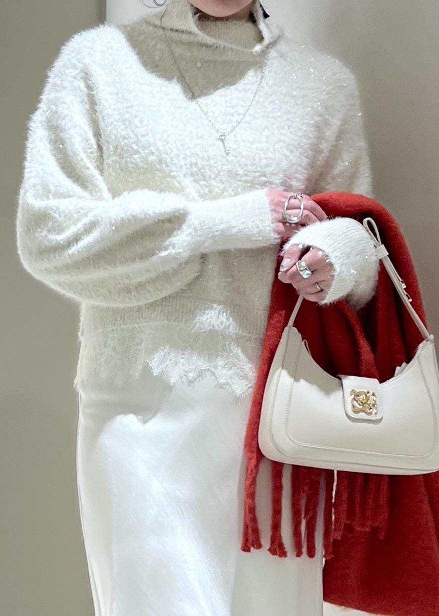ラメフェザー裾レースハイネックニット