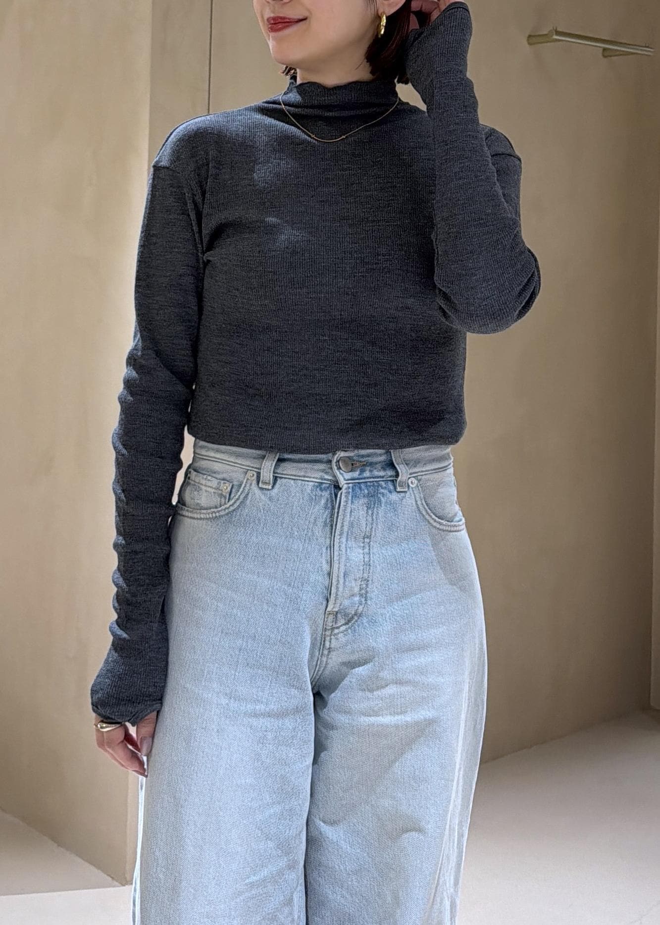ROPÉ SELECT【一部店舗限定】【REALM(レルム)】RIBBED JERSEY TOP|カットソーチャコール / F¥30,800レビュー程よいゆとり感があり身体の肉感を拾いにくいためすっきりと着られるニットです。着丈はヒップが隠れるほどでハイネックなので首元の窮屈感もなく着心地◎
