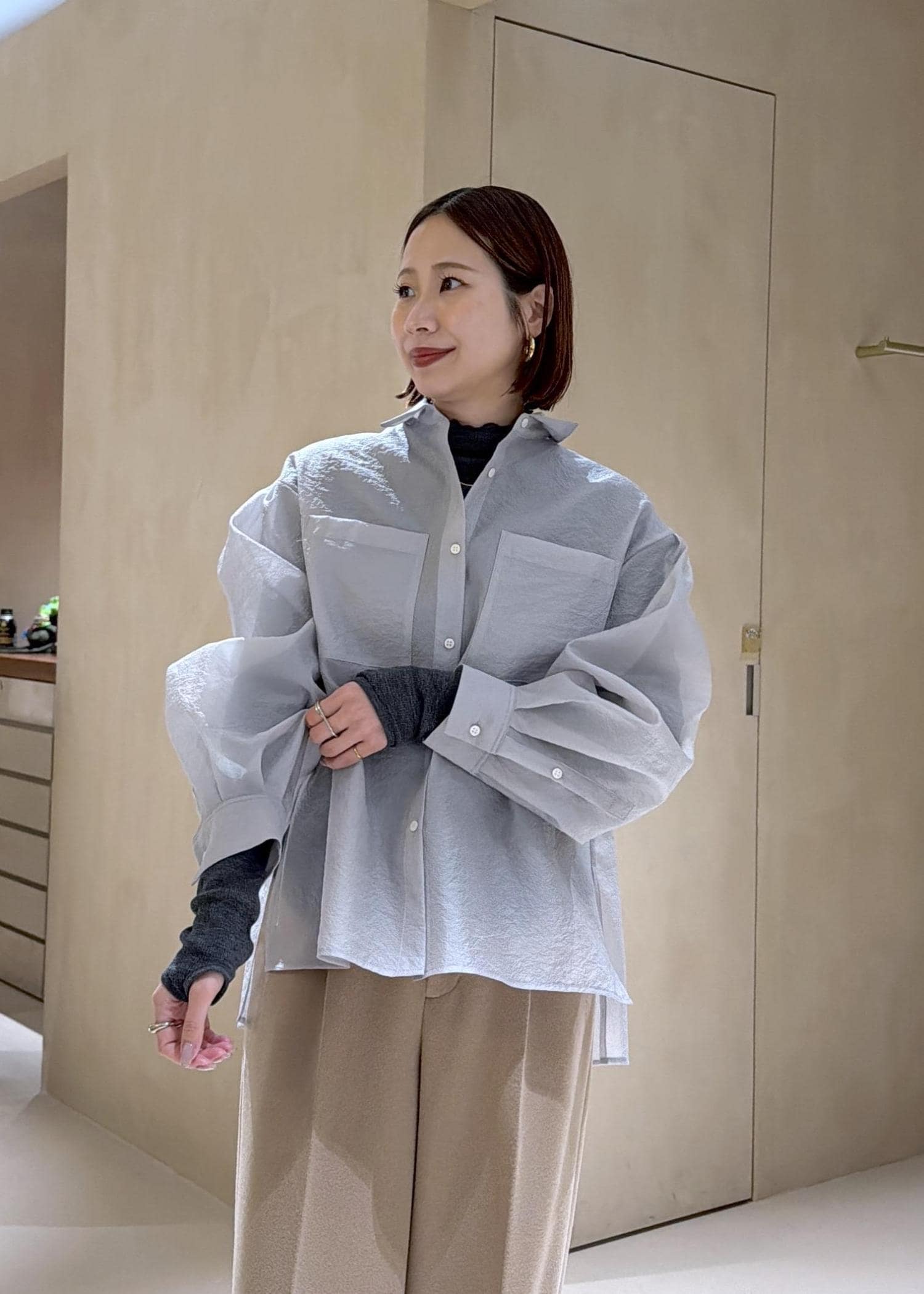 透け感のあるブラウスはレイヤードスタイルが冬の時期はおすすめ。通年使えるシャツは1枚持っていて間違いなしのおすすめアイテムです◎