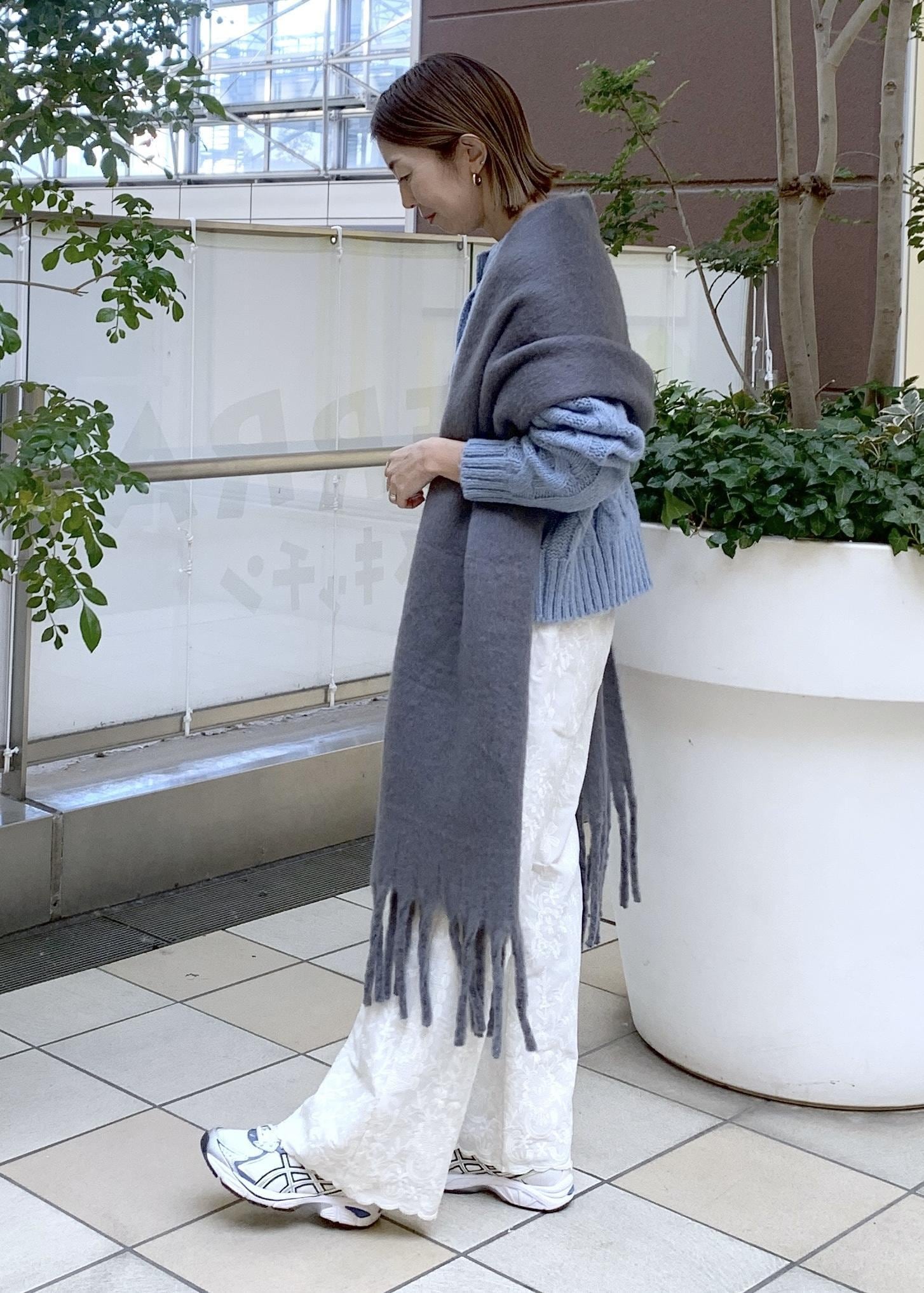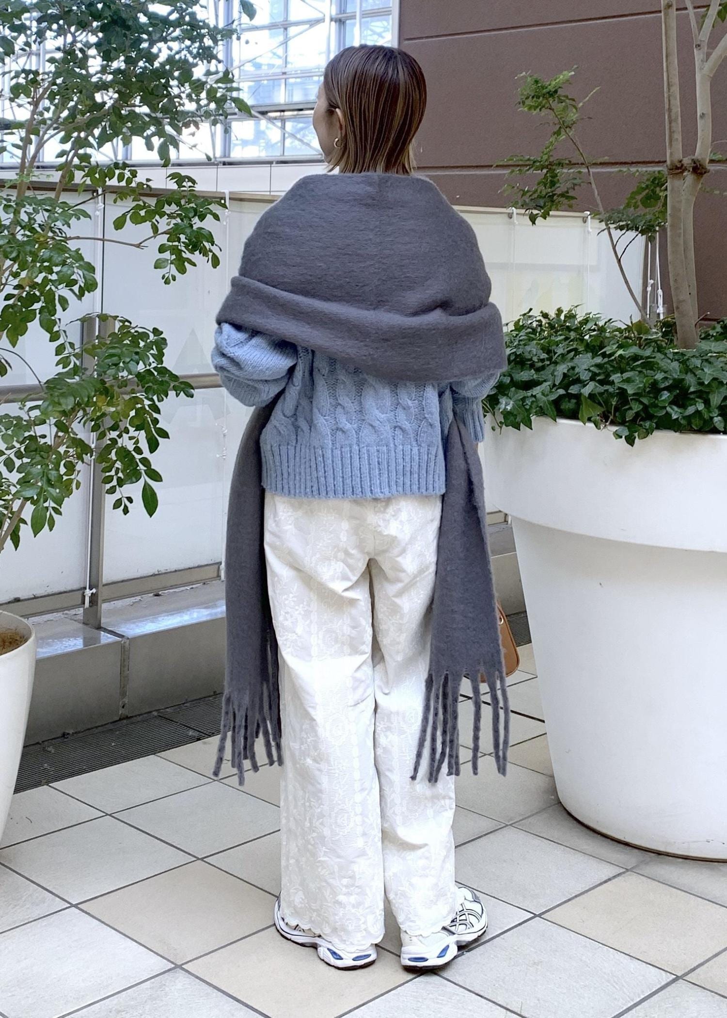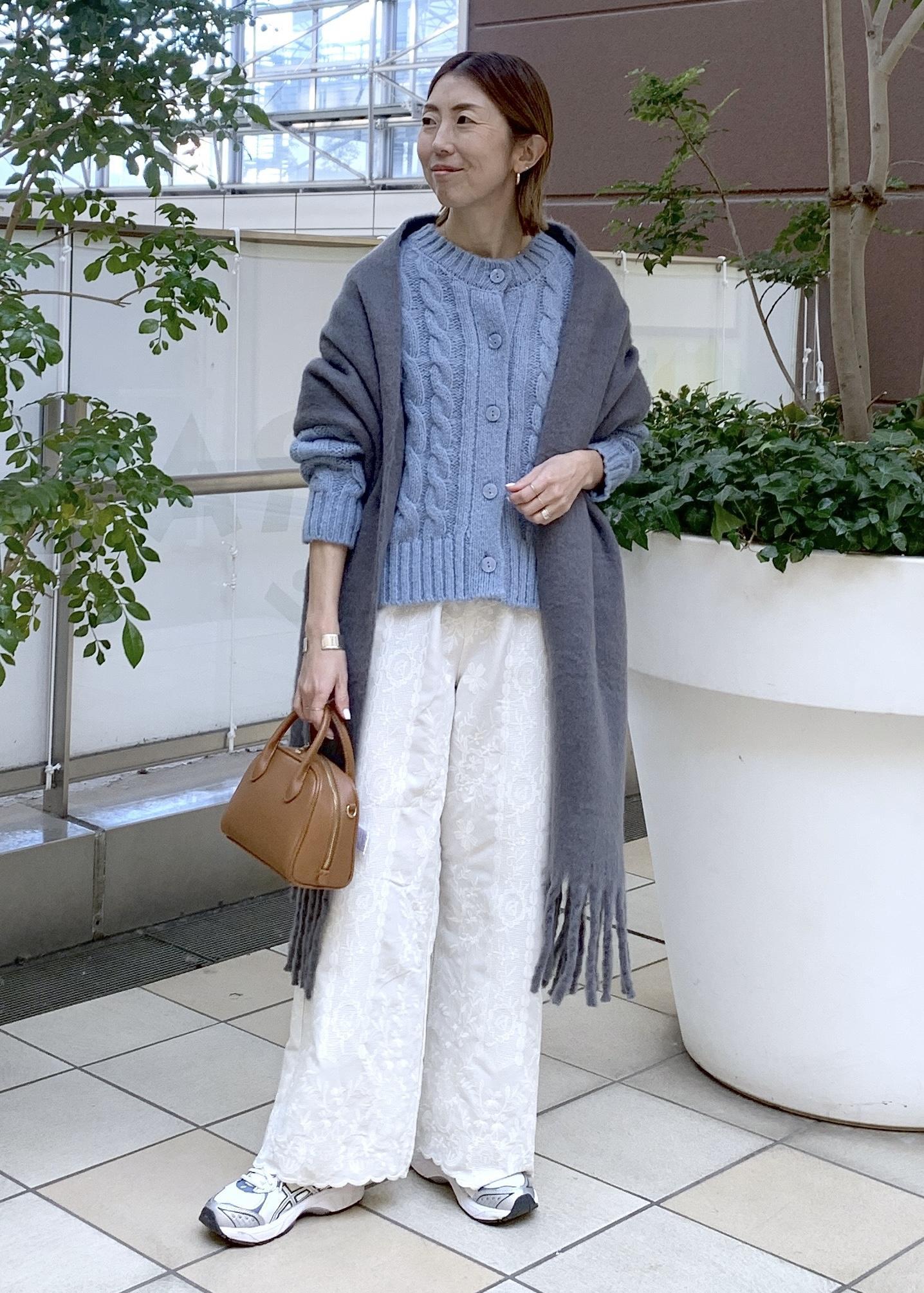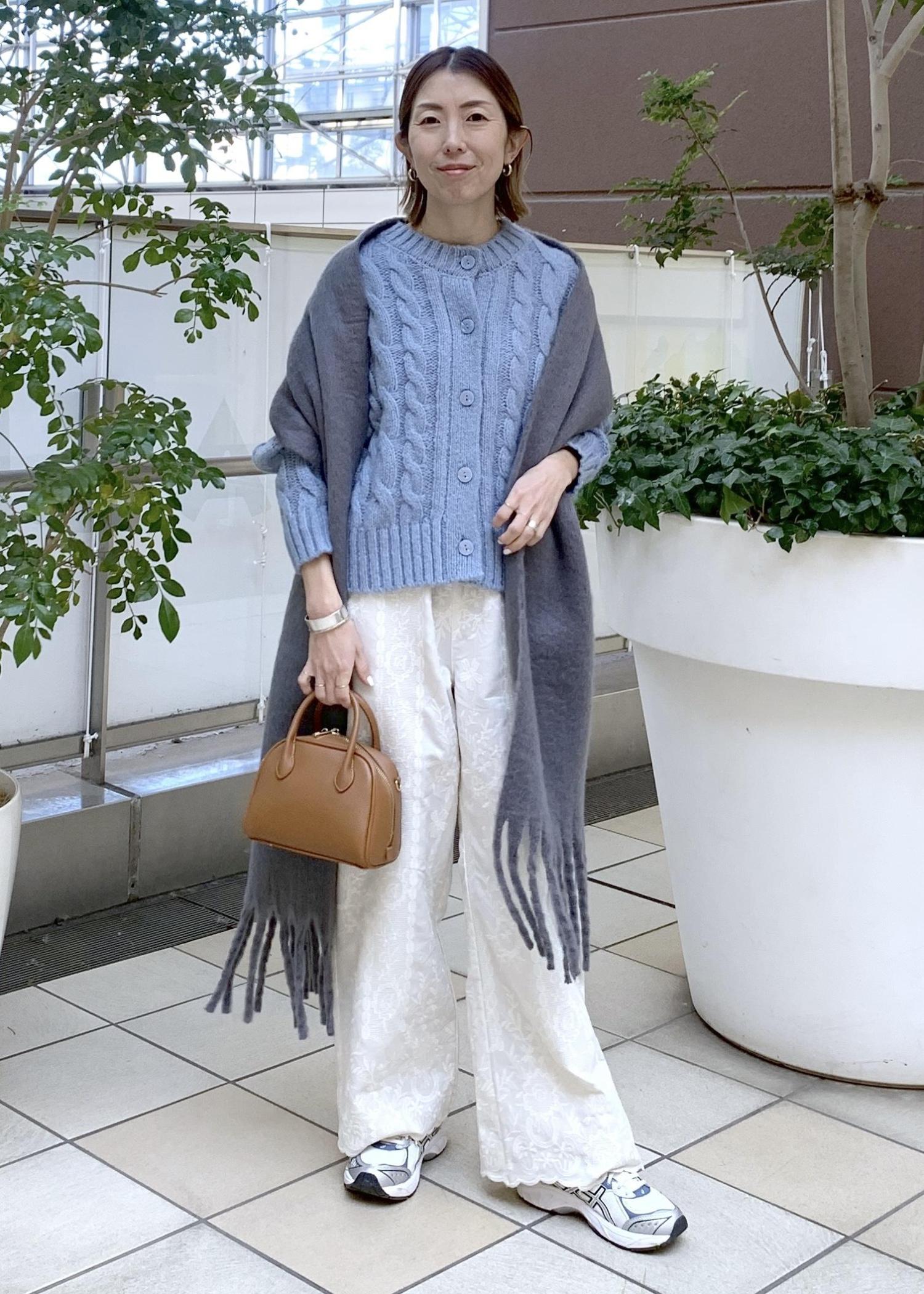 ふわふわのケーブルカーデと合わせた大人のリラックススタイリング