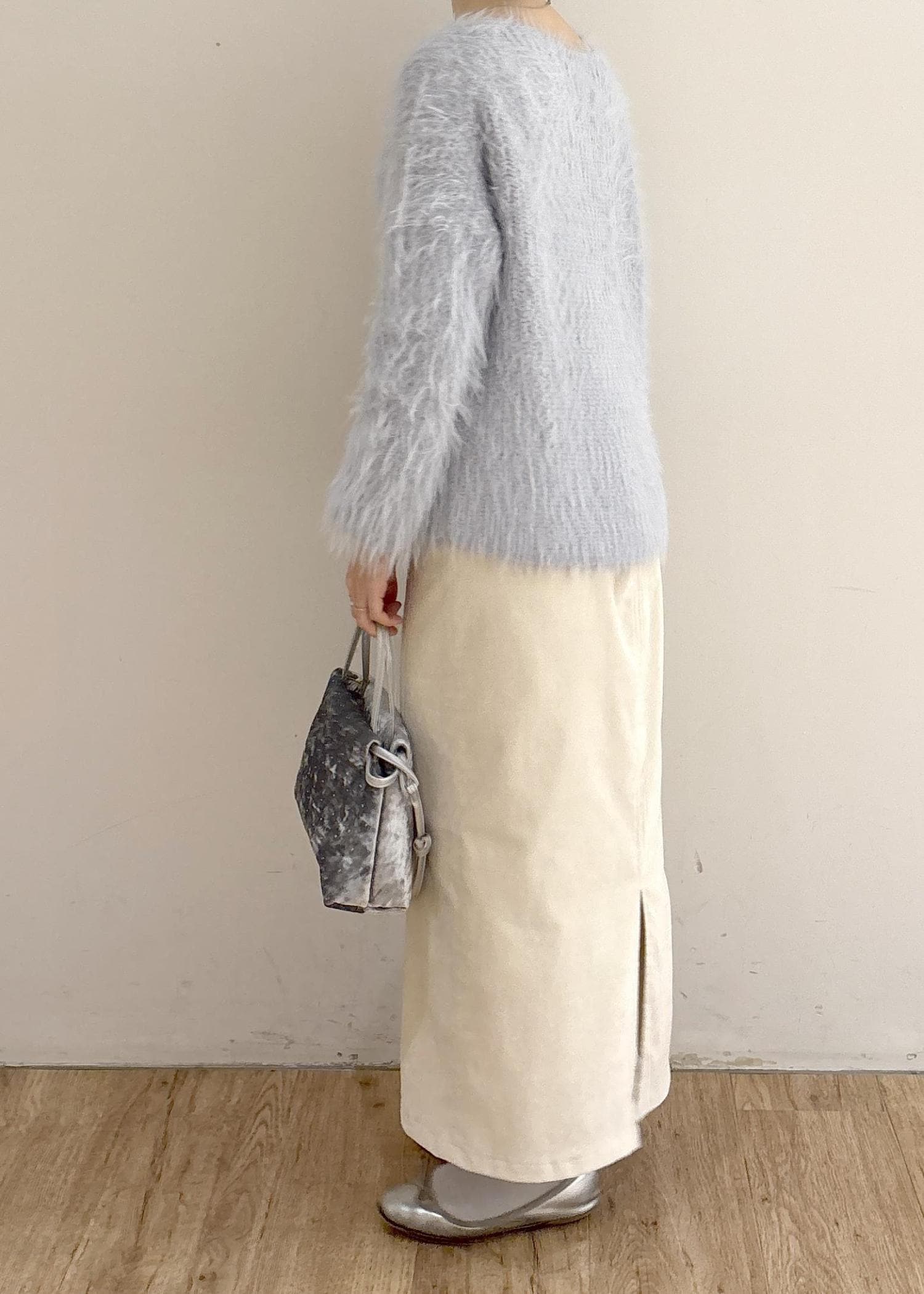冬らしい素材のアイテムでコーディネートしました。淡い色味で柔らかい雰囲気にしました。