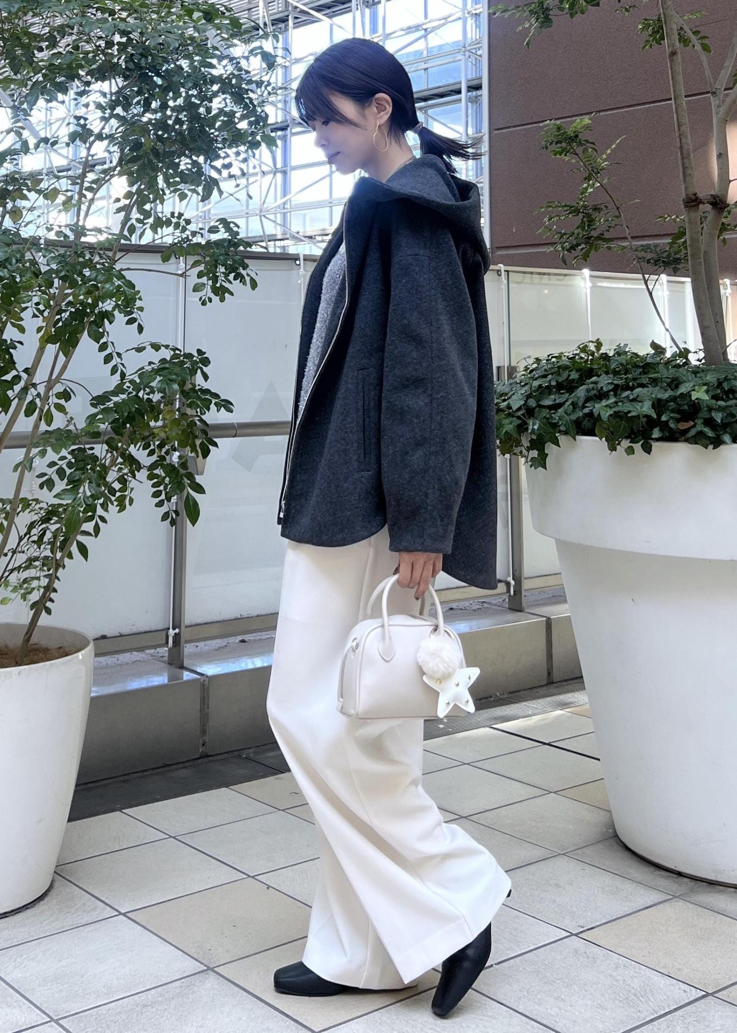 ホワイトのパンツを合わせて、大人のきれいめカジュアルコーデにまとめました。