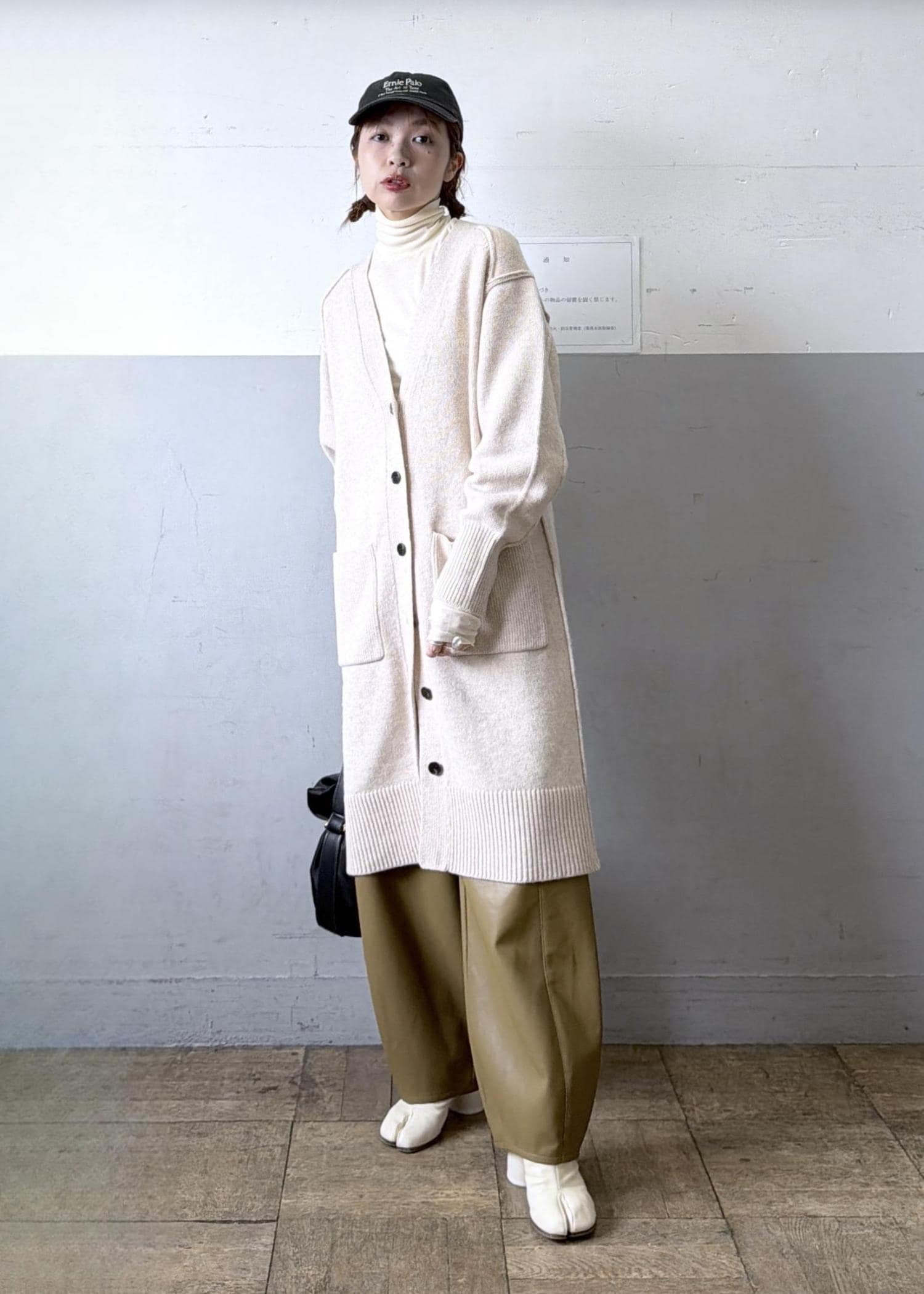 レザー風アイテムも優しいカラーのワントーンで合わせるとハードにならないですよ。