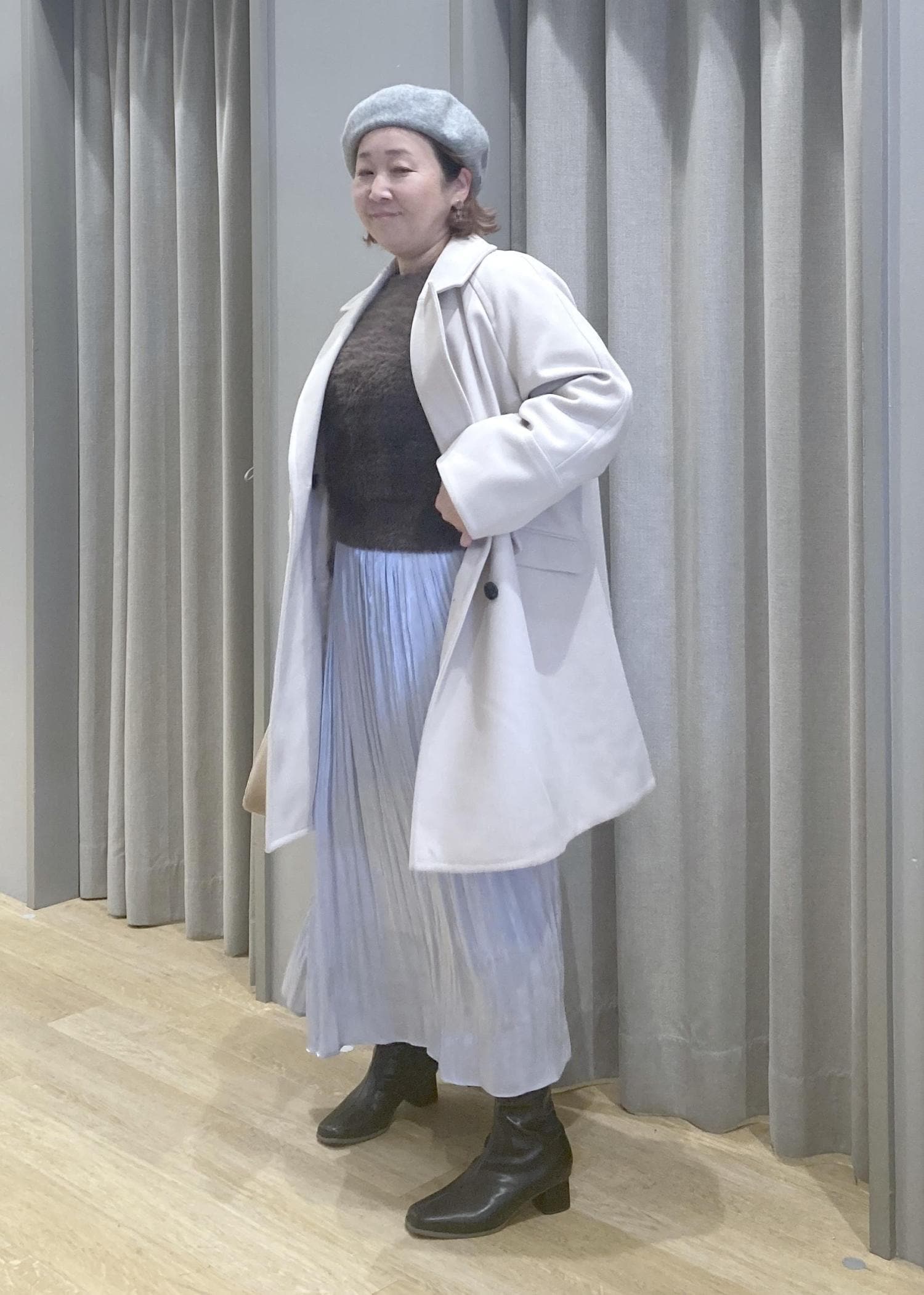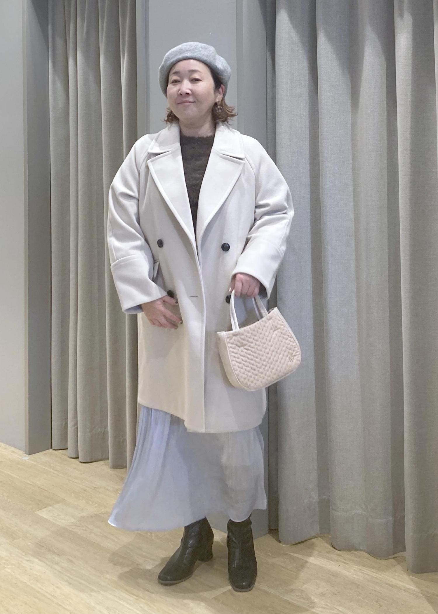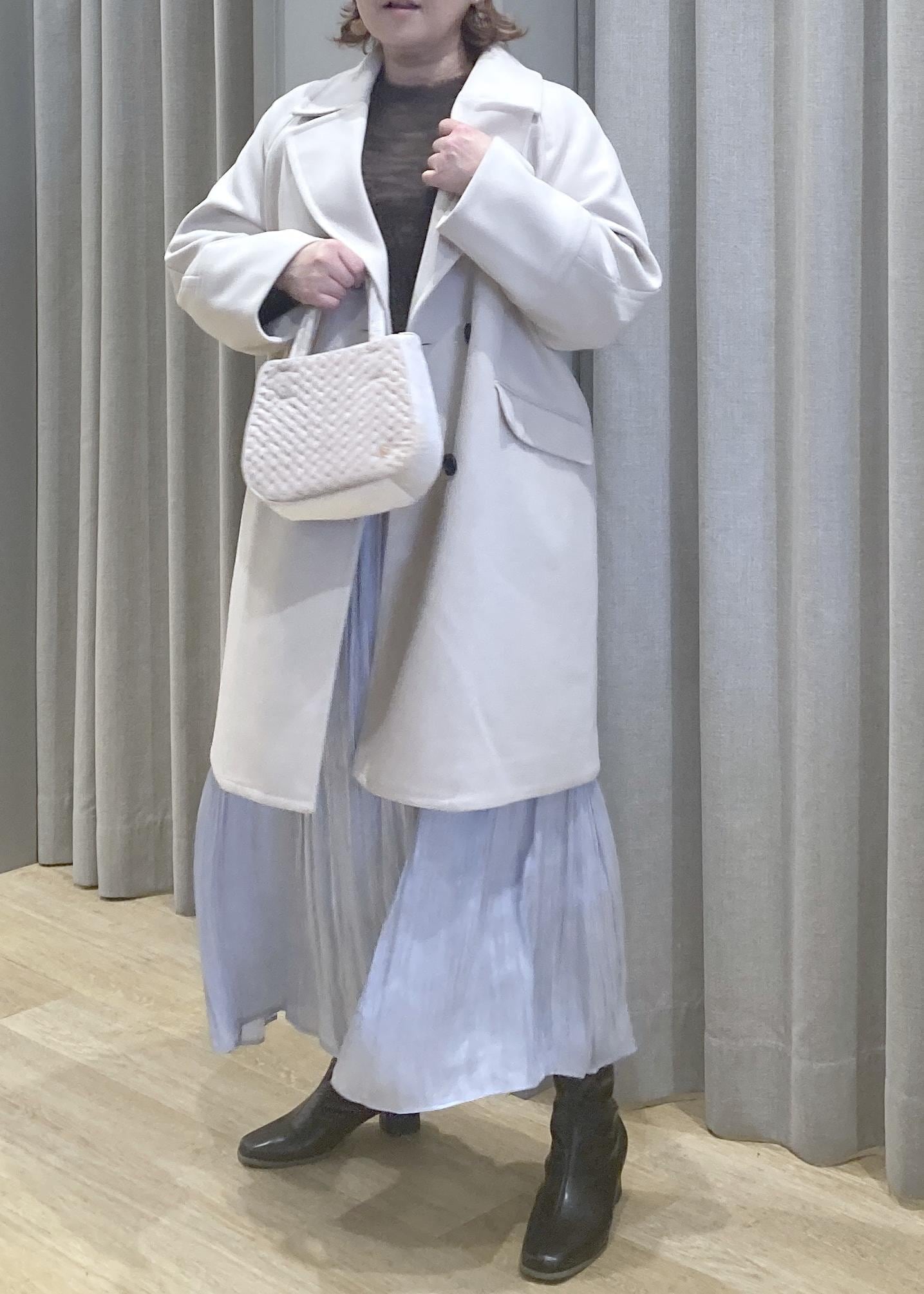 淡色コートで全体をふんわりまとめて、体のラインはさりげなくカバーしてくれます。