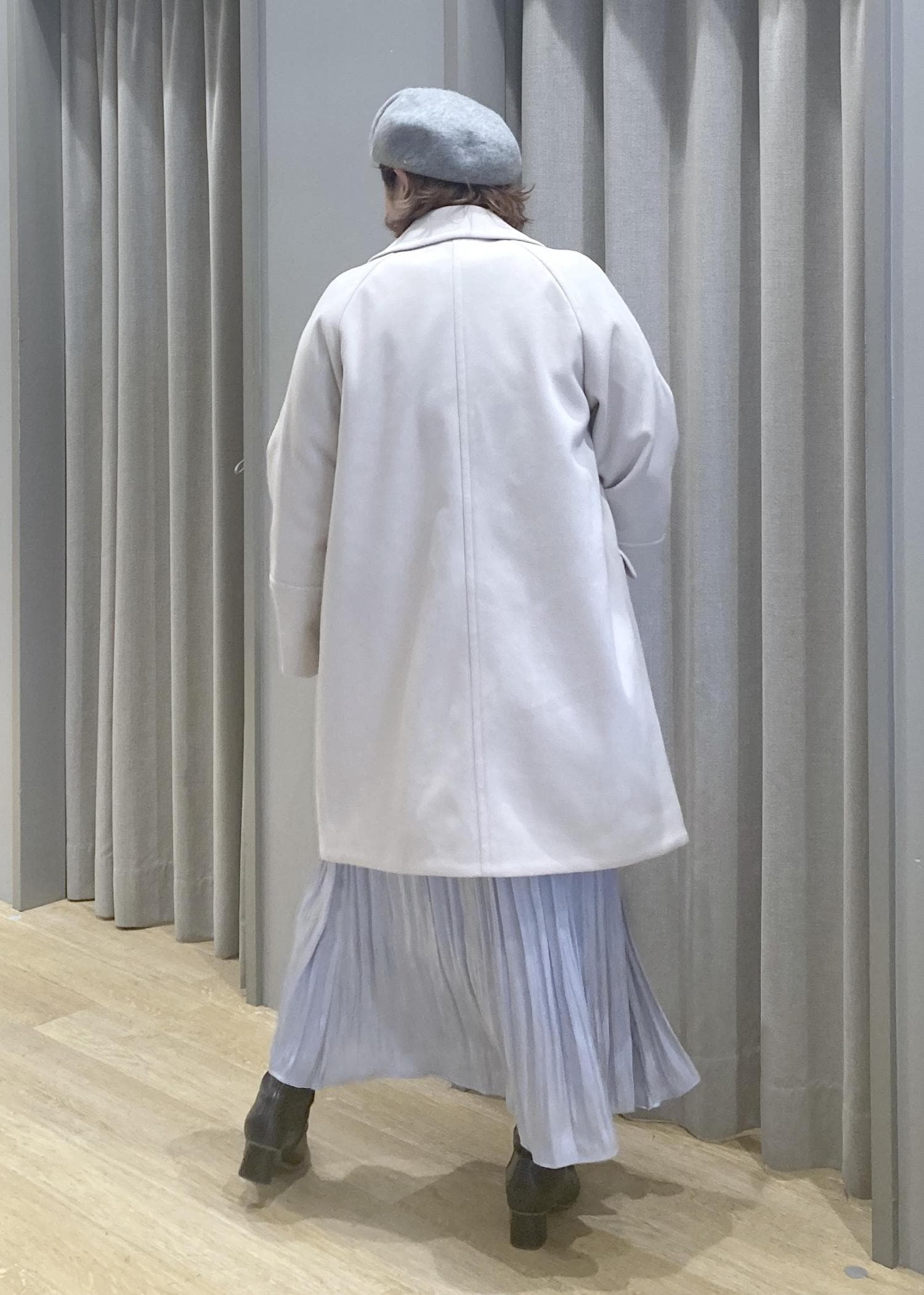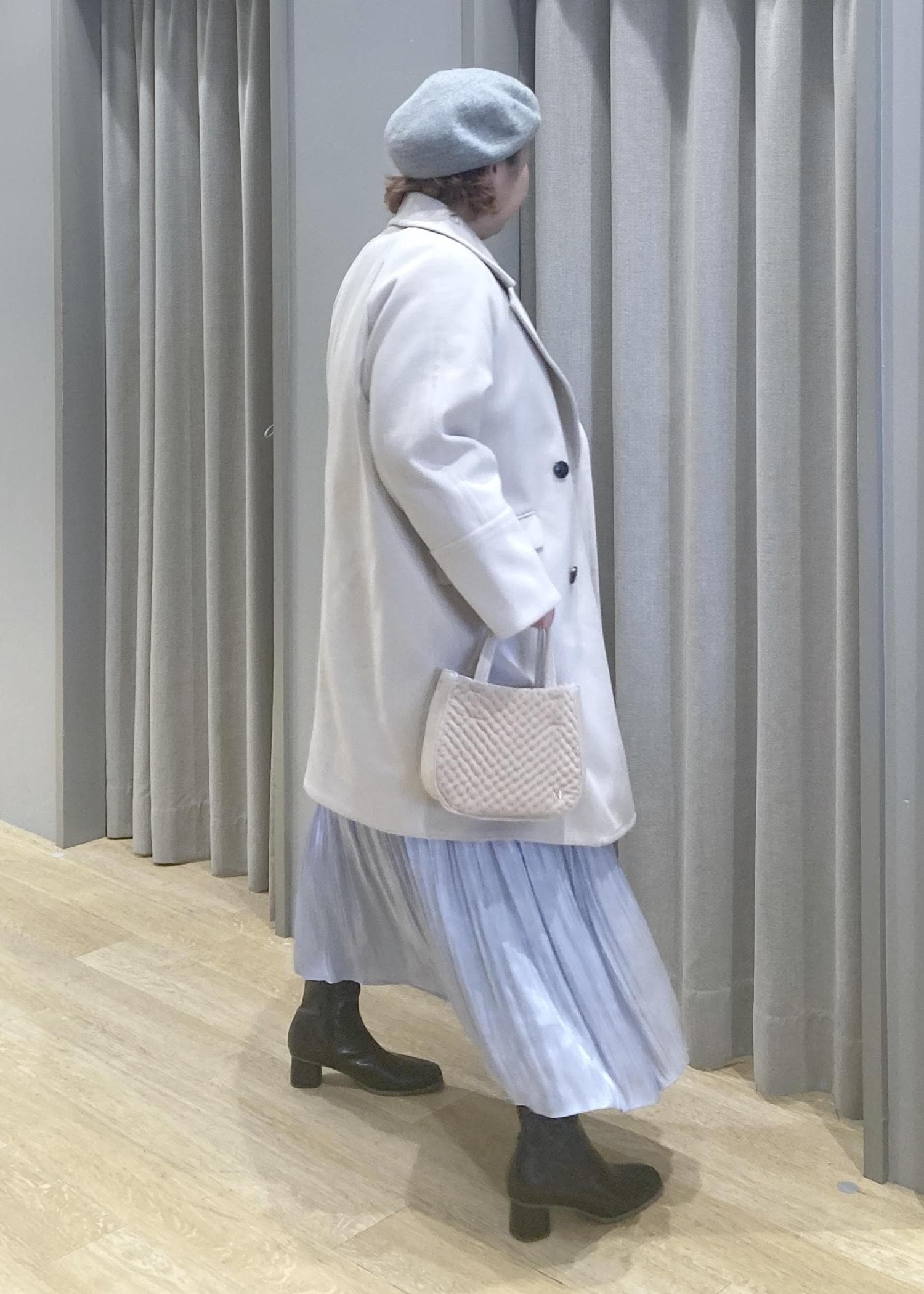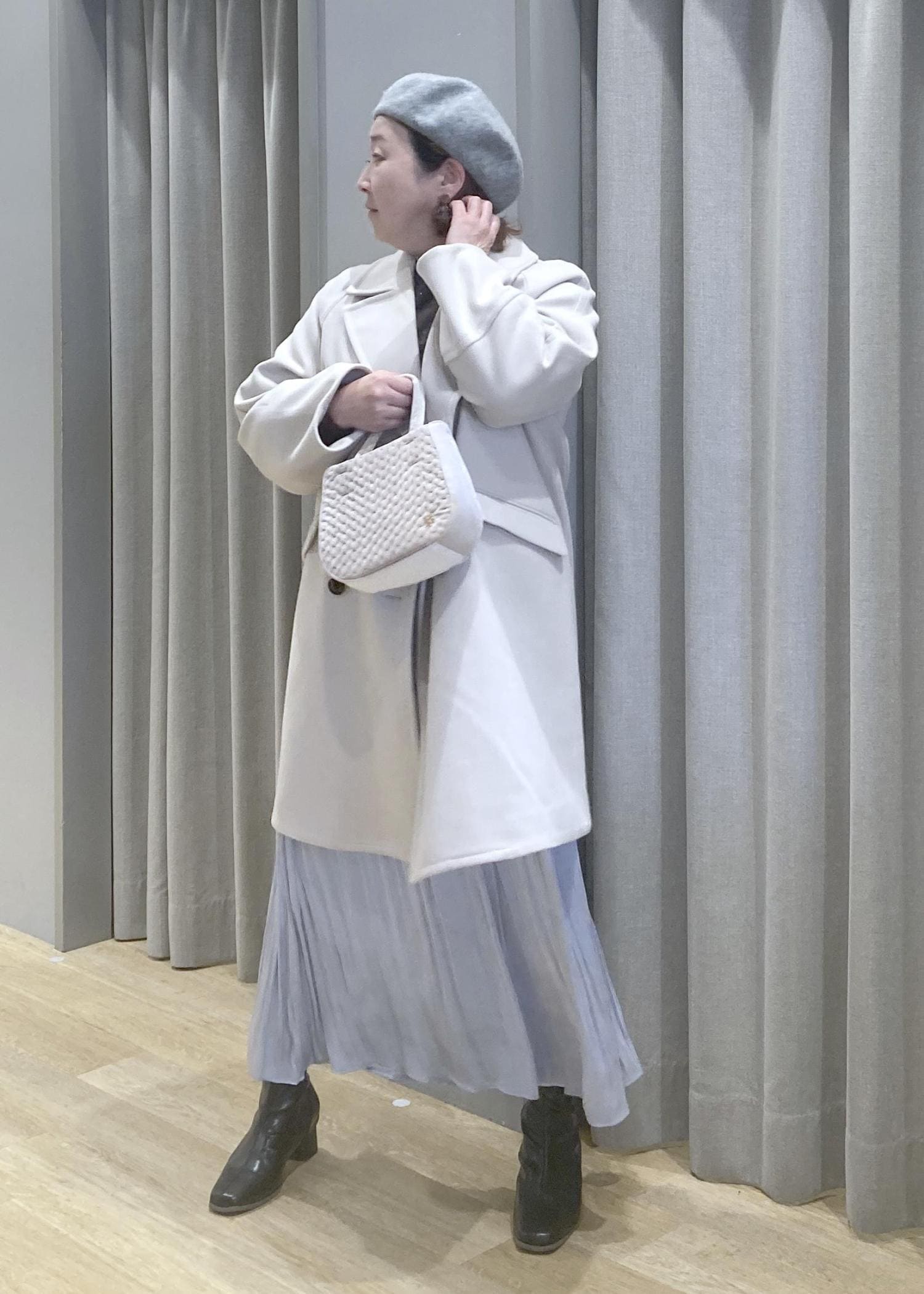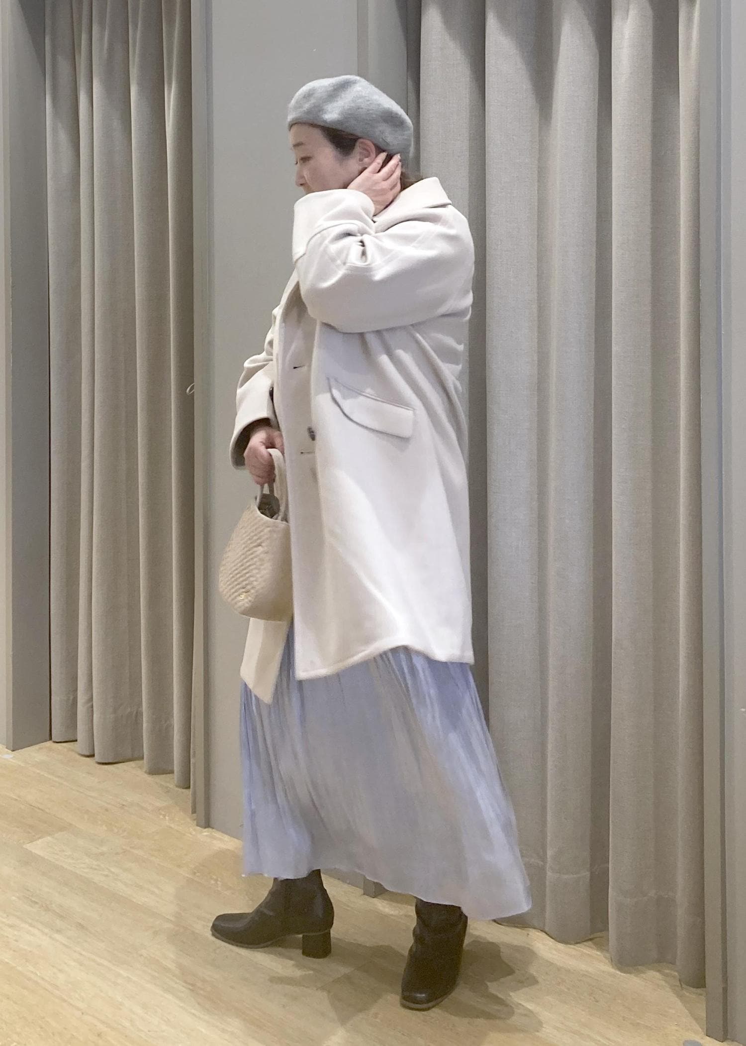 淡色コートで全体をふんわりまとめて、体のラインはさりげなくカバーしてくれます。