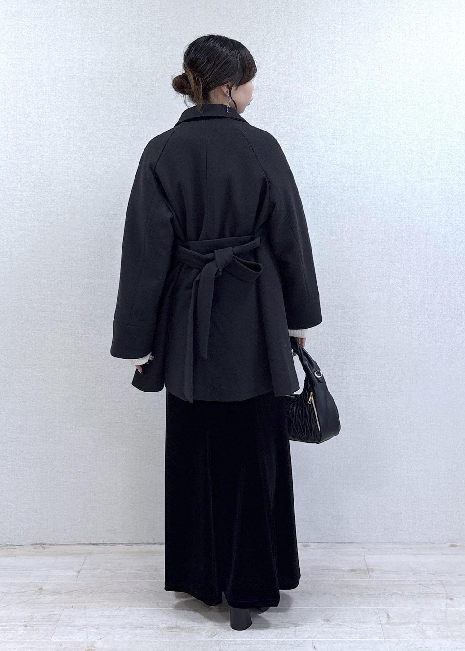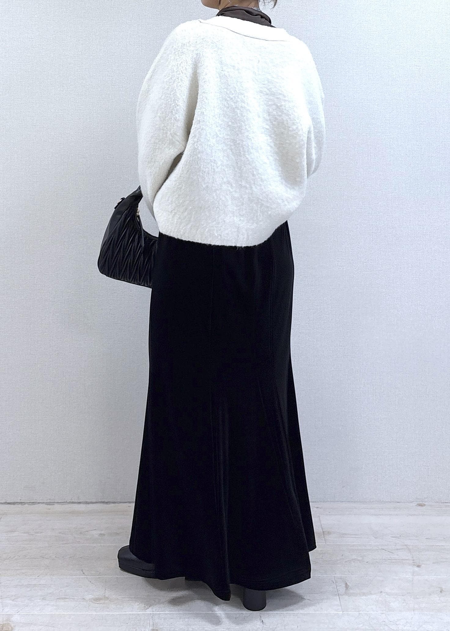 長めにドレッシーな印象で着用したい気分だったのでMを選びましたが、身長160cm、腰位置より若干下の位置でフィットする着用感で、地面より少し浮く長さになりました。