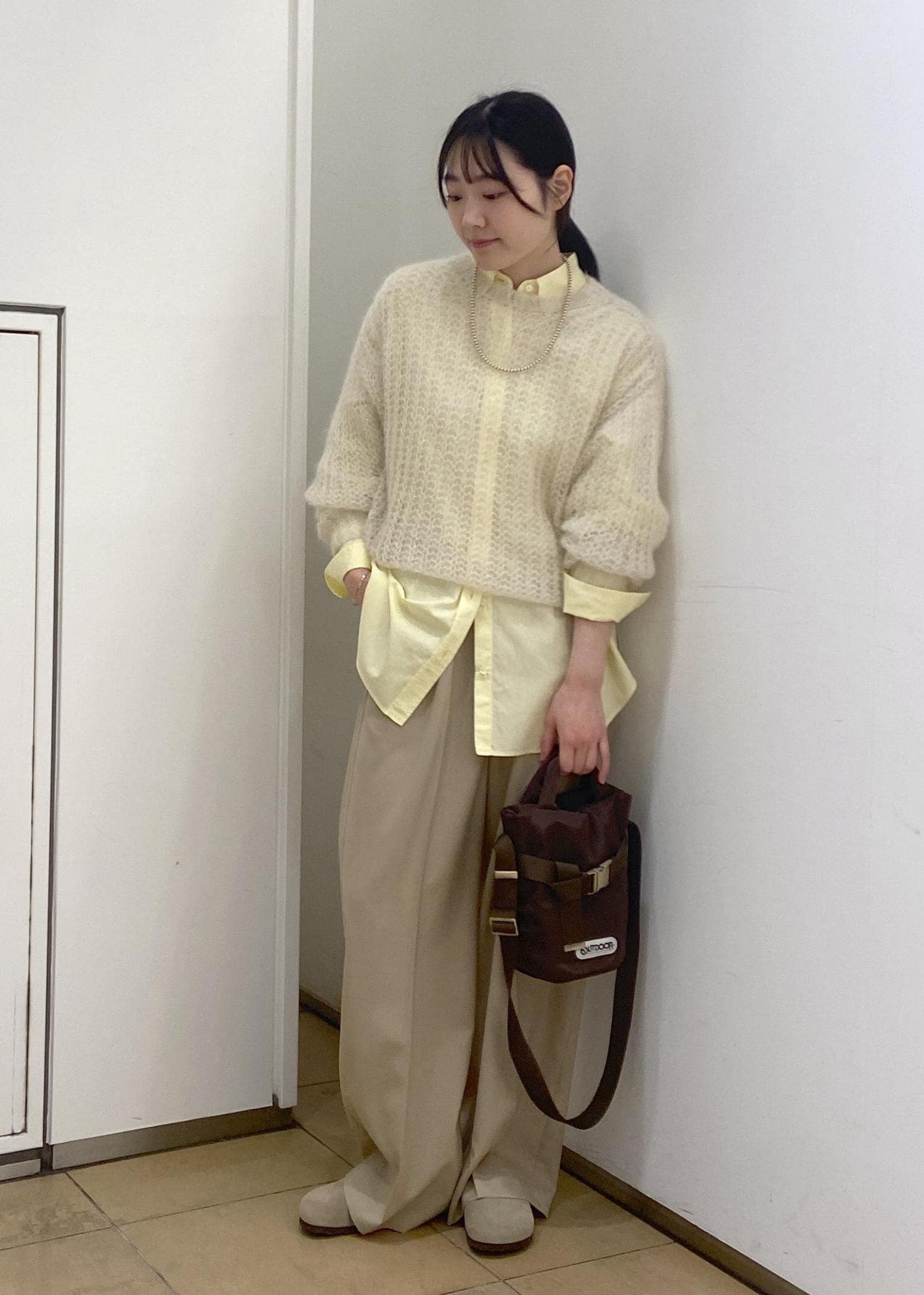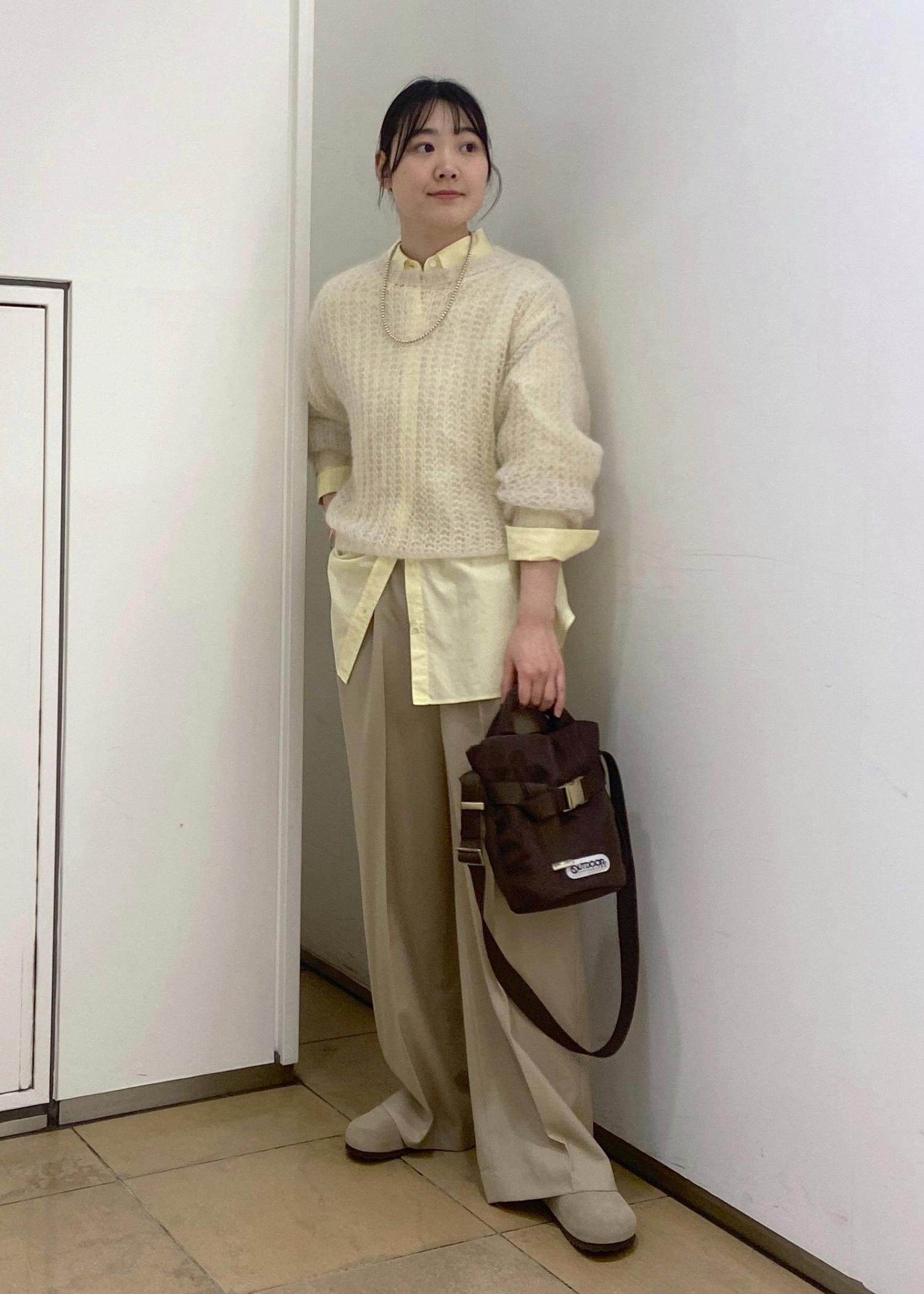 柔らかなベージュトーンでまとめたカジュアルコーデ。