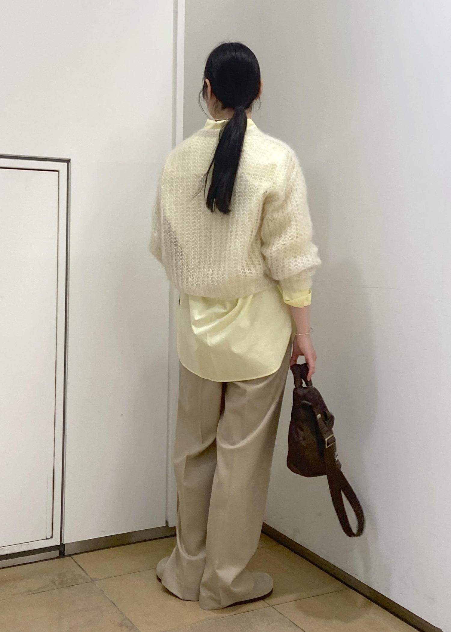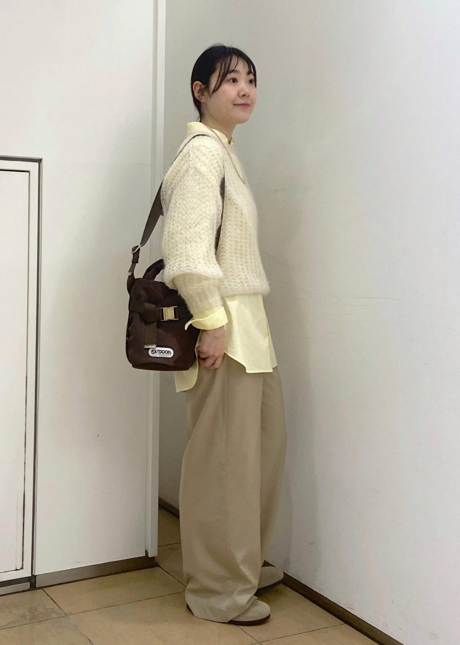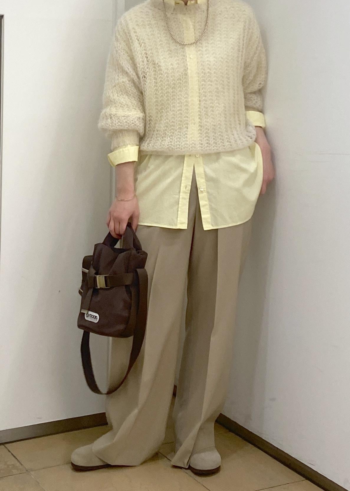 シャツとスラックスだけではかちっとしすぎるのでモヘアで素材感のメリハリと柔らかさをプラスしてます。