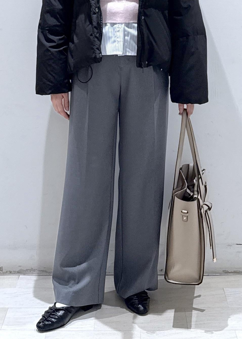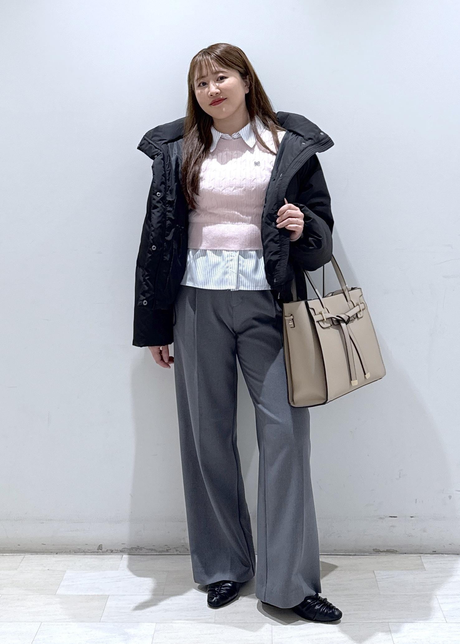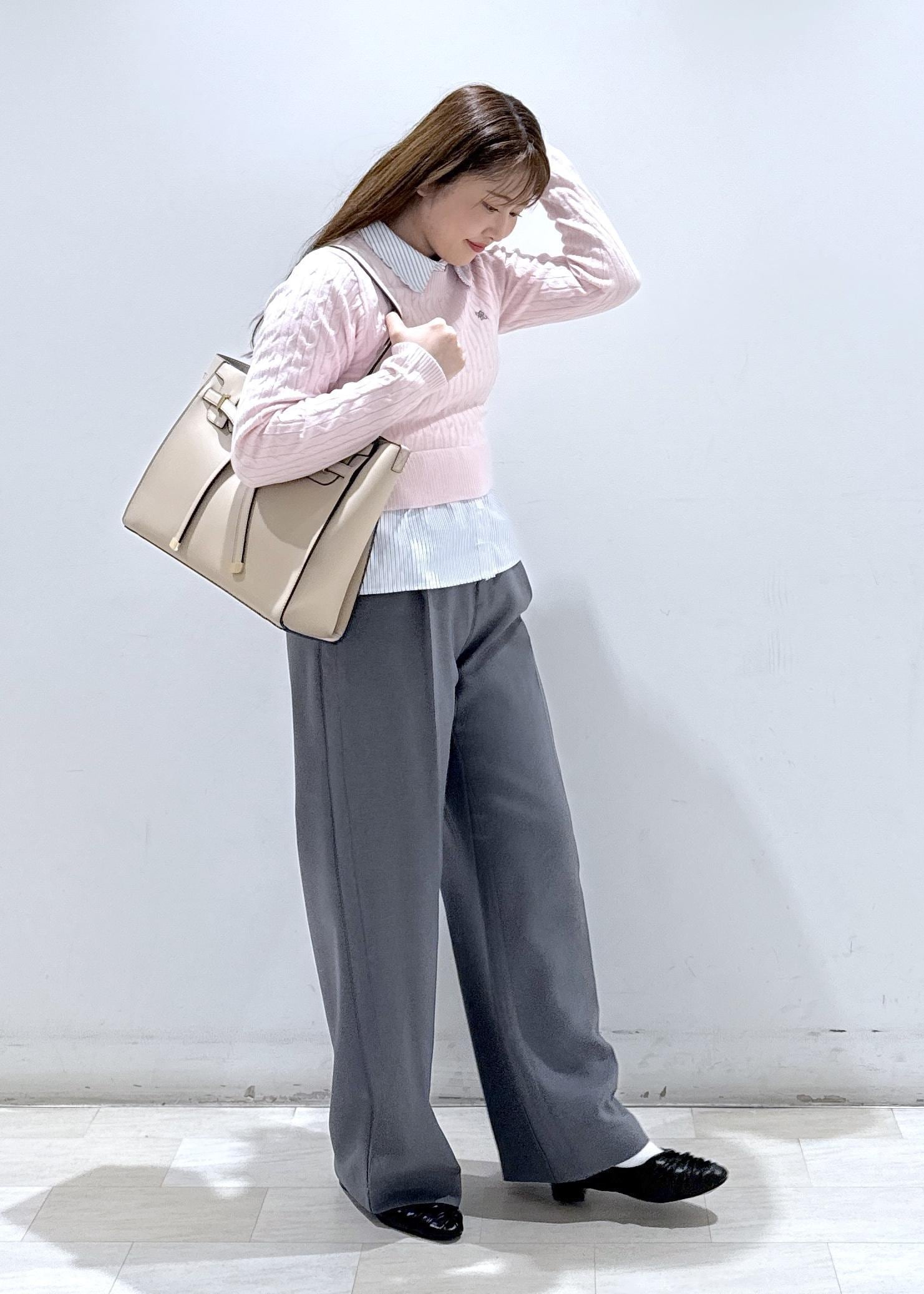 今回は新作で入荷しましたシャツとニットがドッキングになったニットのトップスに、ウーリッシュのワイドパンツと合わせて綺麗めカジュアルなコーディネートにしてみました。