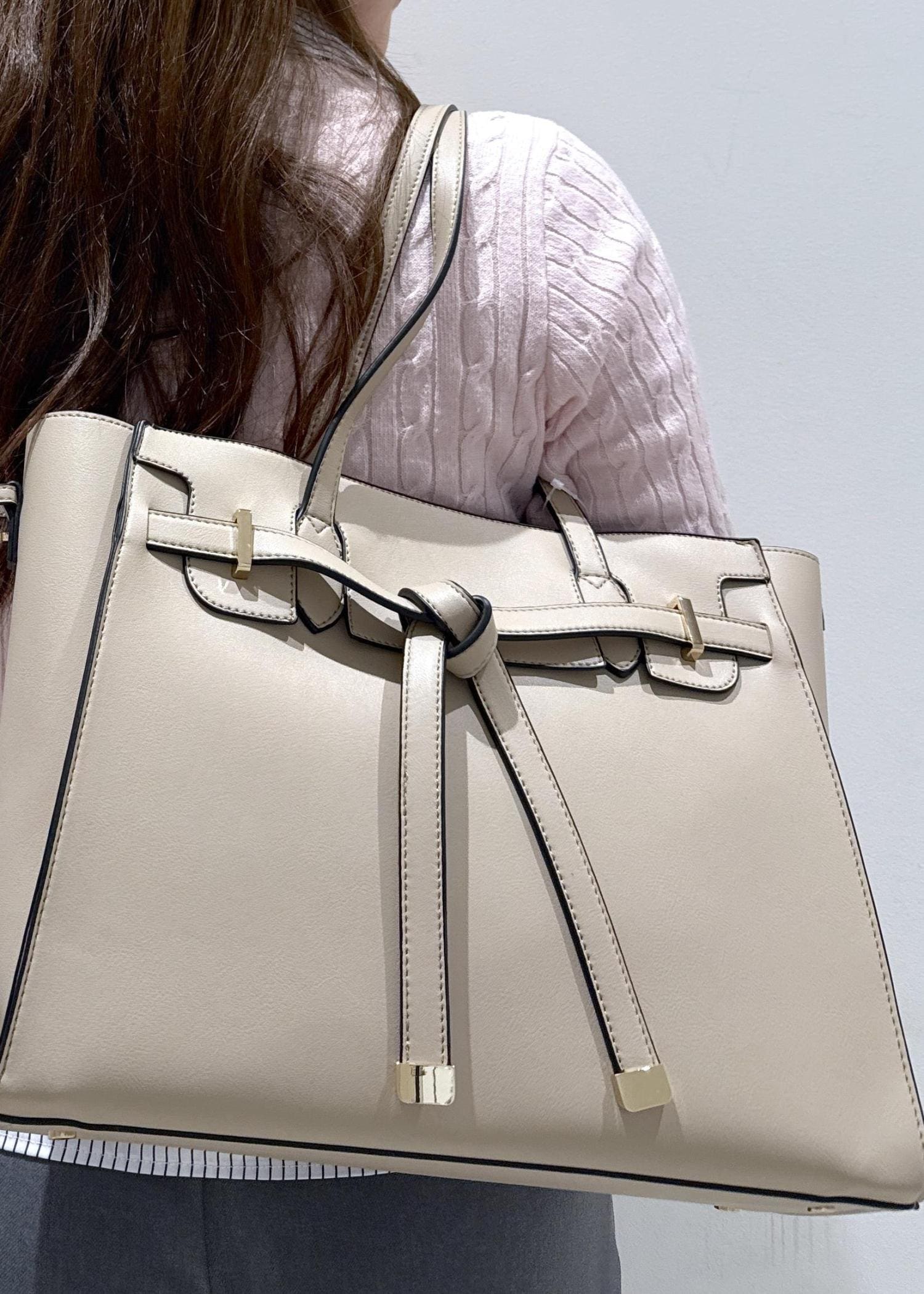 VIS【新色追加】【A4収納】フラップタイトートバッグベージュ系 / F¥7,909レビューリボン付きのトートバッグ⭐︎見た目が可愛いのはもちろん、ファスナー付きのバッグで内側にポケットが付いており、物もたくさん入ります!大きさ的にお仕事用で使えるタイプなので、A4サイズのノートやファイル、13インチのノートパソコンやiPadが入ります。