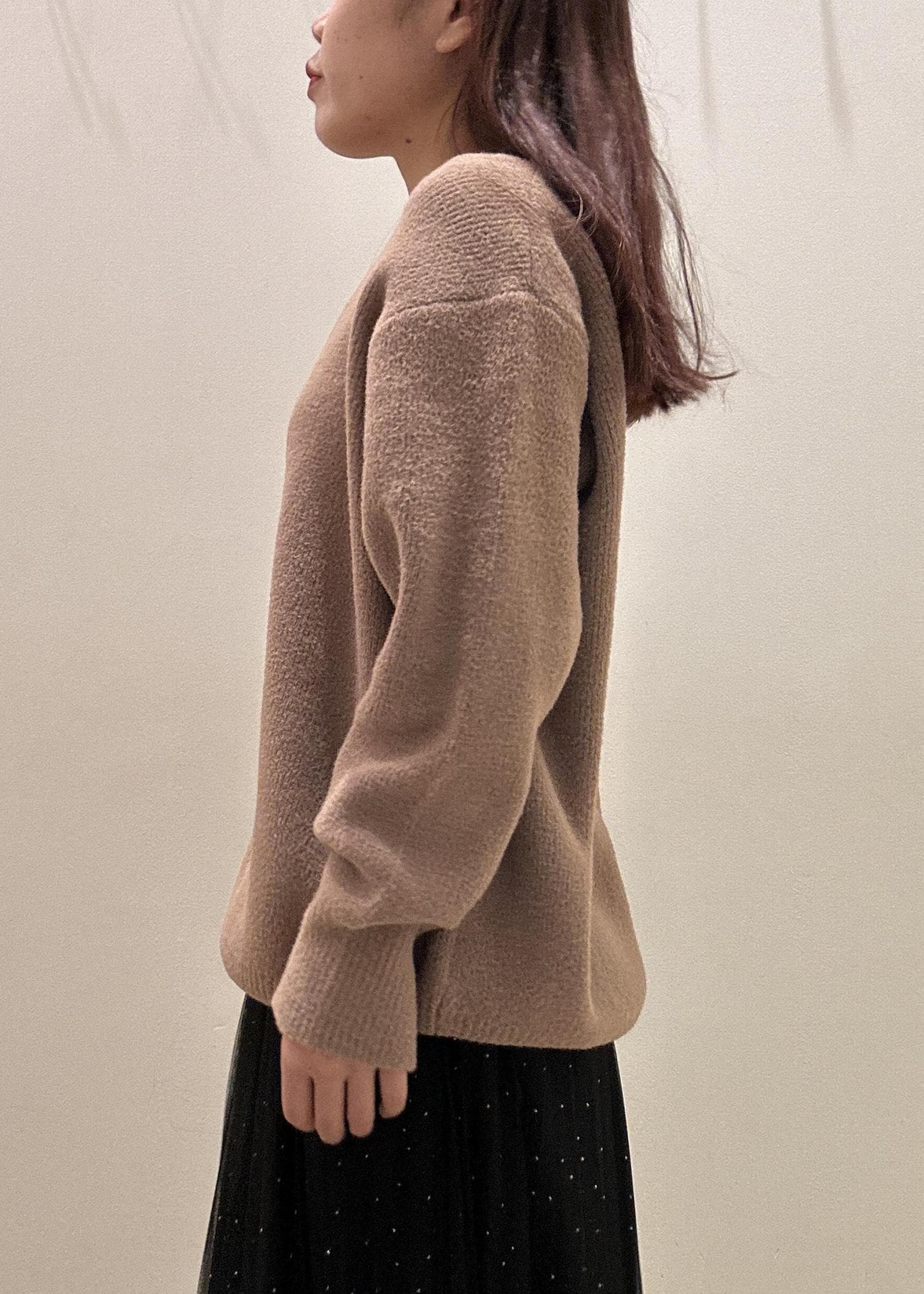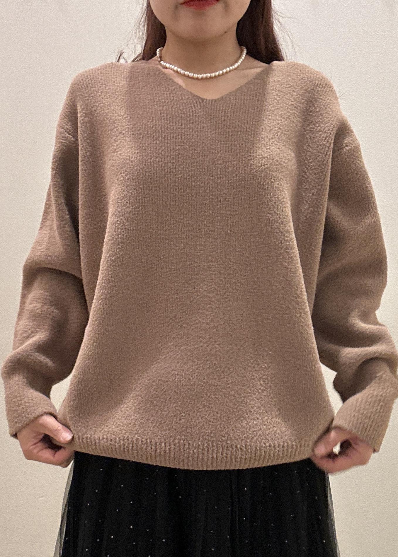 ゆったりとしたサイズ感ですが、Vネックは胸元まで見えることはなく1枚でも安心して着れます。