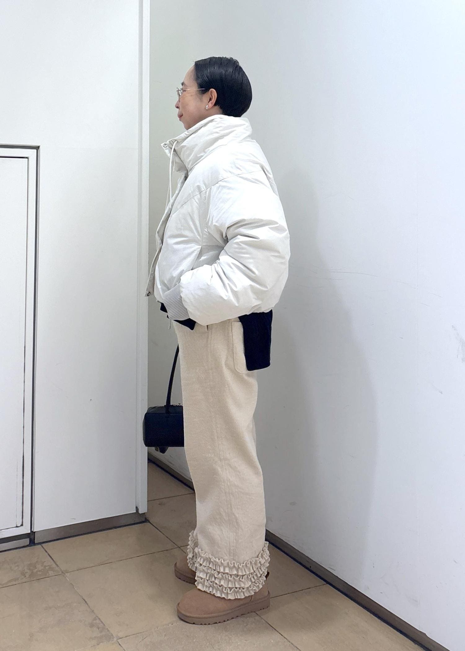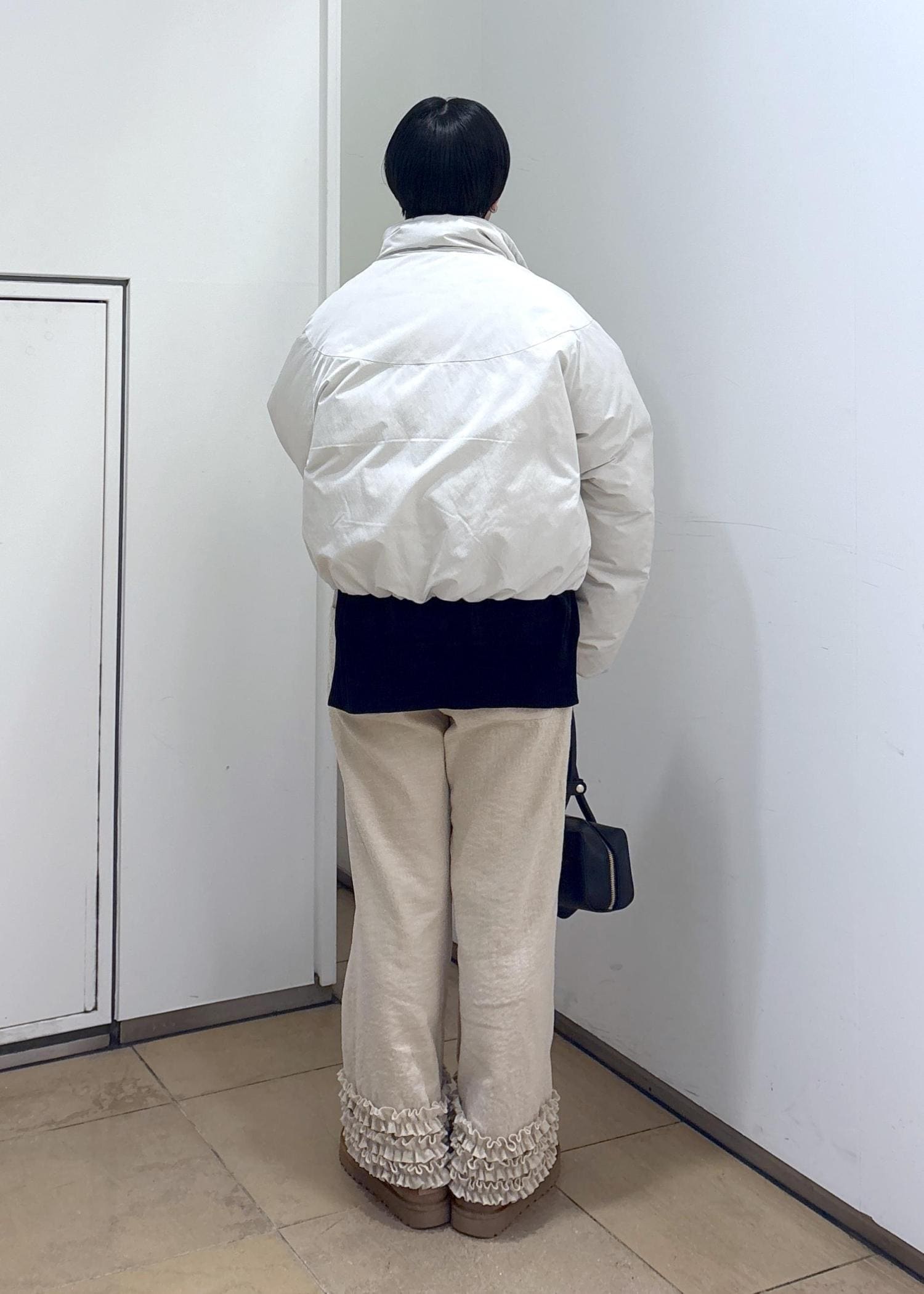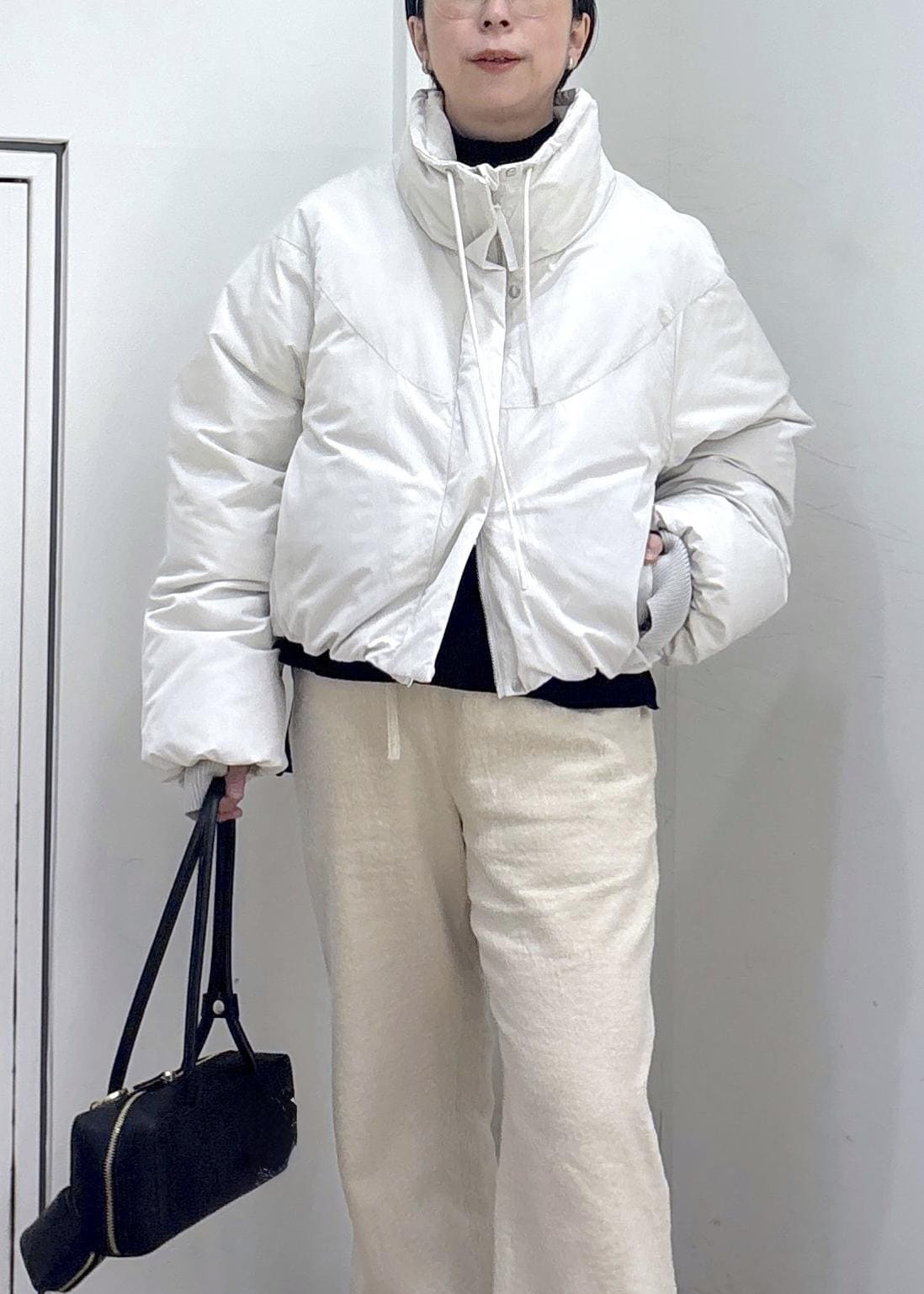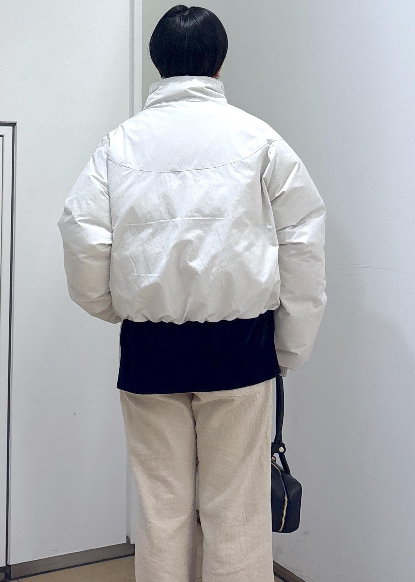 SALON adam et ropé[GREENDOWN(グリーンダウン)]クロップドダウンブルゾン/ 撥水加工オフホワイト / F¥45,100レビュー身頃、アームはかなりゆったりめでインナーにニットやスウェットも楽々着込めるサイズ感です。着丈は154cmで腰にかかるくらいのコンパクト丈ですっきり着られます。