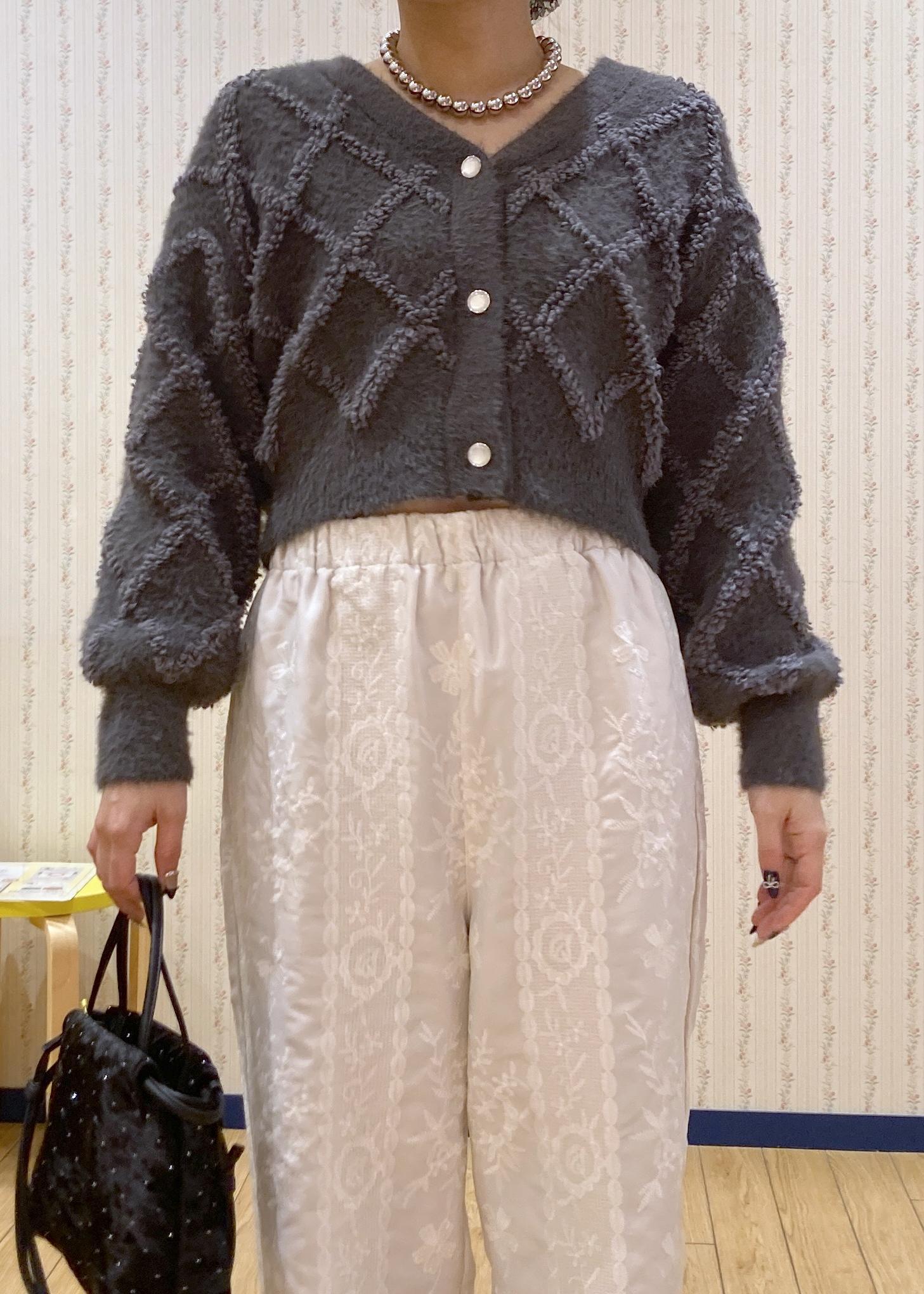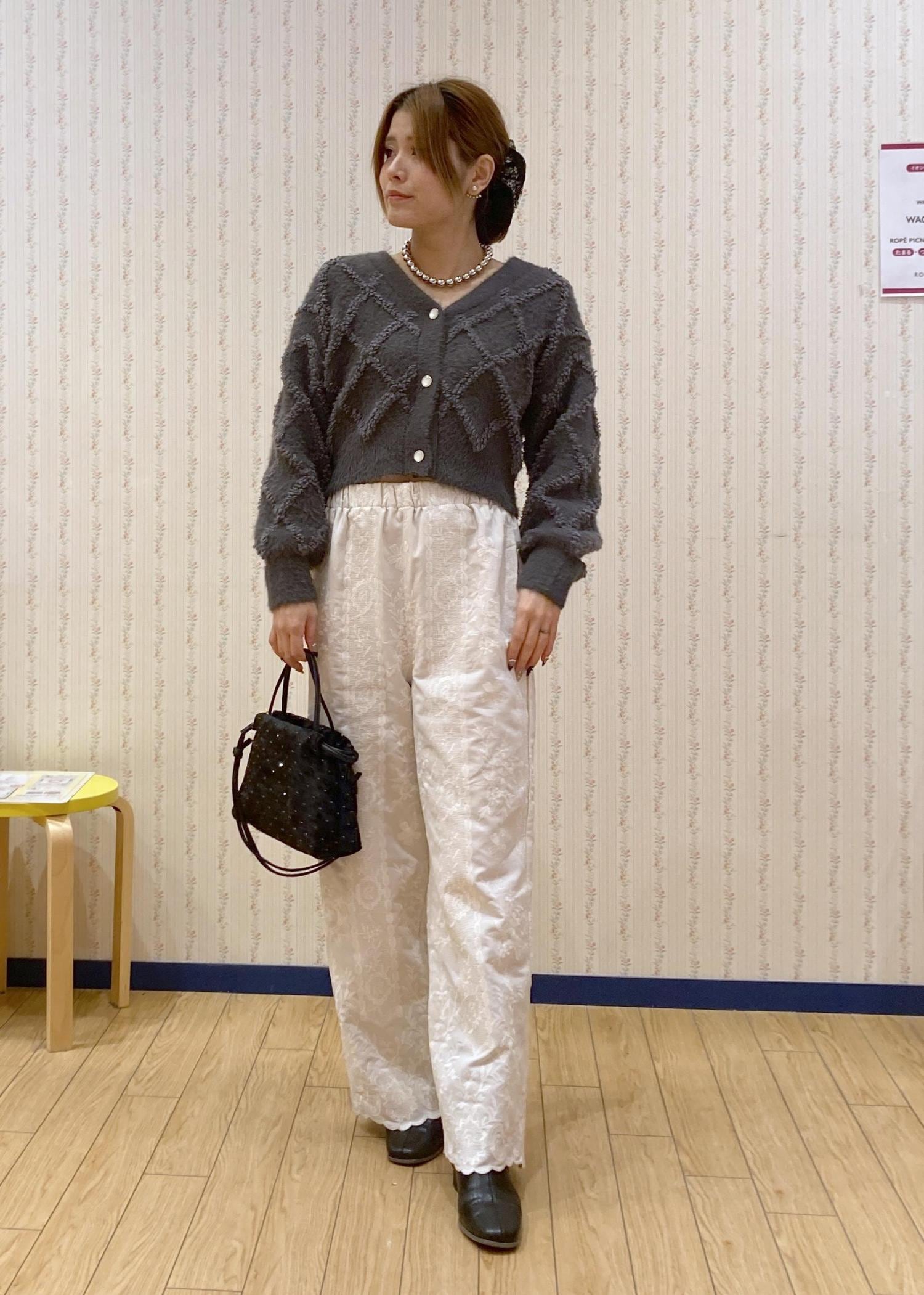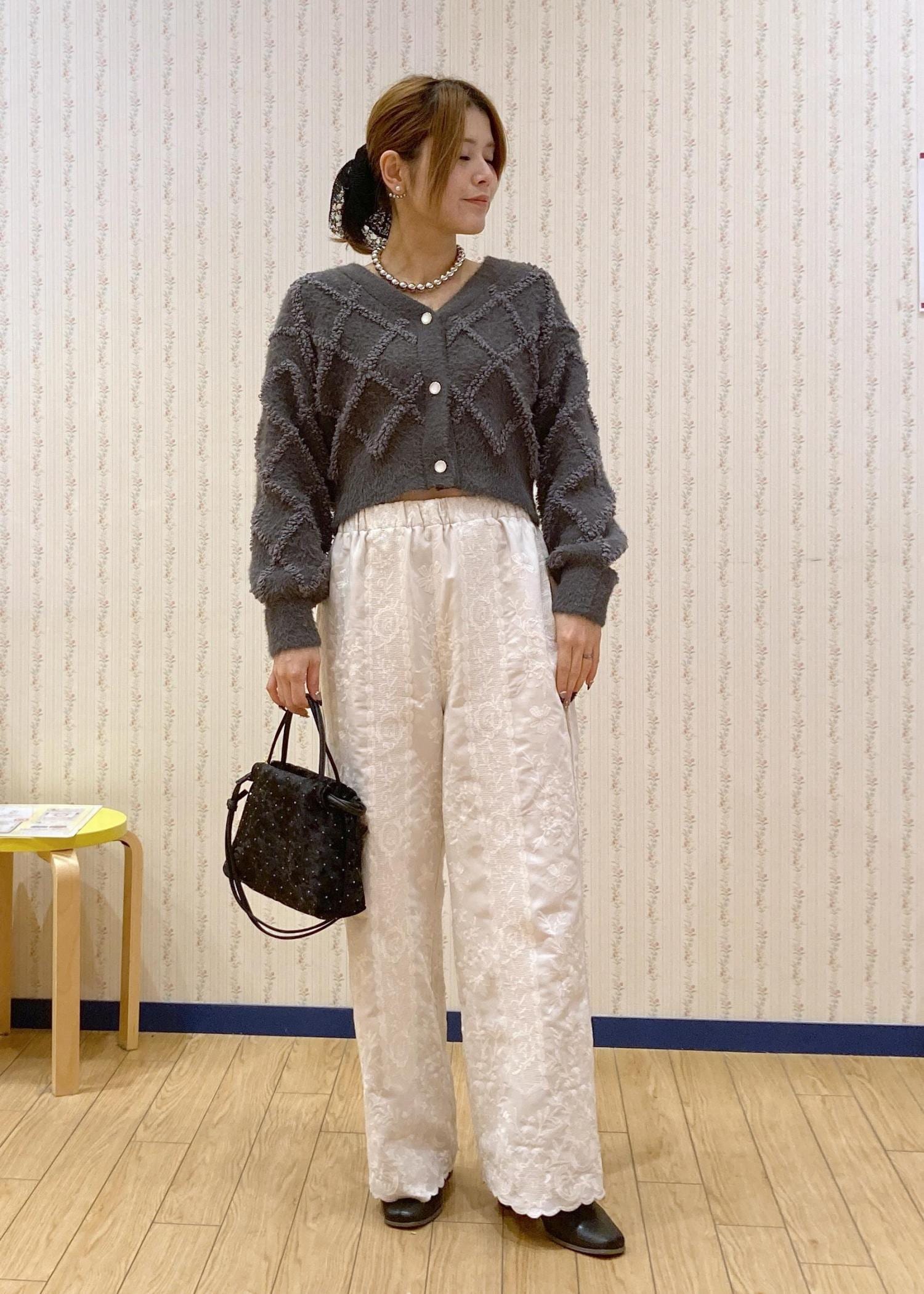 ダイヤチェック柄のショート丈カーディガンに刺繍パンツを合わせた柄×柄コーディネートです。
