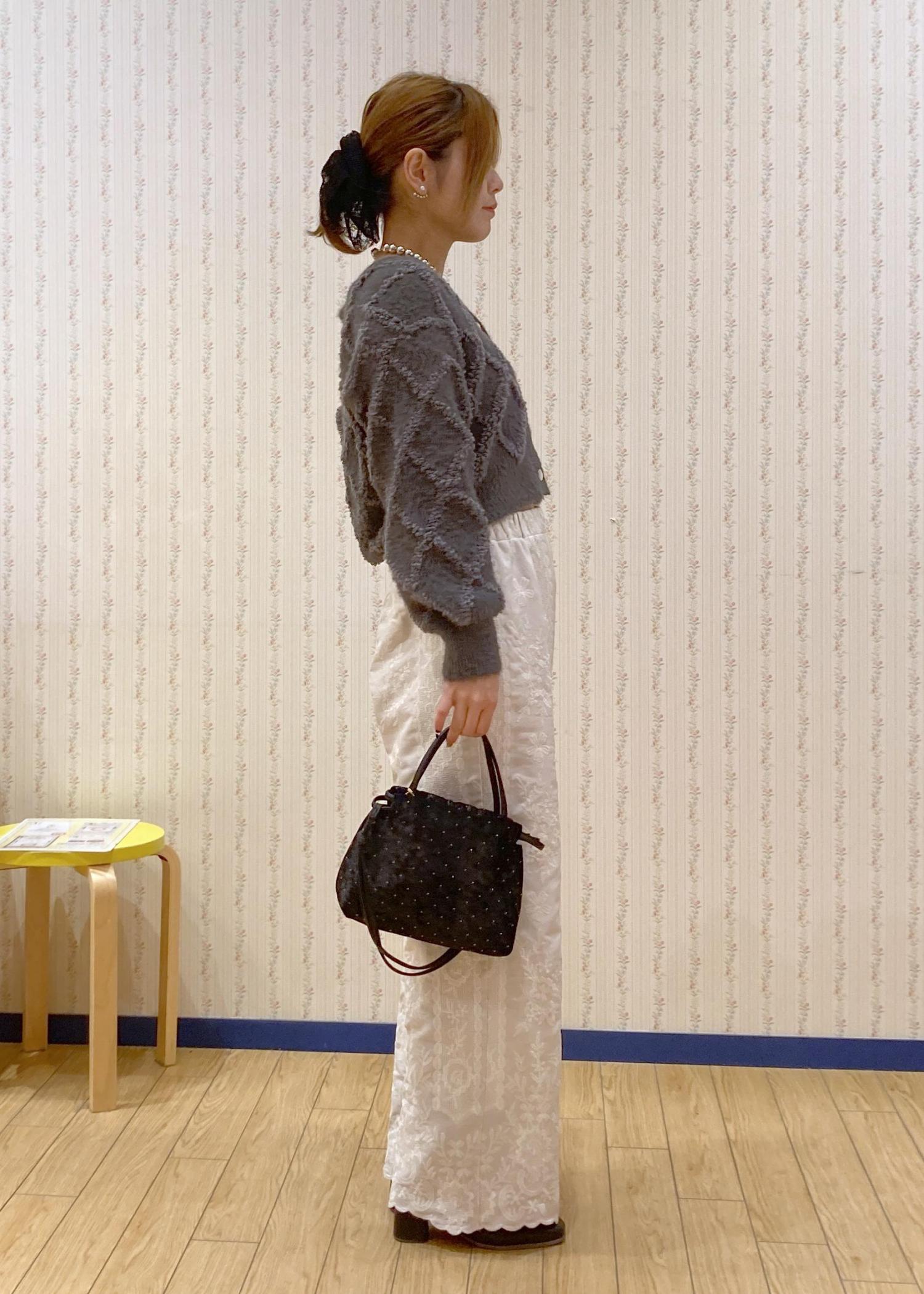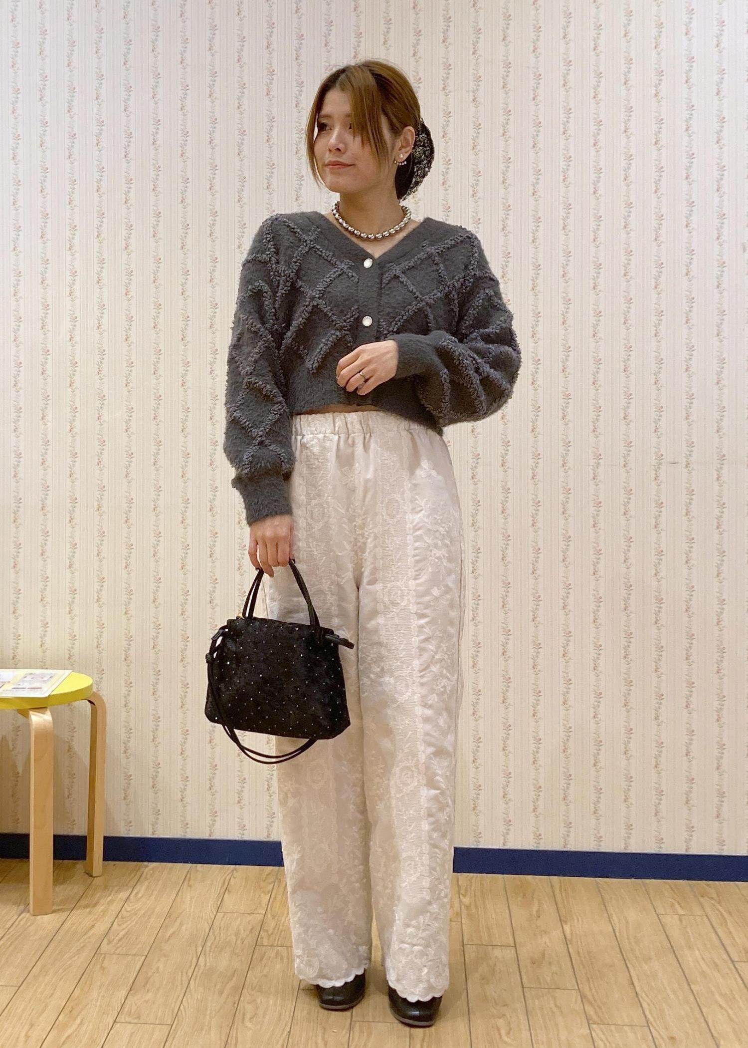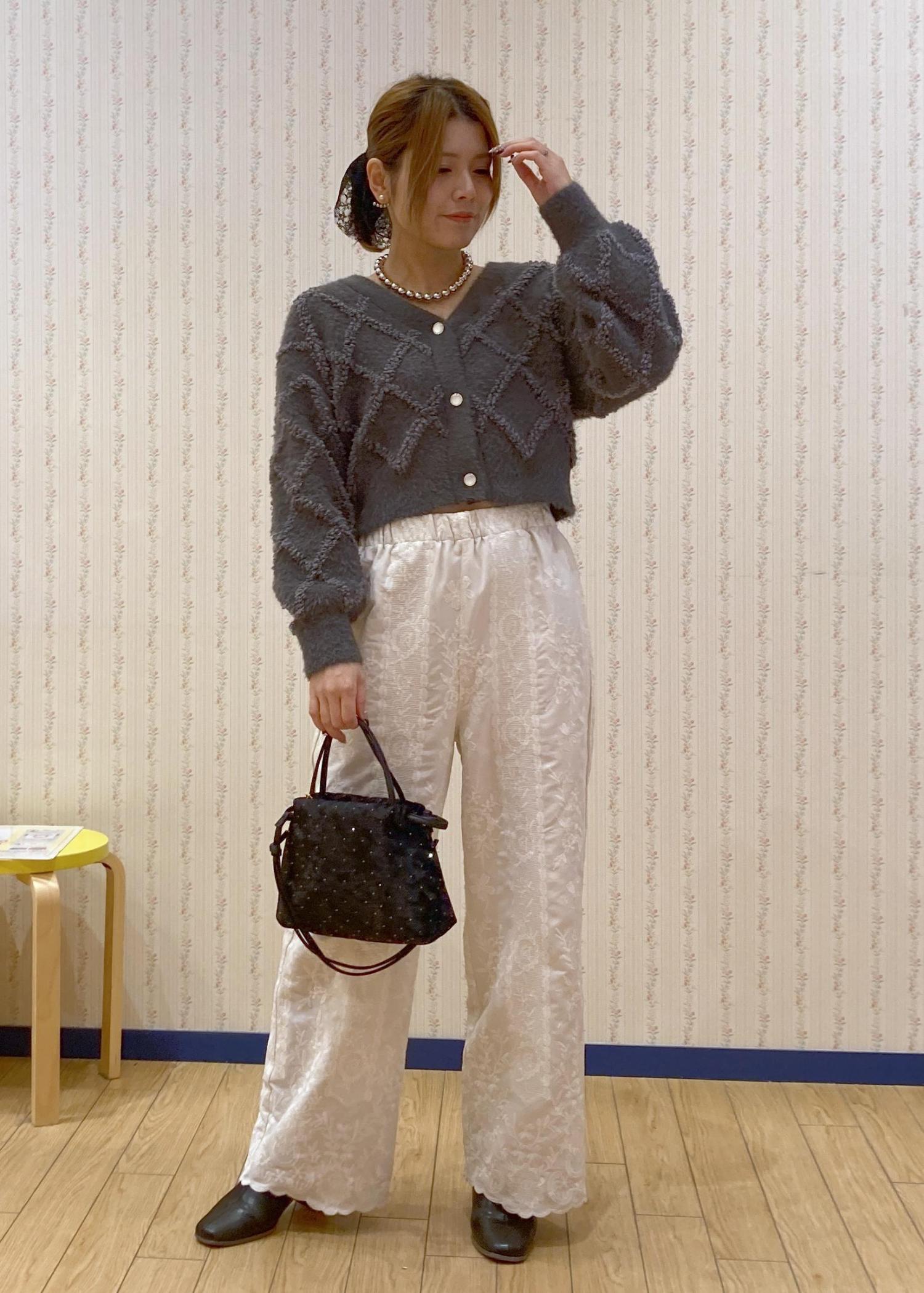 ダイヤチェック柄のショート丈カーディガンに刺繍パンツを合わせた柄×柄コーディネートです。