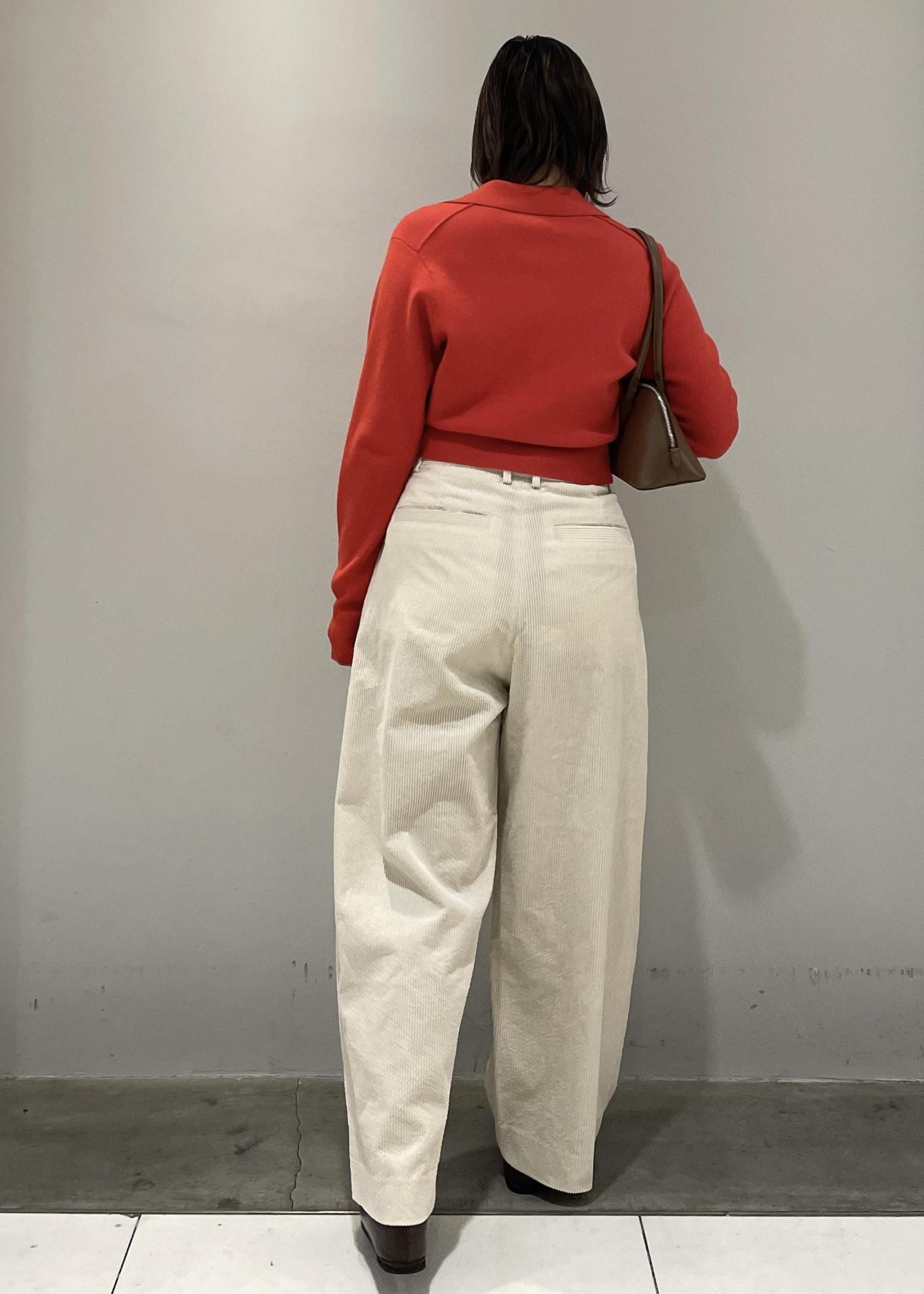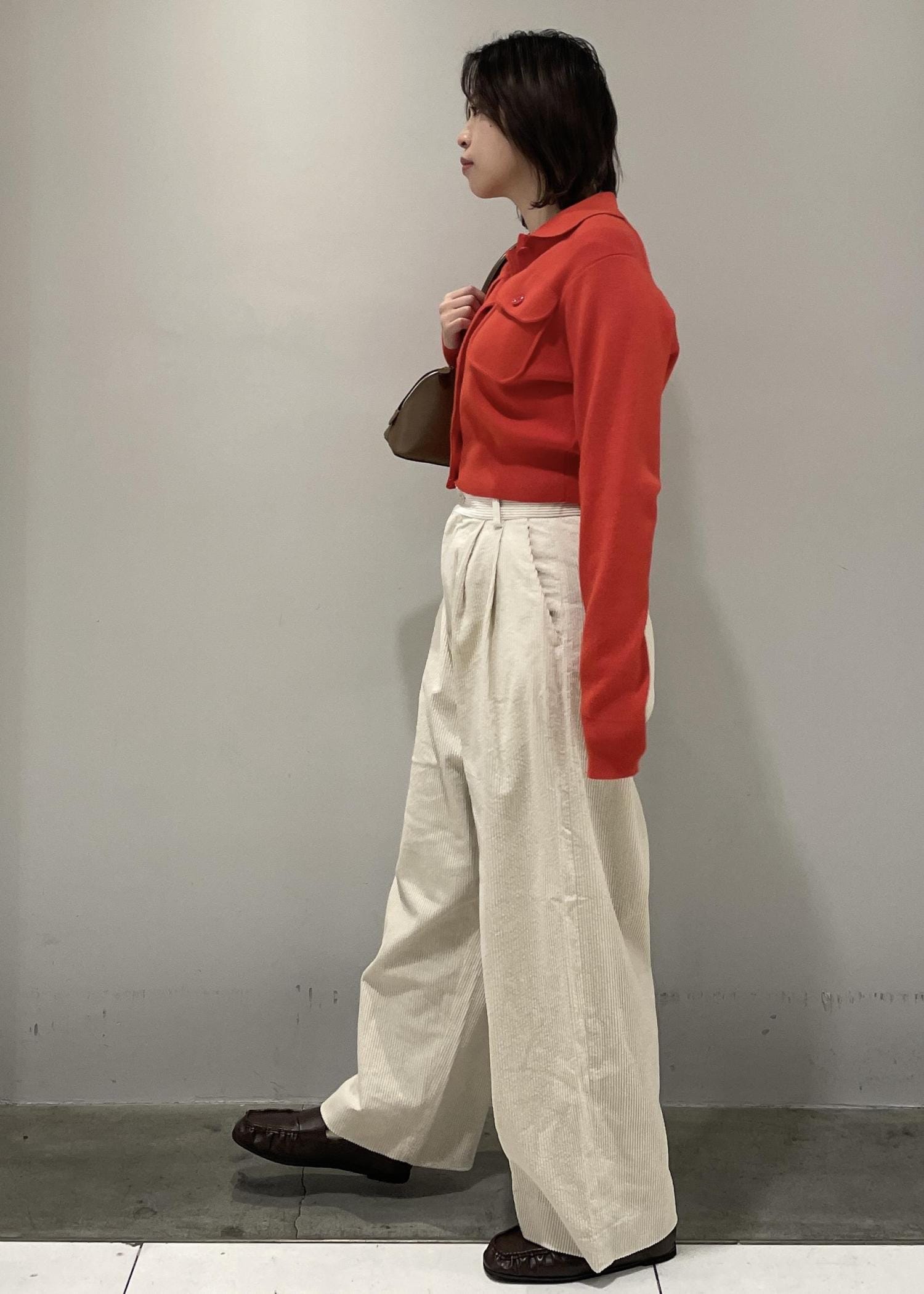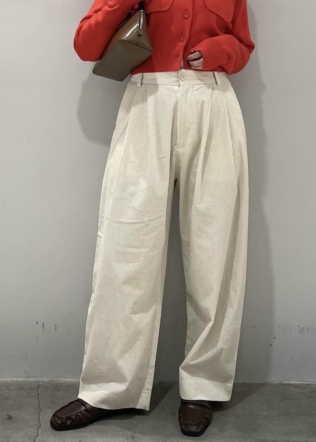 トップスがぴったりした女性らしいデザインなので、ボトムスにはワイドなシルエットのコーデュロイパンツをチョイス!