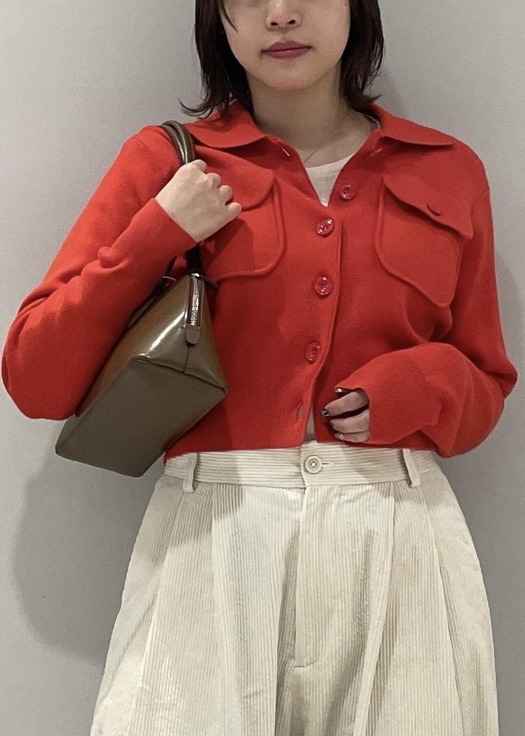 ADAM ET ROPÉ FEMMEコットンカシミヤポケットカーディガンレッド系 / F¥24,200レビューショート丈かつ、ウエスト部分にメリハリができるシルエットなので着るだけでスタイルアップできます◎ボトムスはハイウエストめのものの方が合うかと思います☺︎