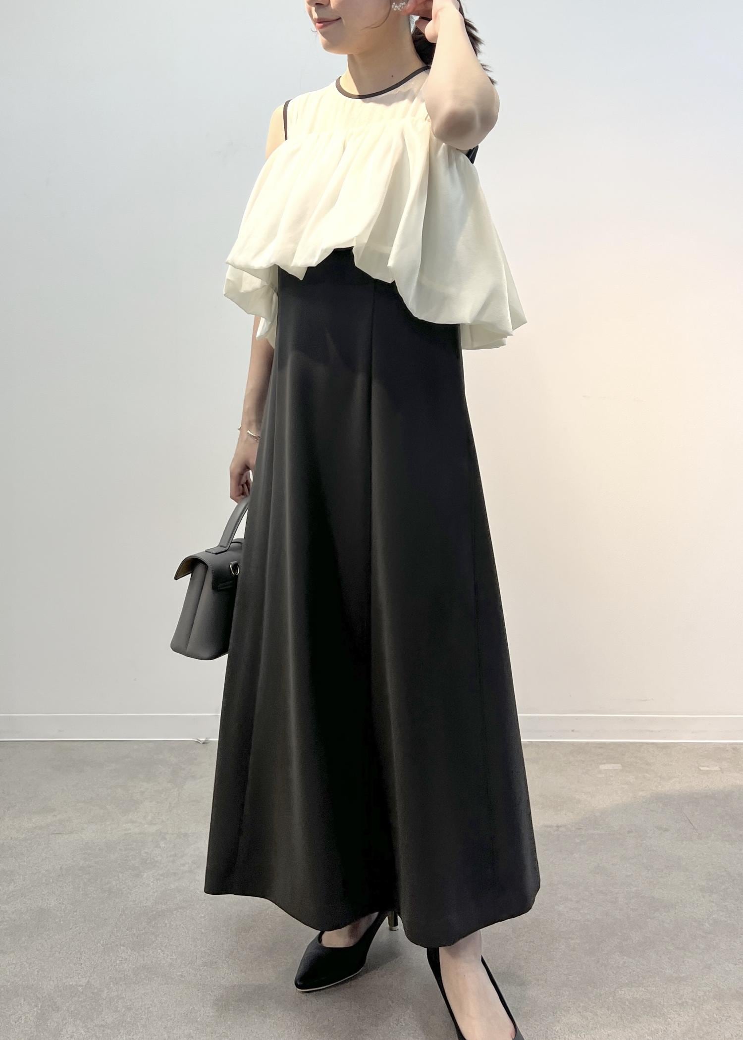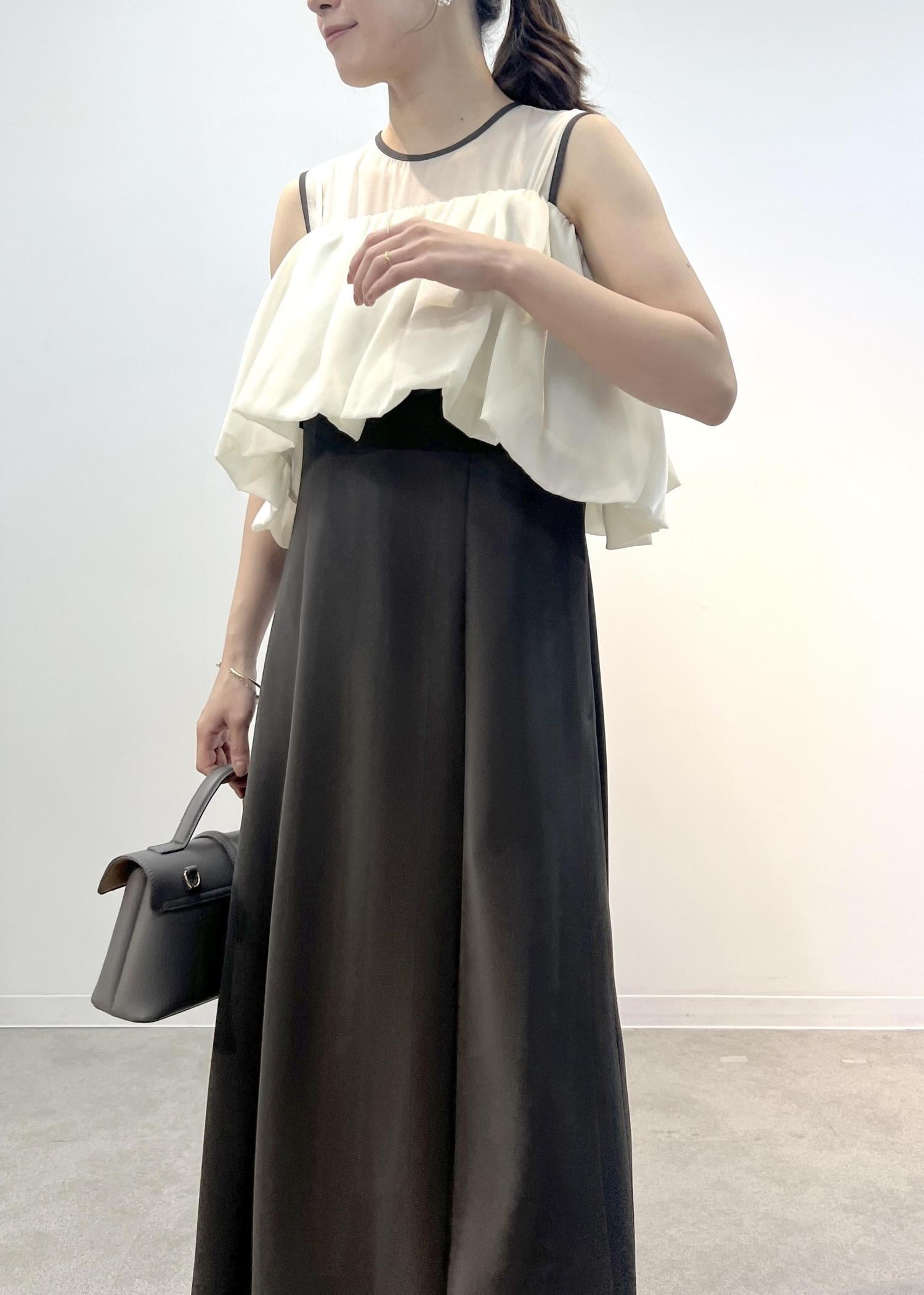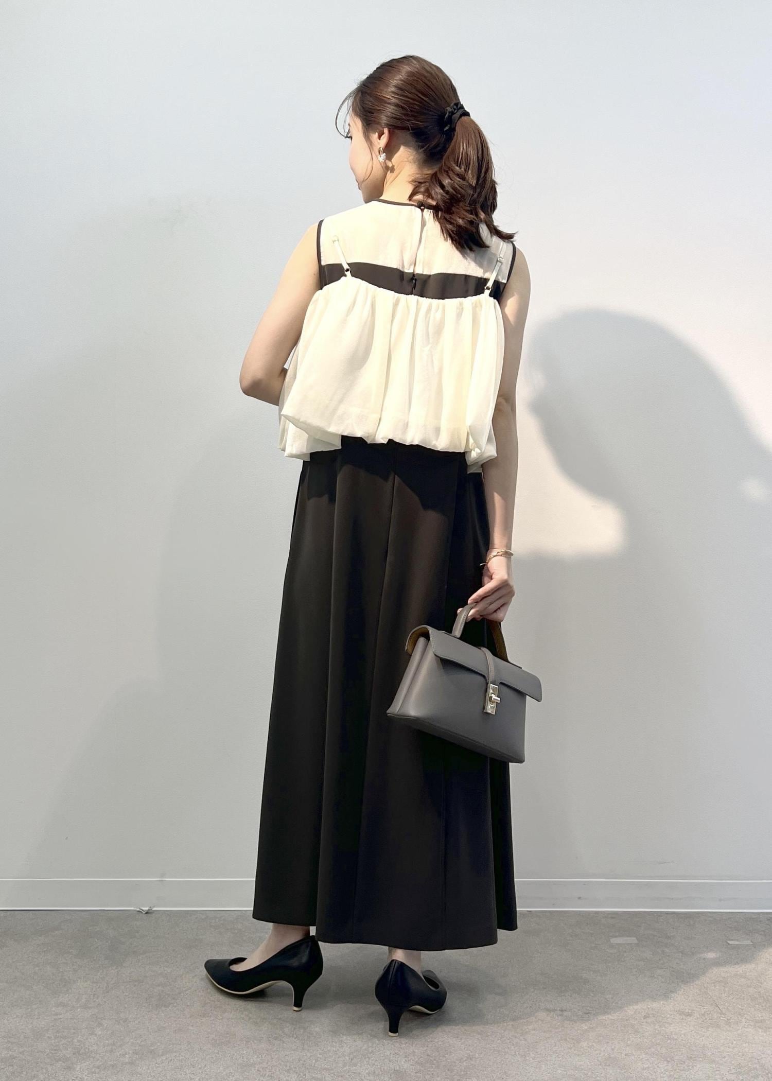 インナーの肩紐が少し透けるので、ベージュ系の目立たないものを着るのがおすすめです。 -