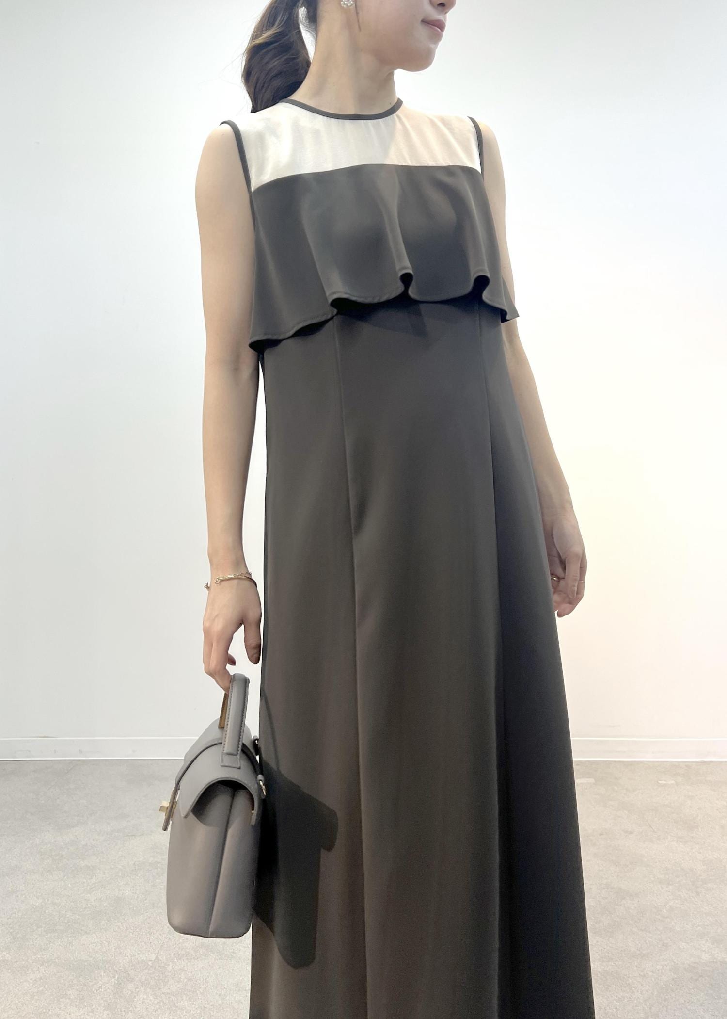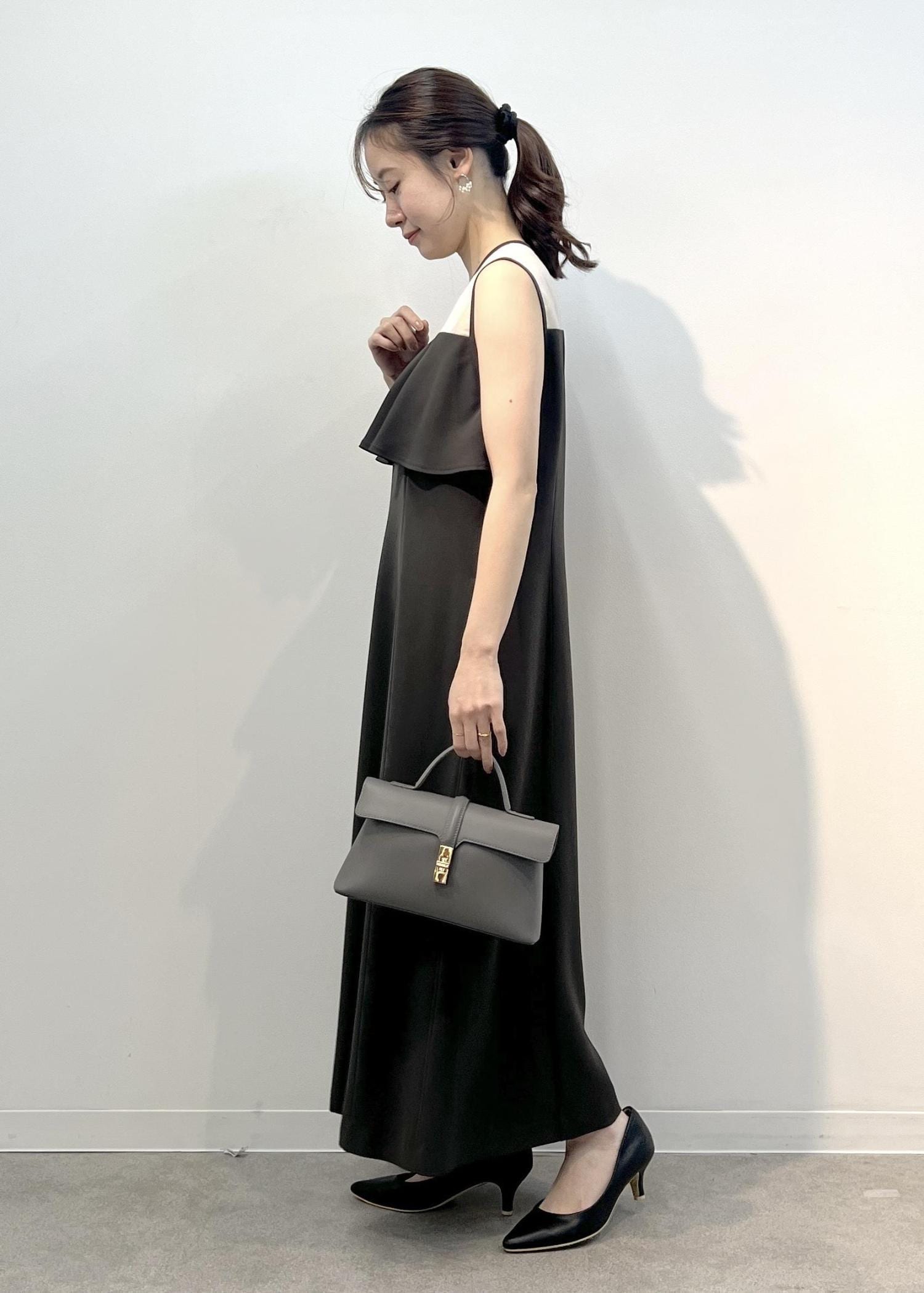 インナーの肩紐が少し透けるので、ベージュ系の目立たないものを着るのがおすすめです。 -