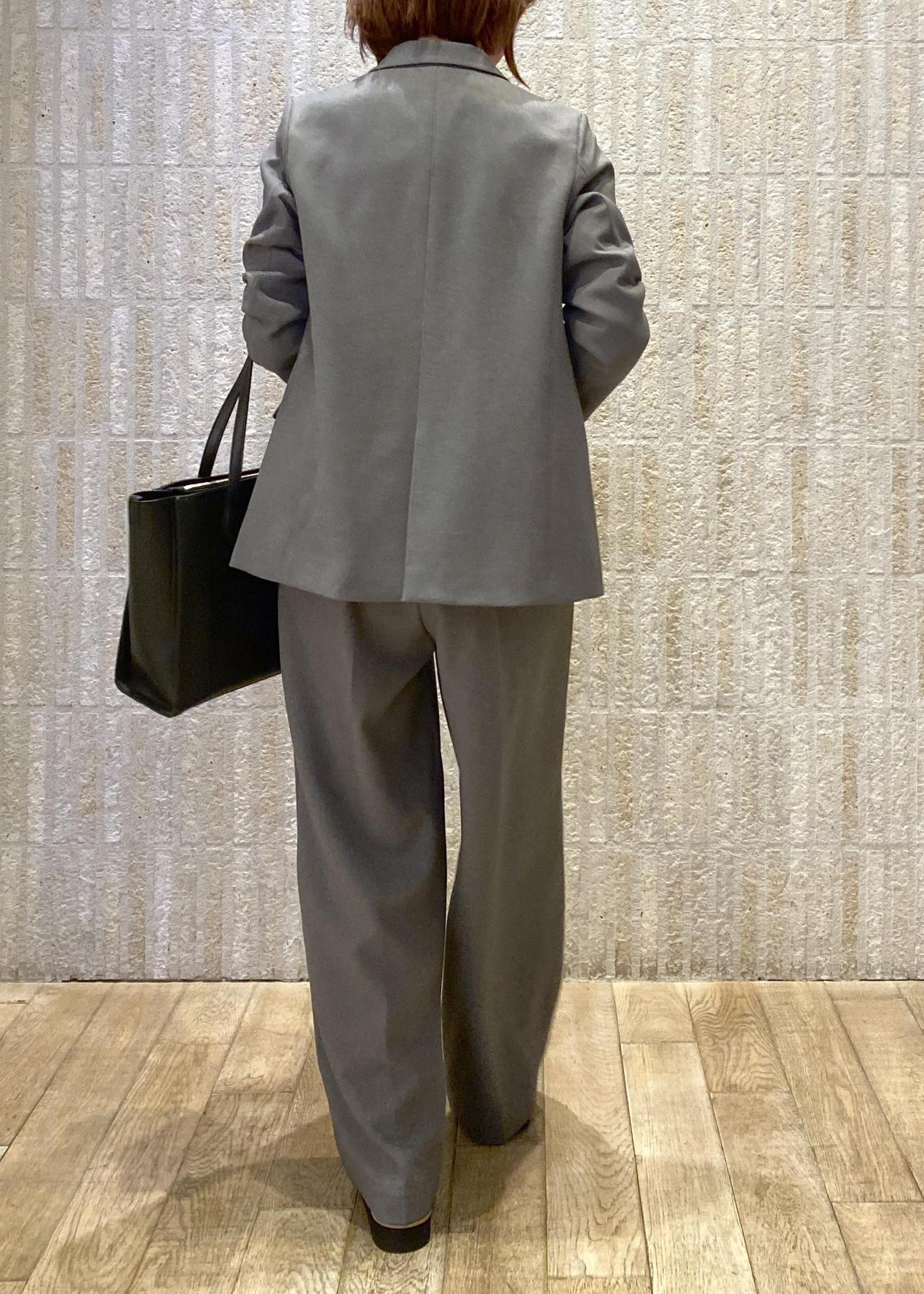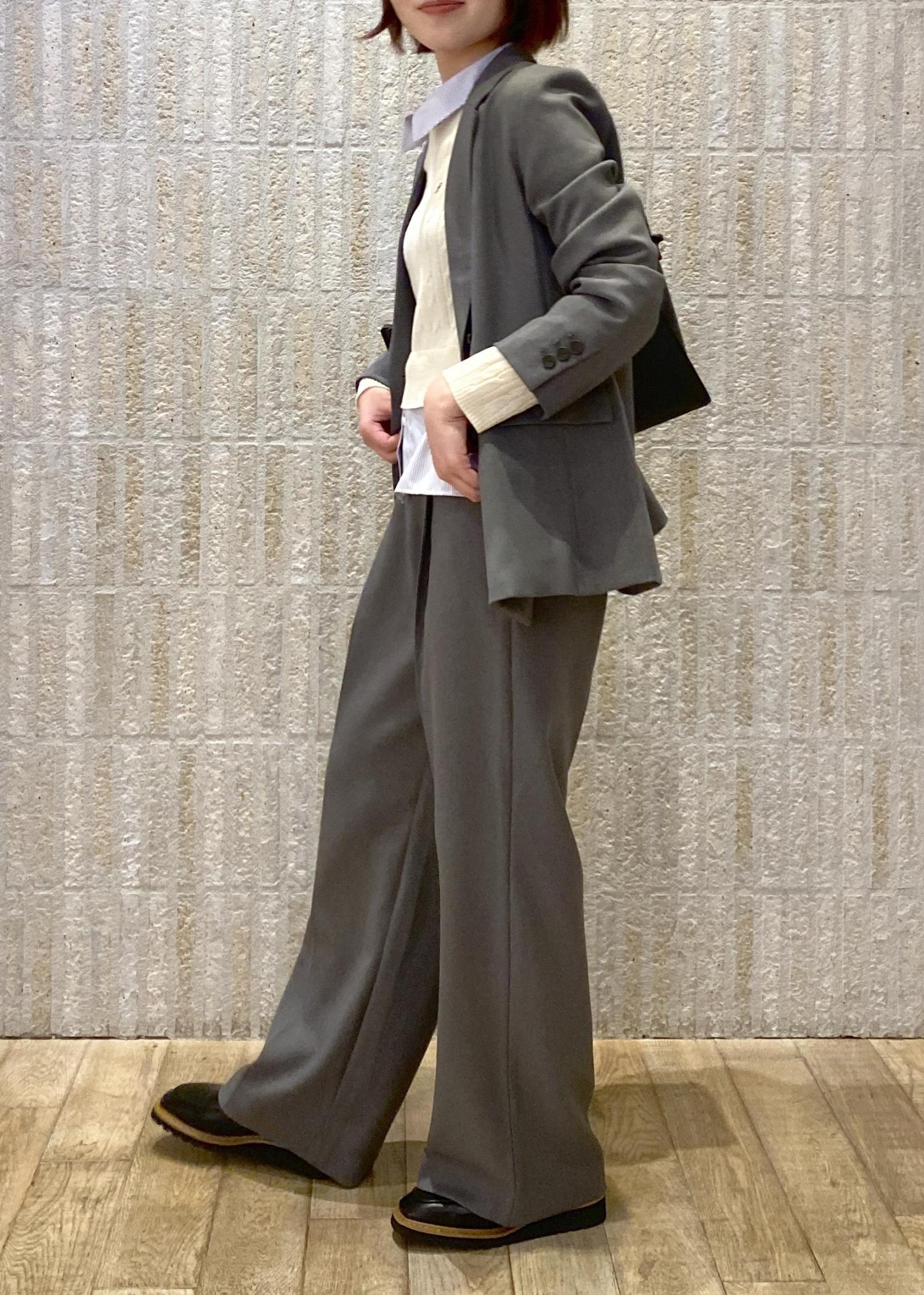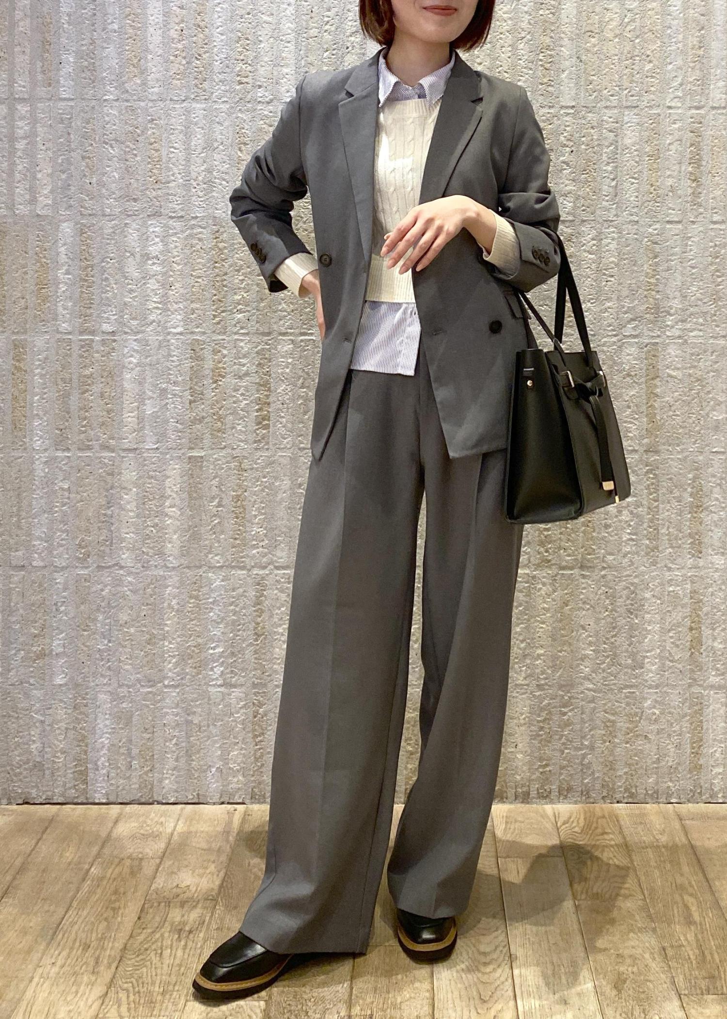 セットアップのジャケットパンツに、1枚でも決まるレイヤード風のトップスを合わせた、通勤スタイルです!