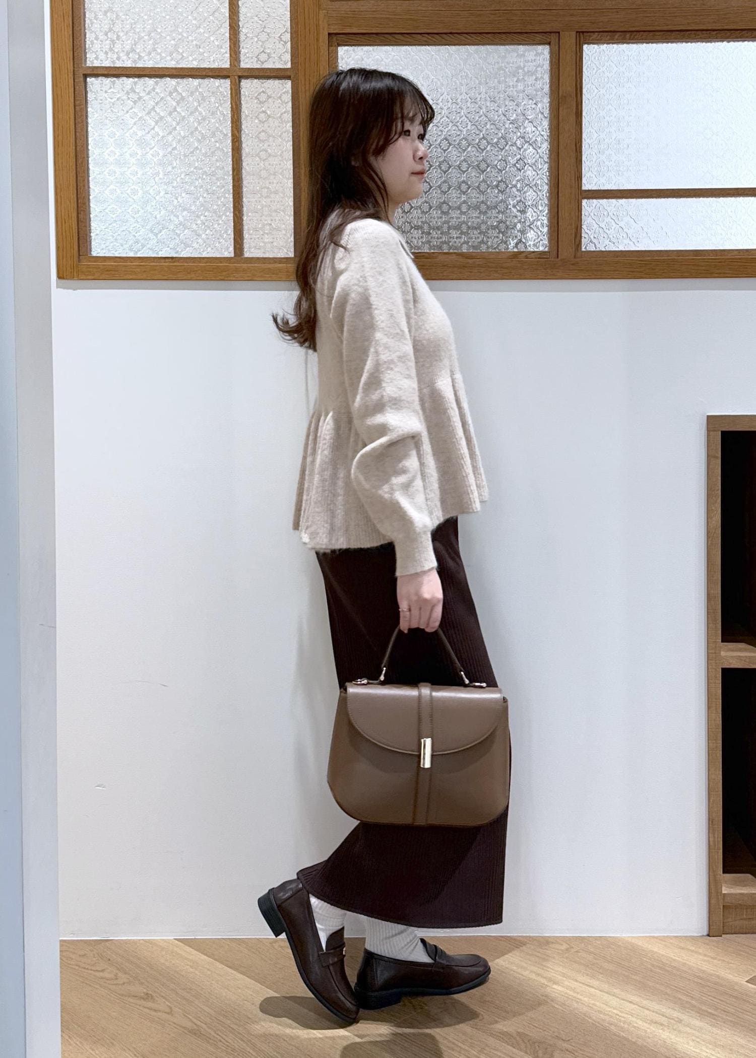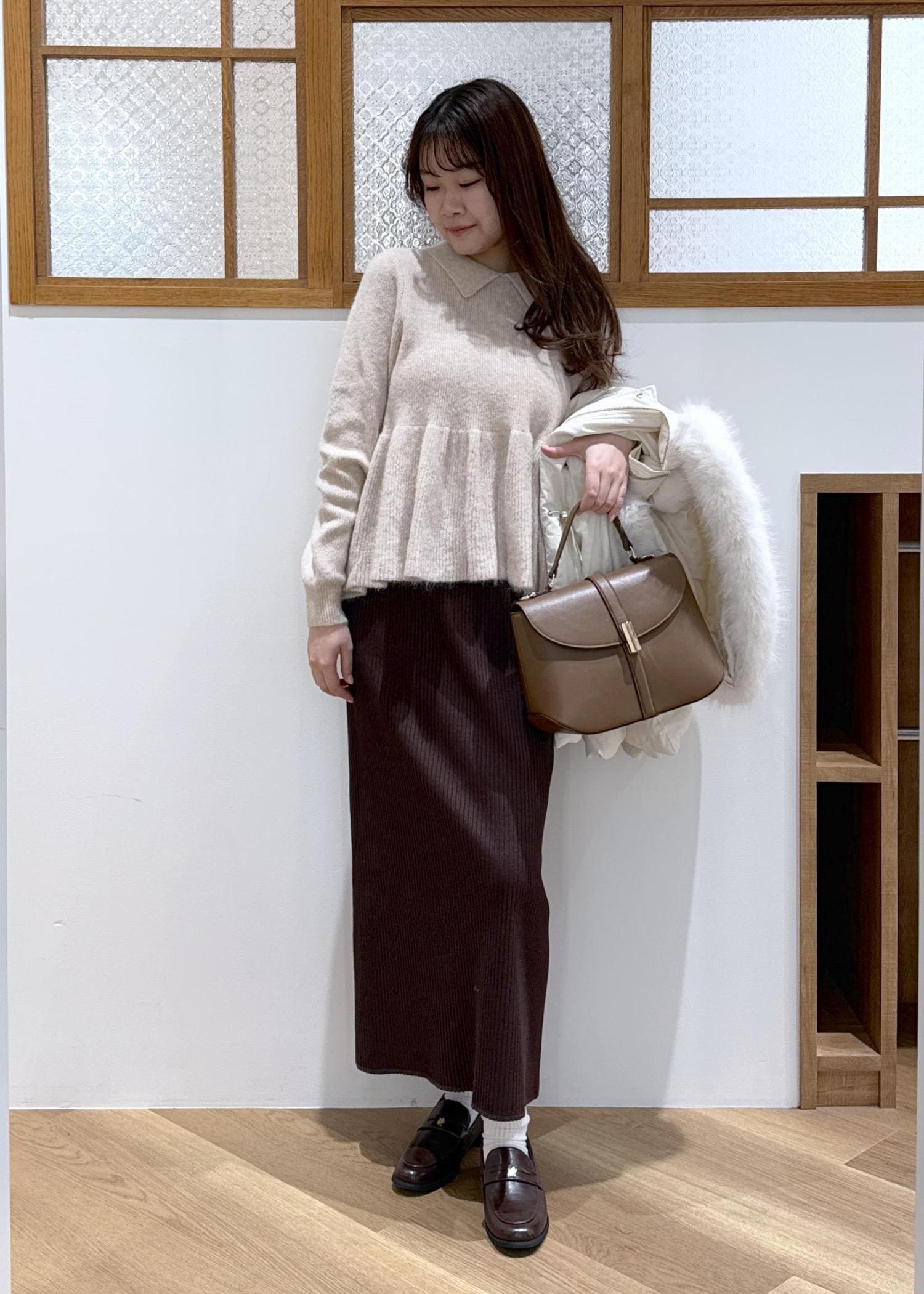 襟付きのニットとローファー合わせで、クラシカルな印象に。