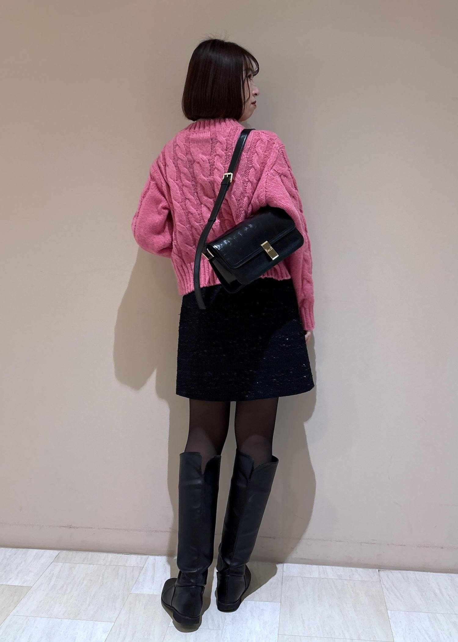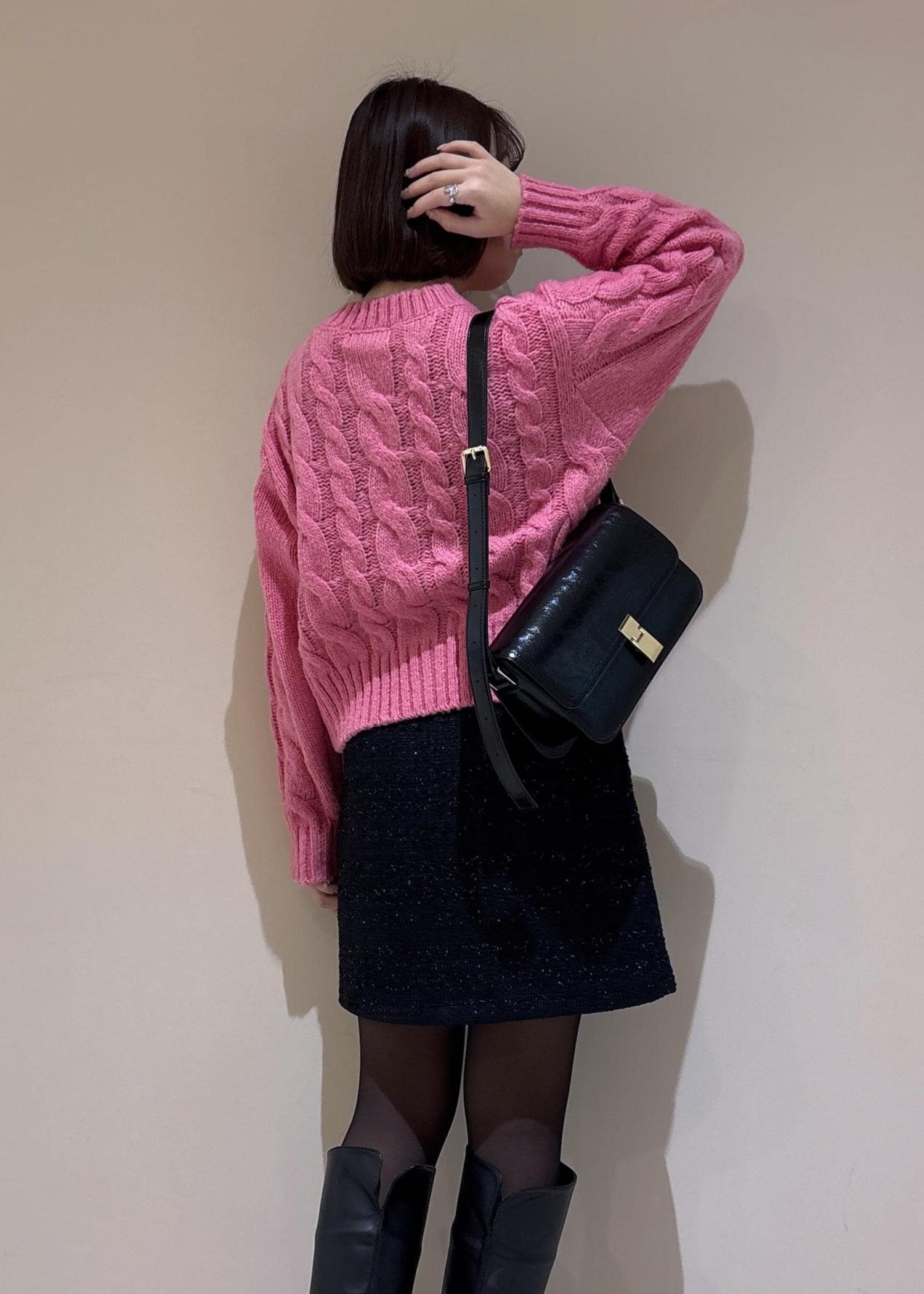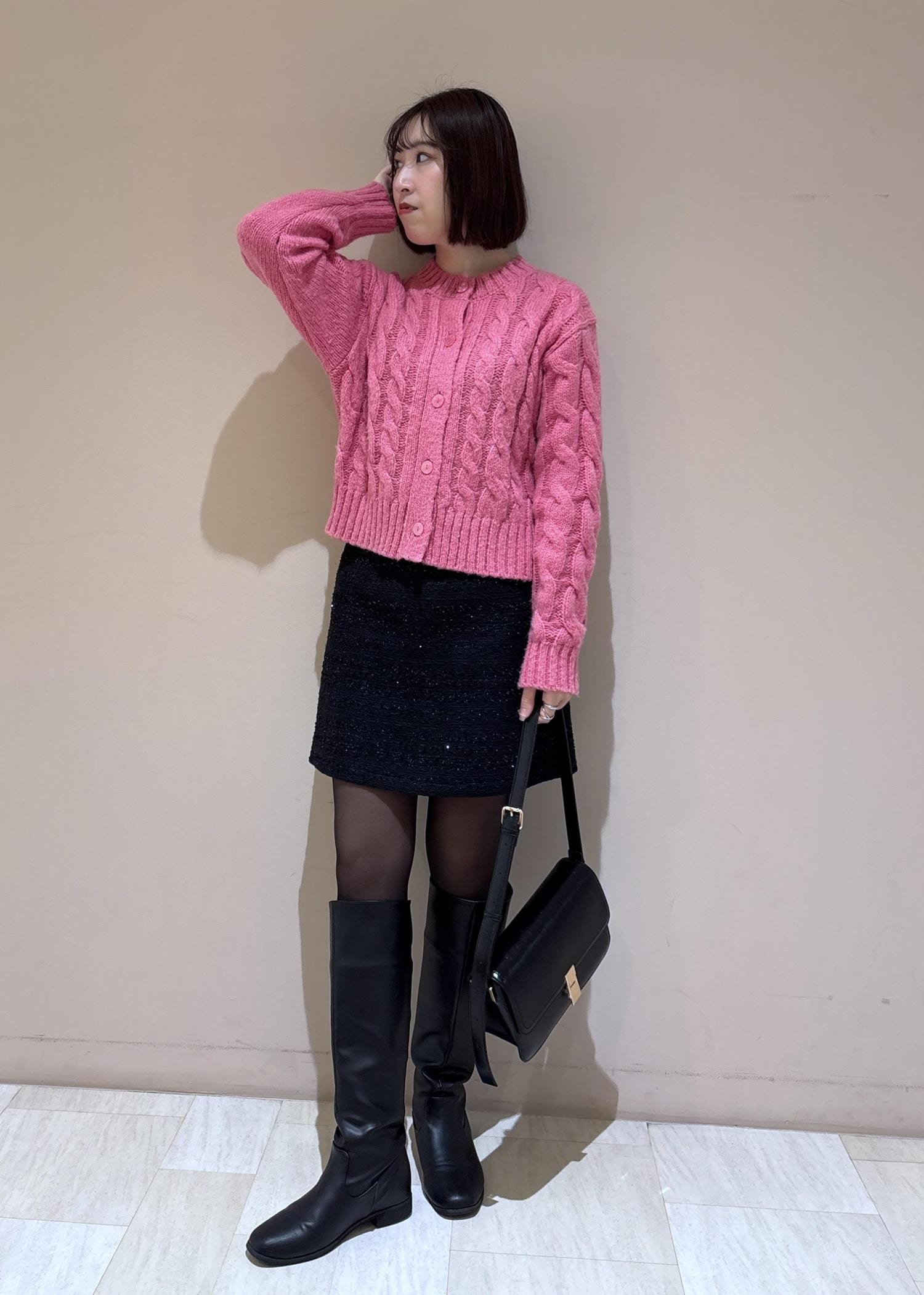 サラッと羽織るだけでもオシャレ感が増す、ローズピンクにツイードスカートを合わせてみました。