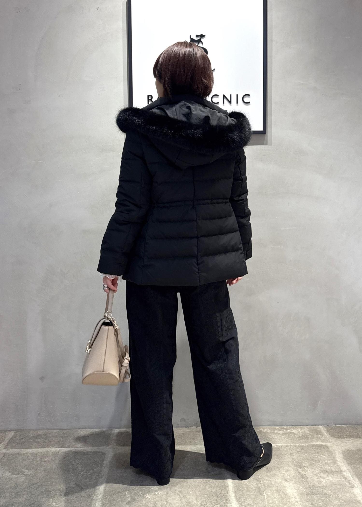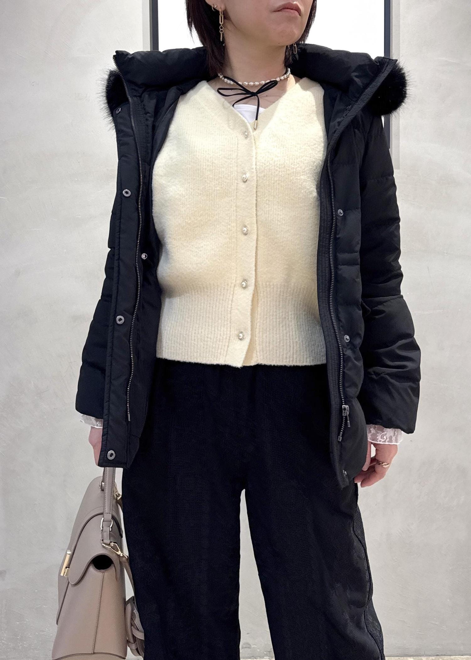 ブラックアウターにやわらかいクリームカラーニットを合わせ、重くなりすぎない冬コーデに⭐︎