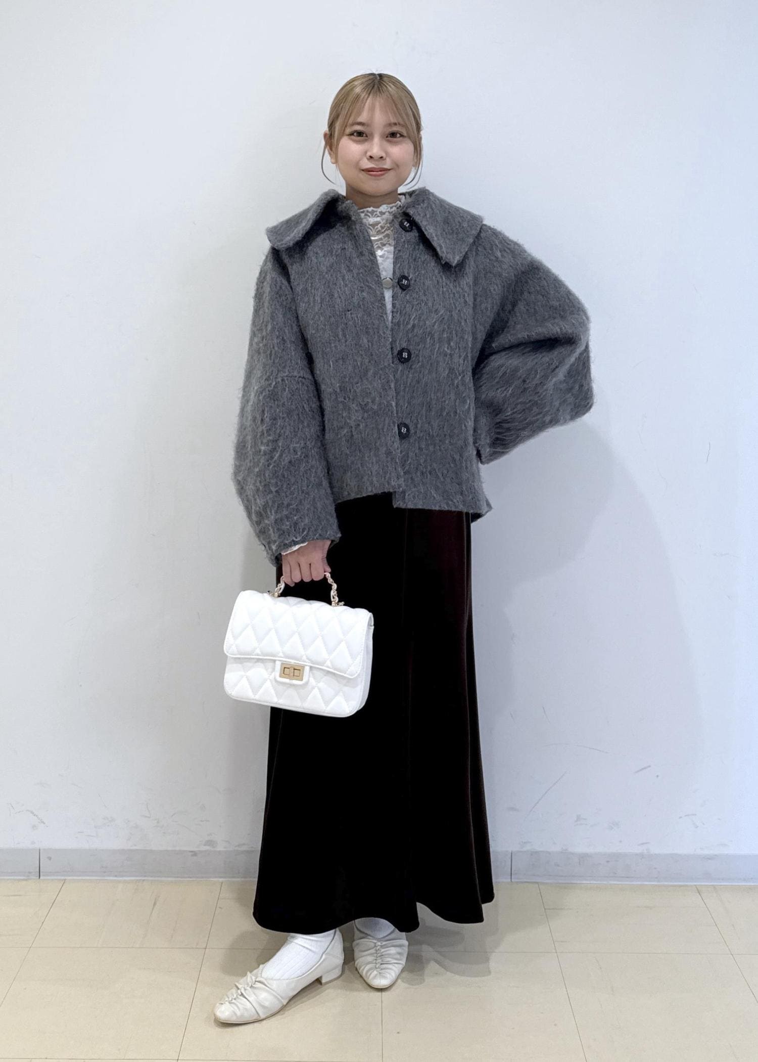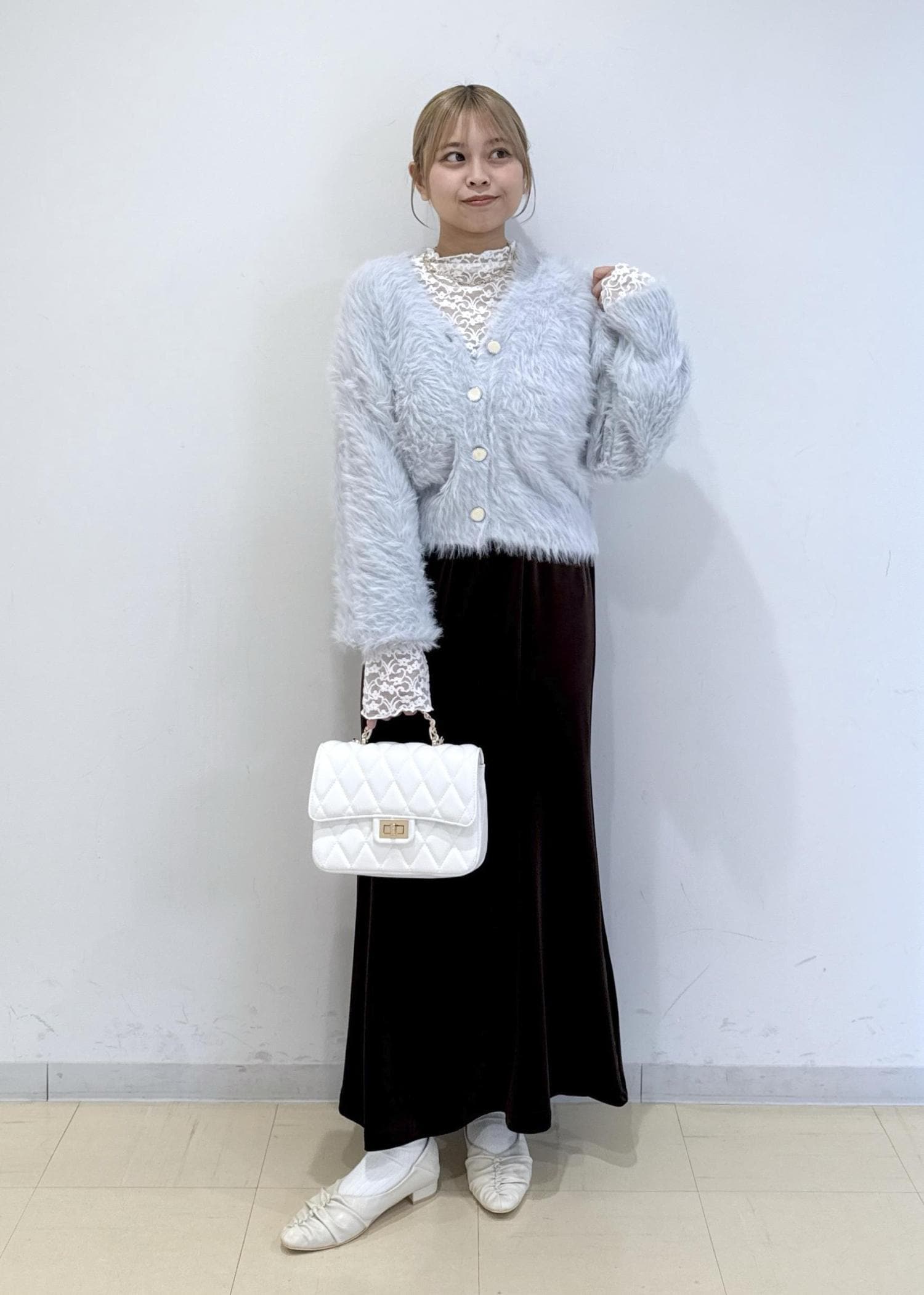 バッグもオフホワイトのキルティングを合わせ、よりフェミニン要素をプラスしました。