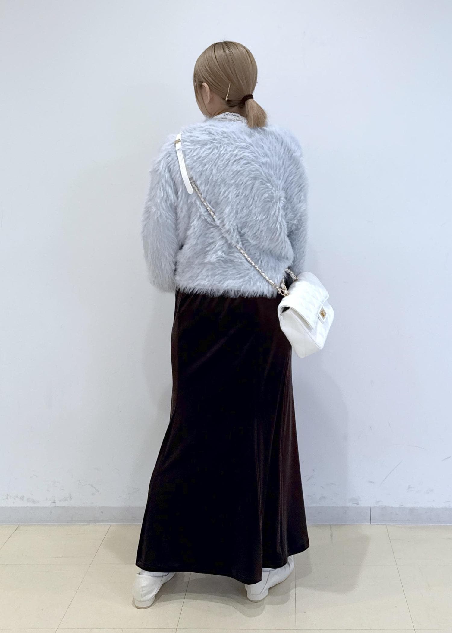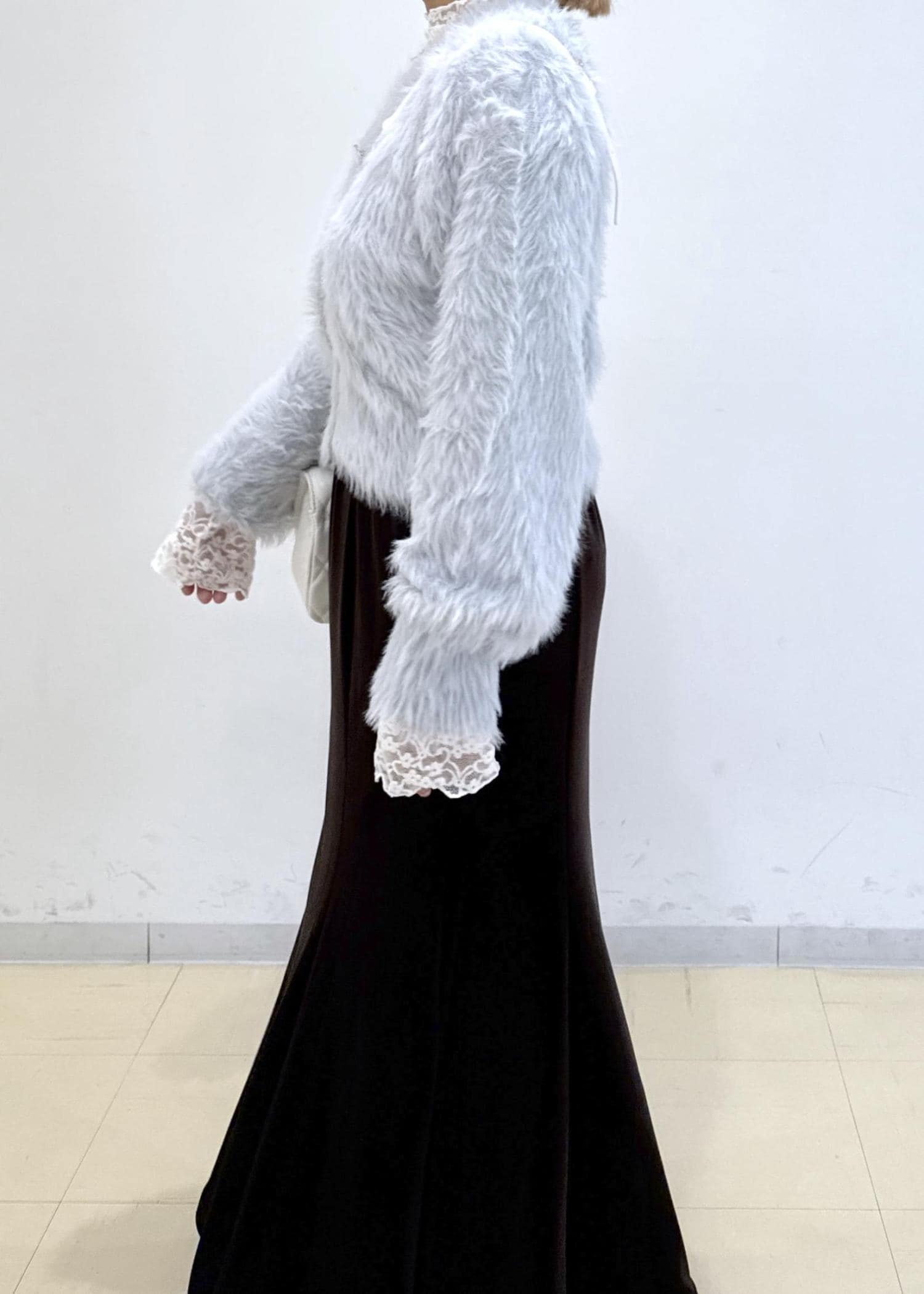 ベロアのマーメイドスカートに、ラビットファーガーデン、インナーにレースを合わせたフェミニンコーデにしました。