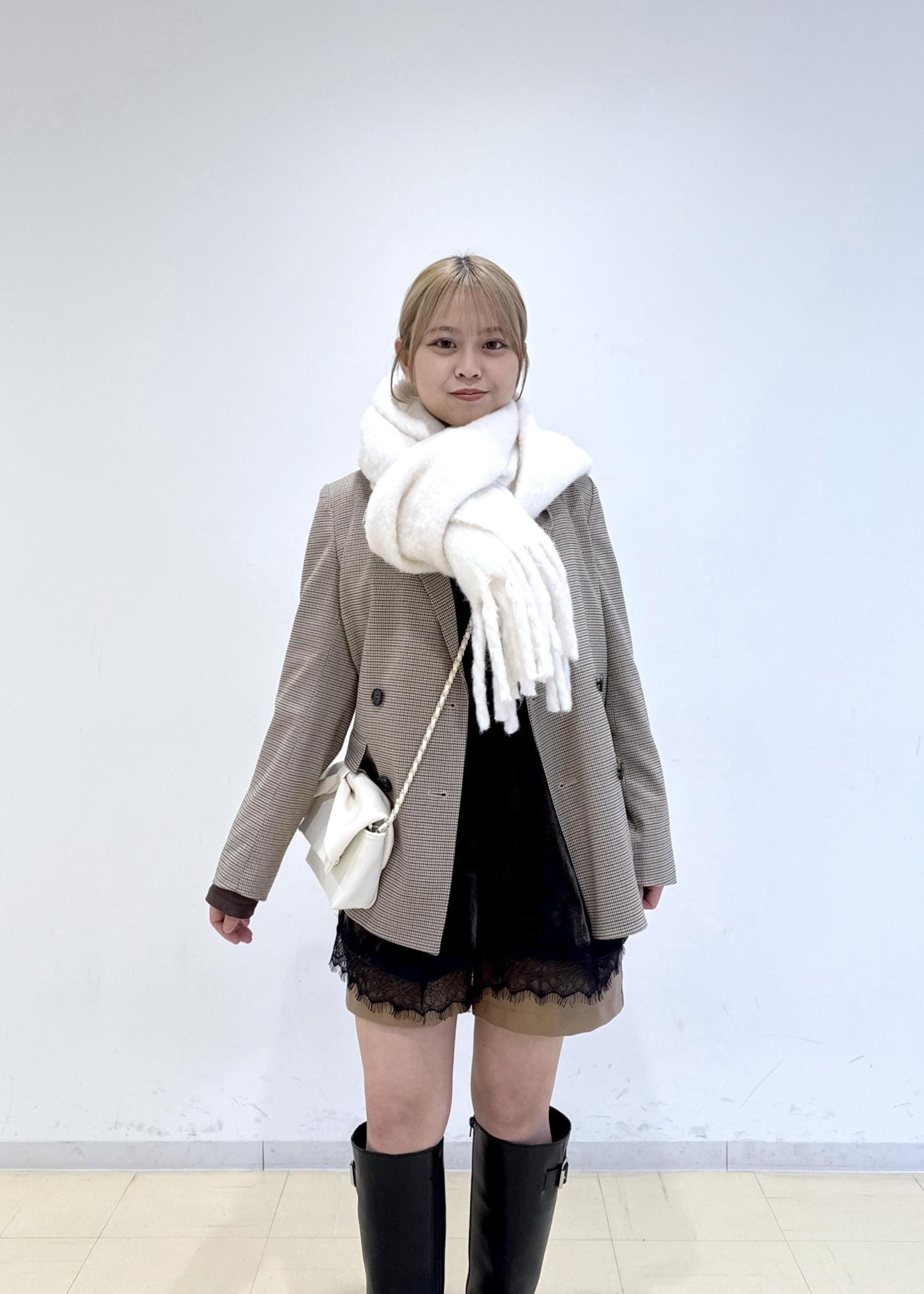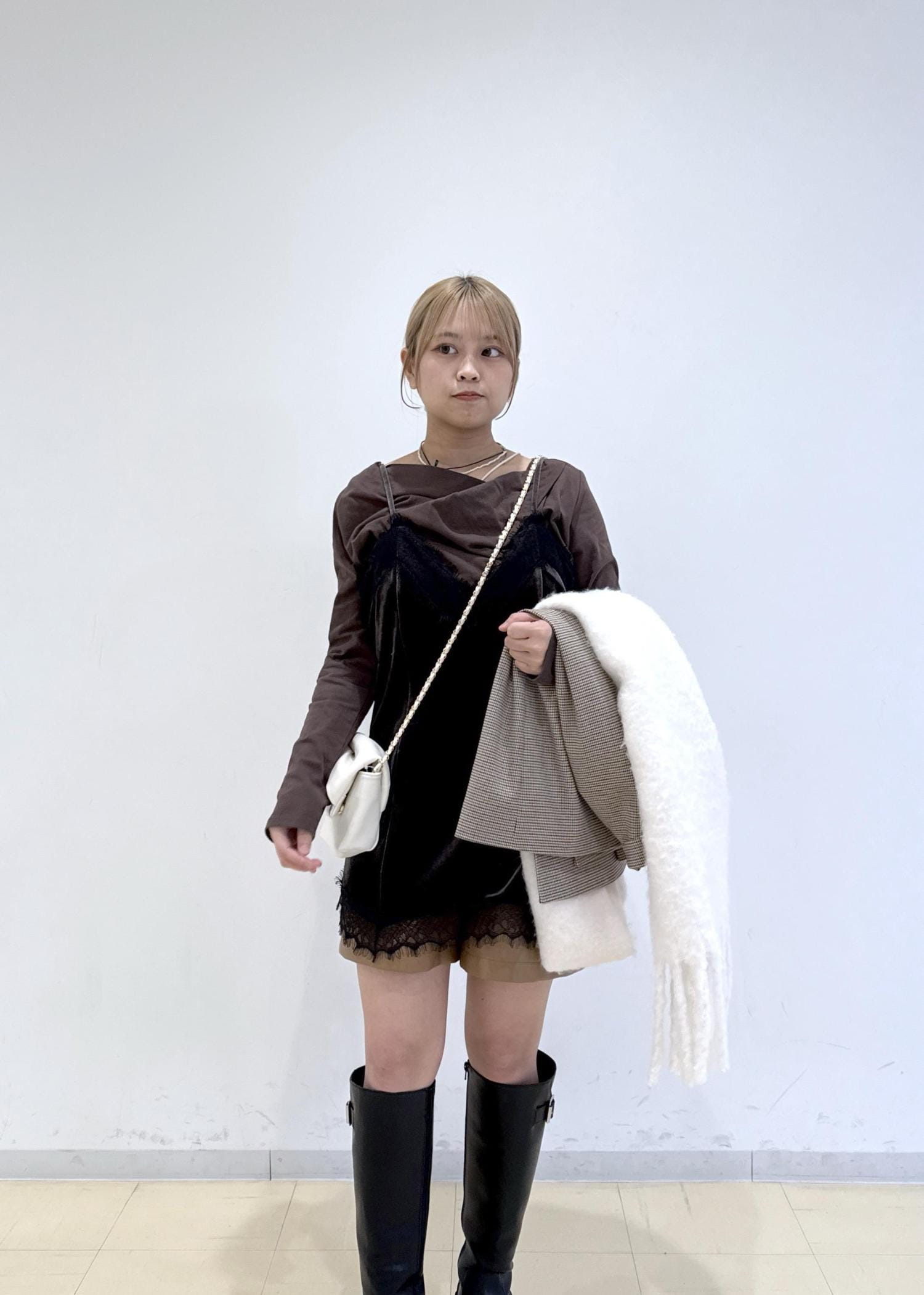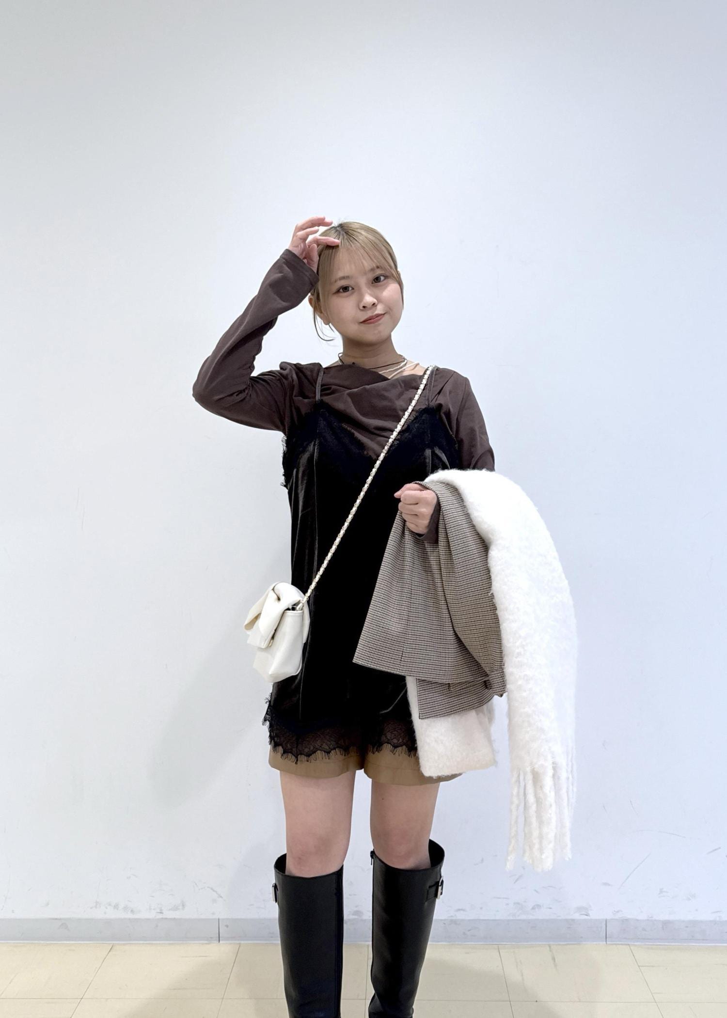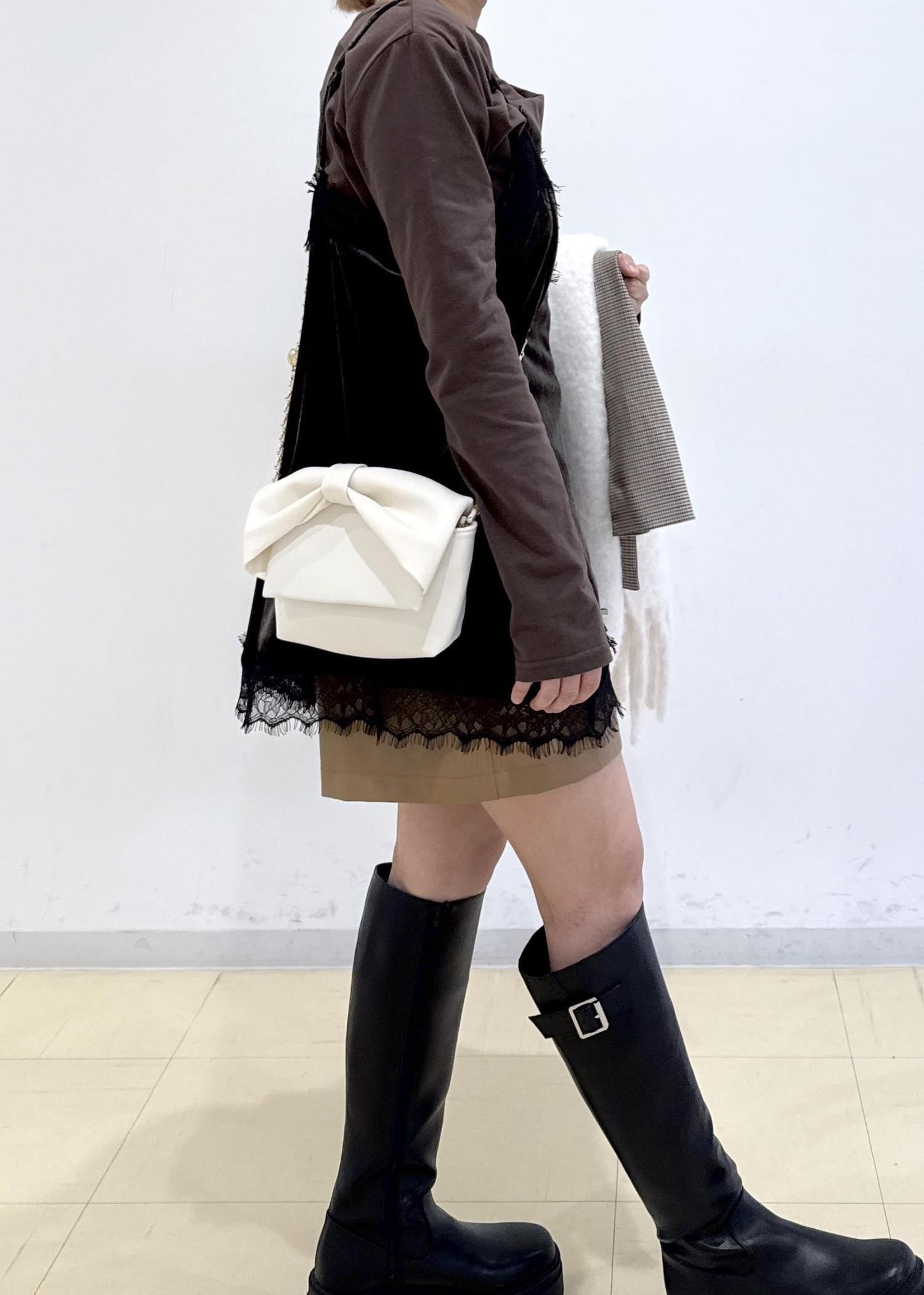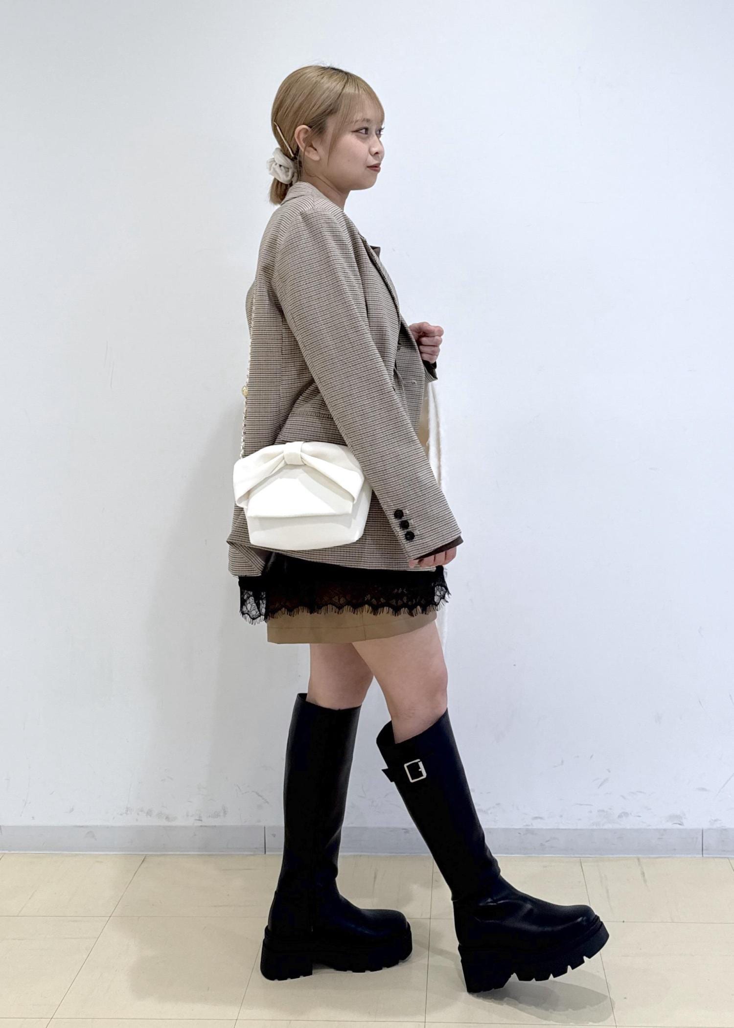 全体的にブラウン系でまとめ、バッグをホワイトにするこでコーディネートに明るさをプラスし、重たくならないように意識しました!