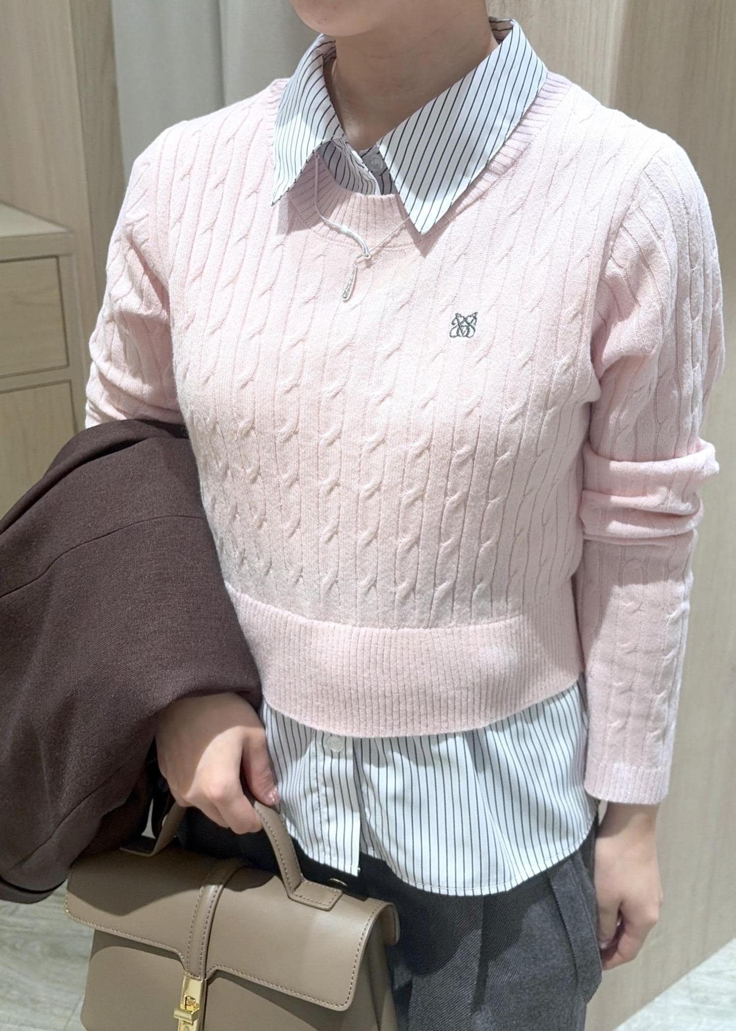 VIS【美得】ハイゲージケーブシャツドッキングプルオーバーピンク / F¥5,489レビューシャツとケーブルニットがドッキングされていて1枚で着映えします♪