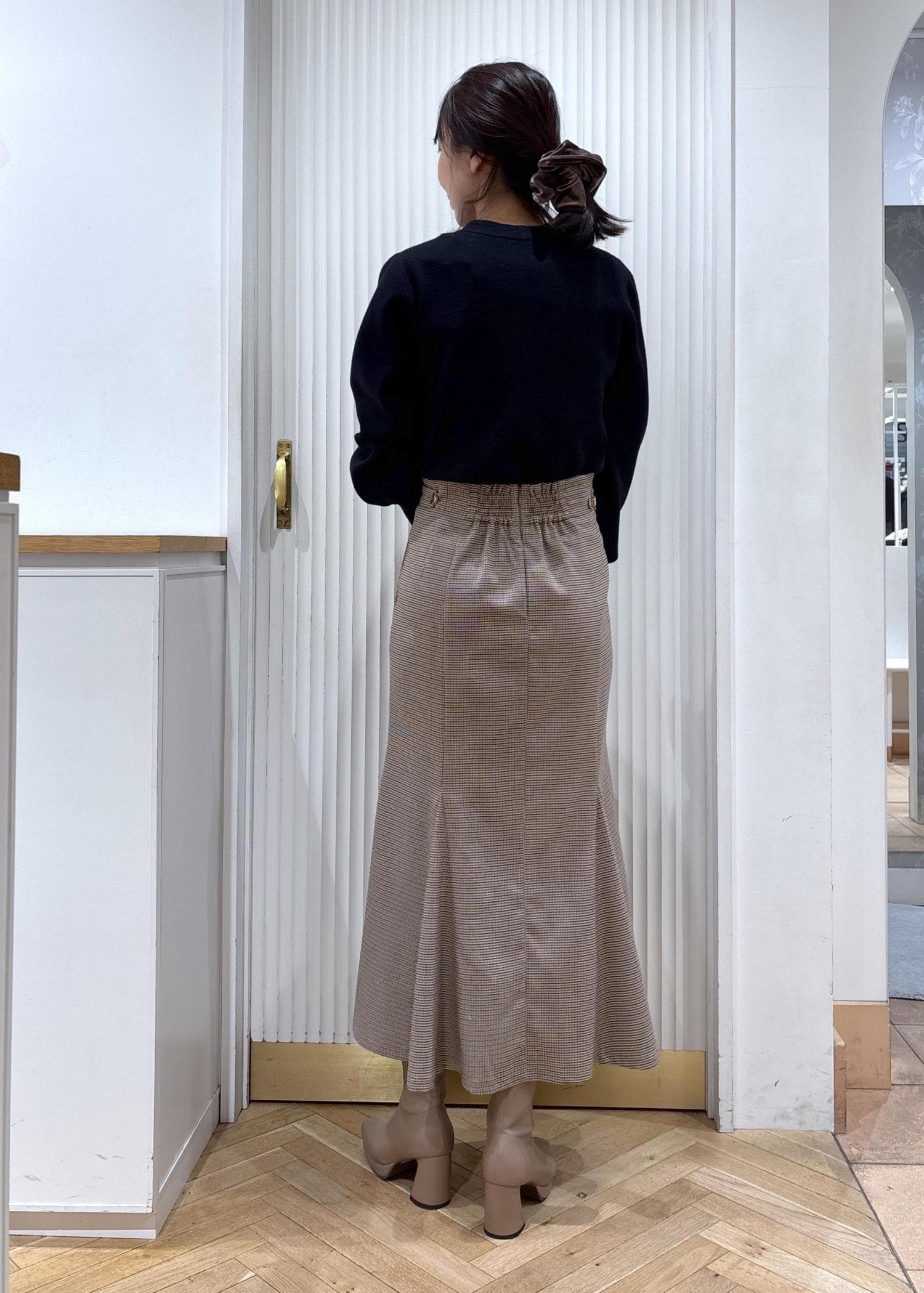 たぽっとした袖が可愛い、キレイめニットにマーメイドスカートを合わせたスタイリングてす。