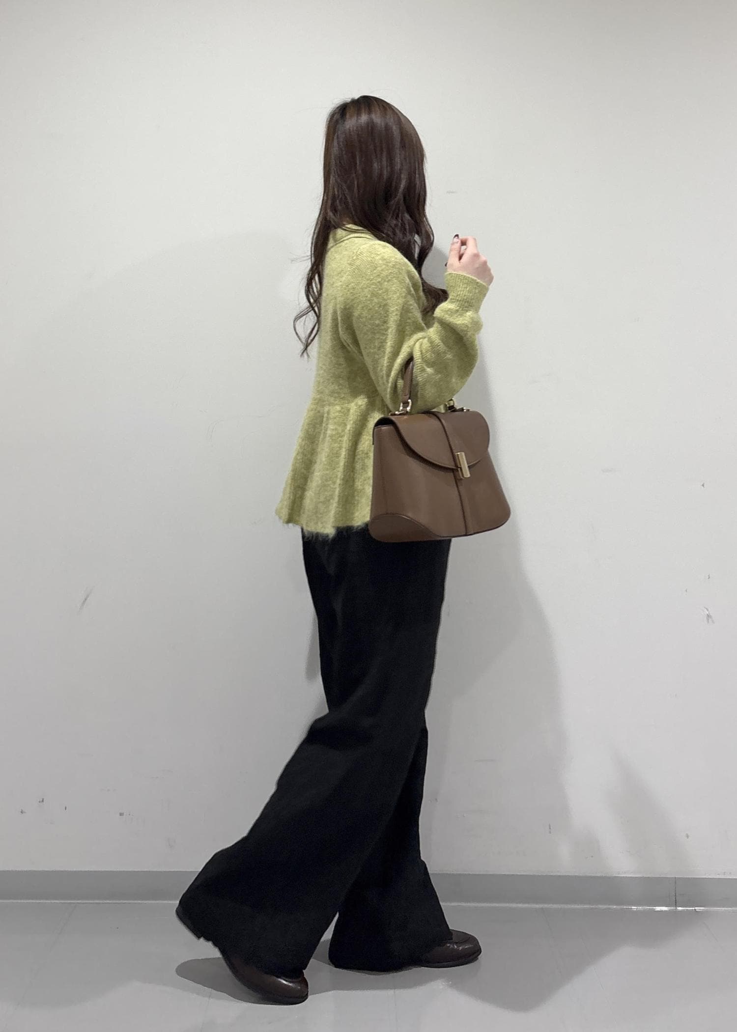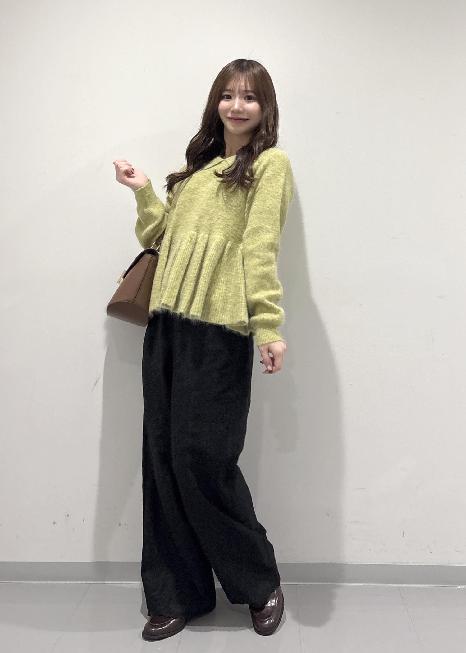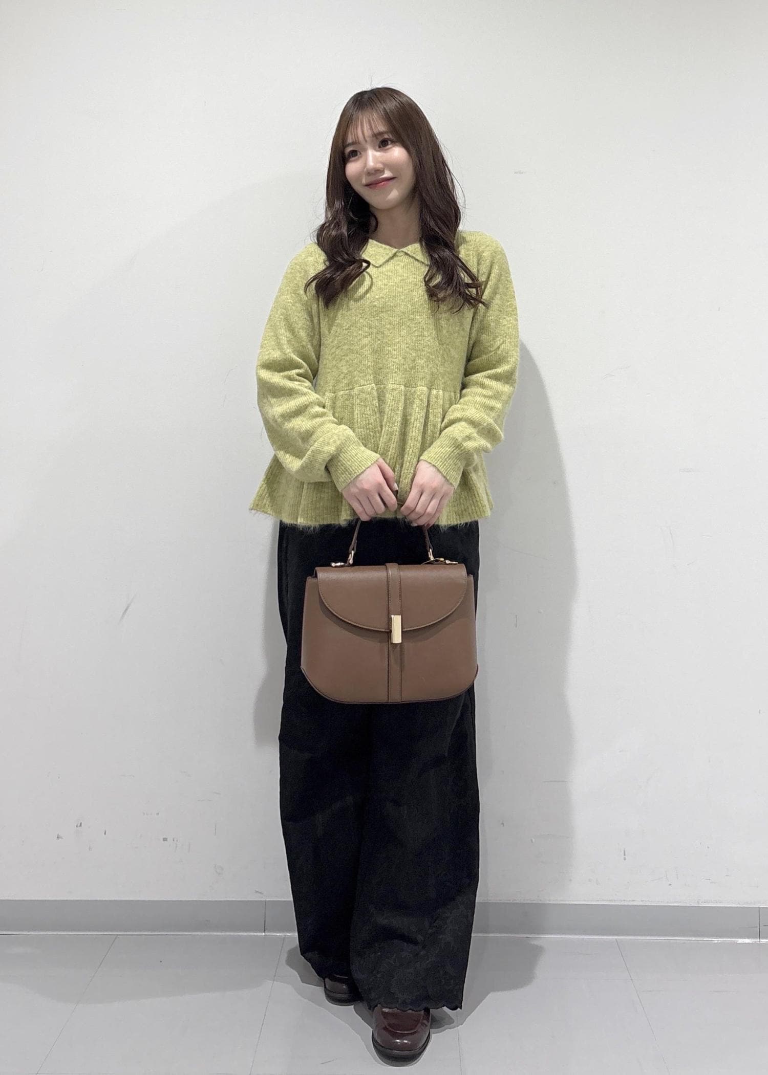 こちらのコーデのポイントは、グリーンのペプラムニットです!襟付きでペプラム仕様なので甘い感じで女性らしい印象にしてくれます!刺繍付きのパンツは上品だけどカジュアル感も出してくれてるので普段使いもしやすいです!ブラウンのバッグとローファーで大人っぽくキレイめな印象を出してみました!冬の終わりかけから春でも着用できちゃいます!