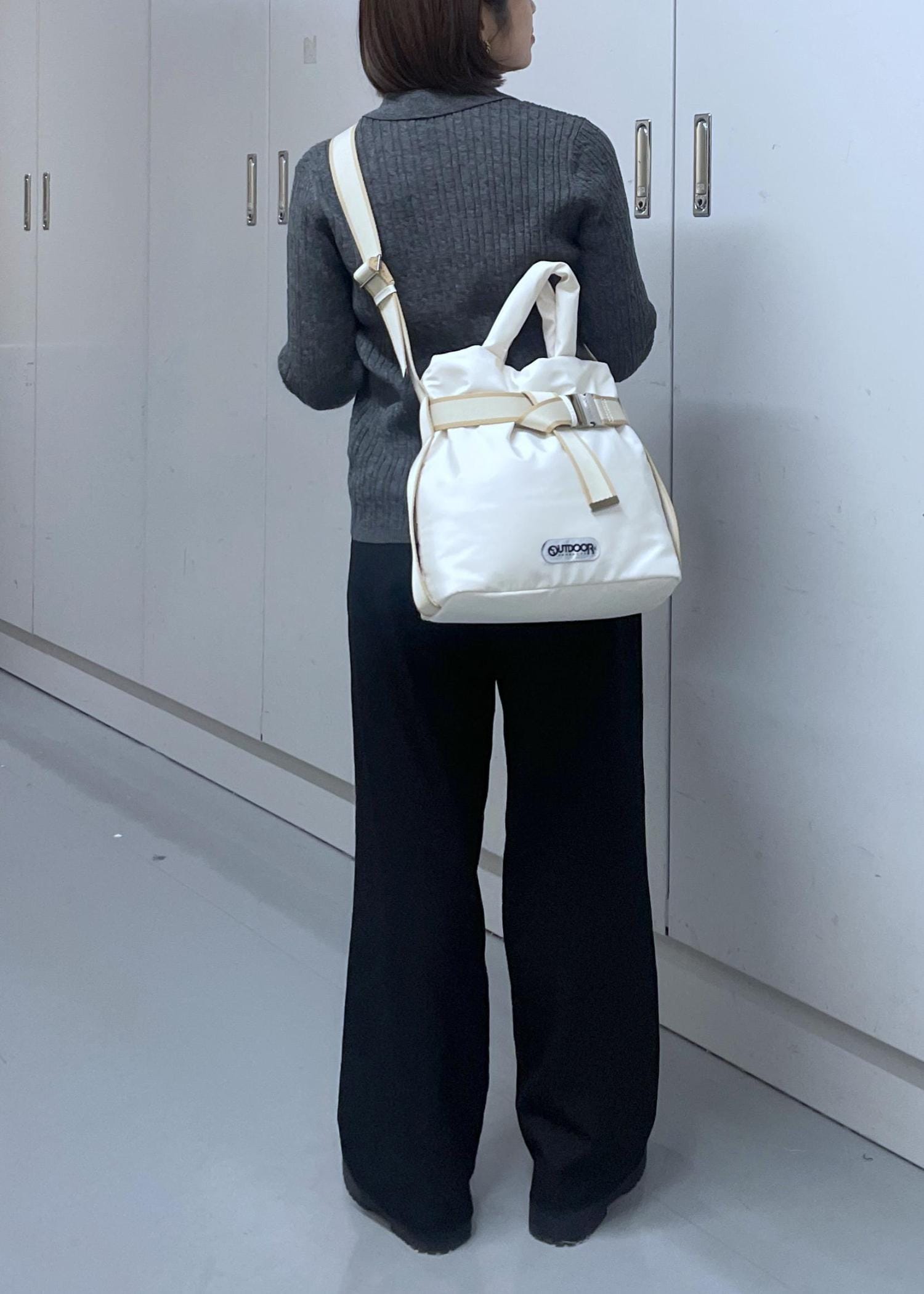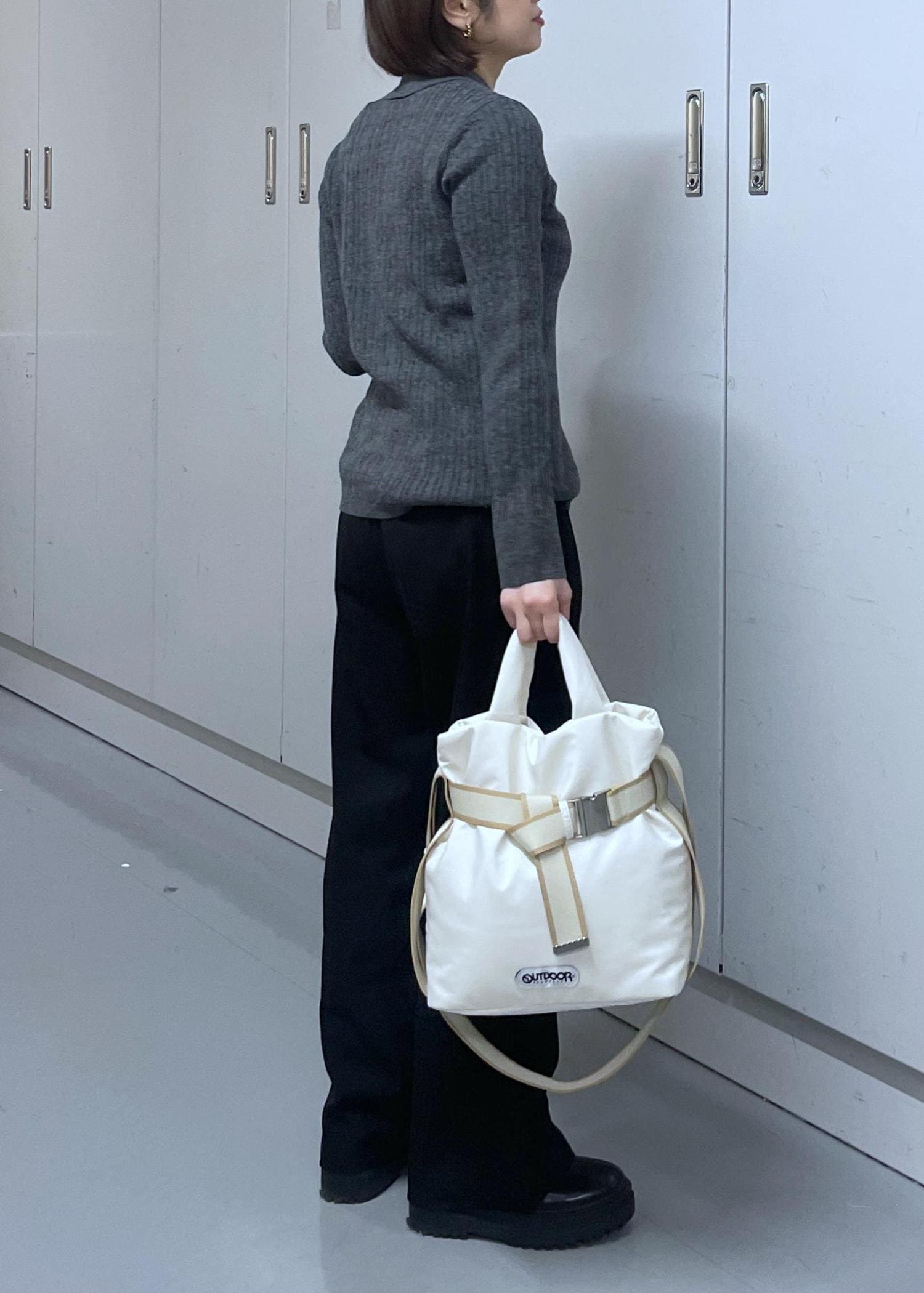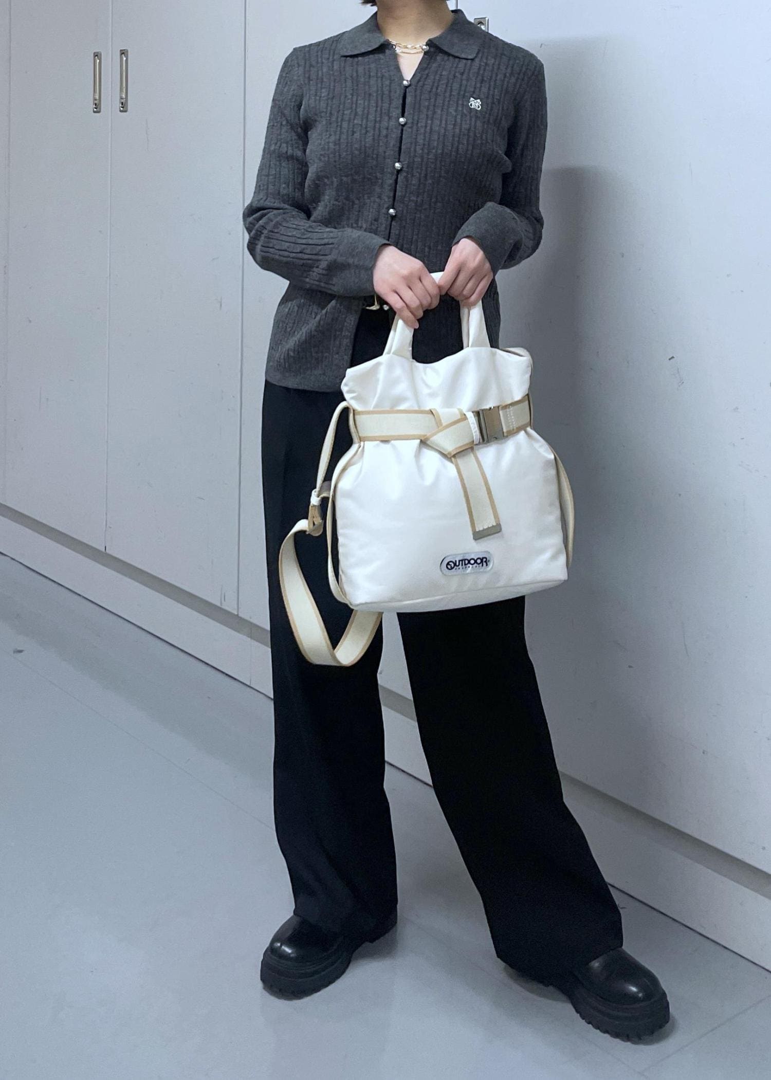 ベルトテープ×バックルのデザインが、シンプルコーデに合わせても様になります。