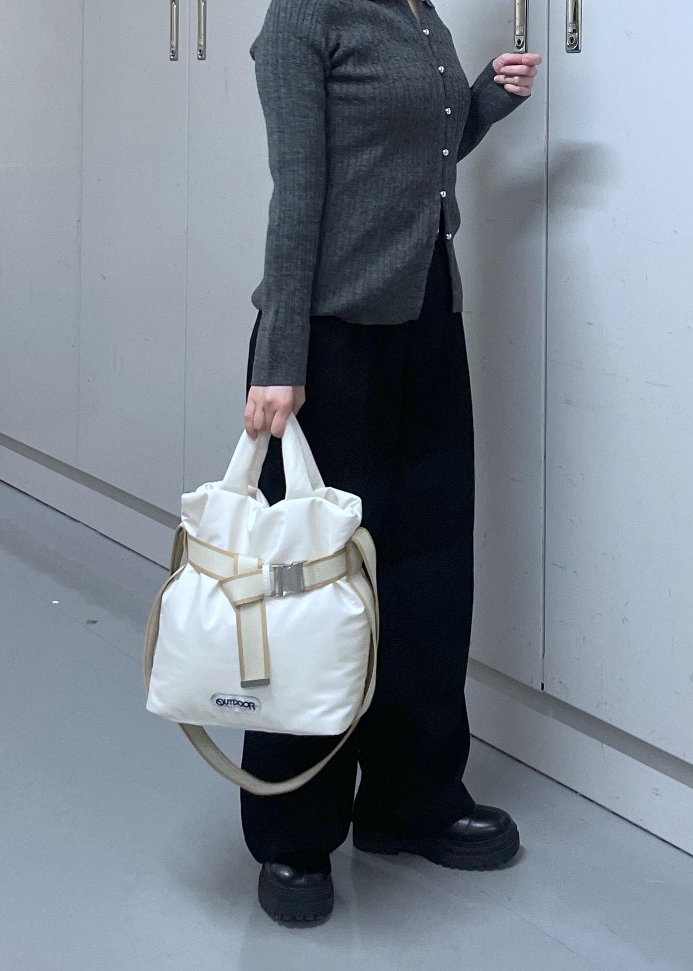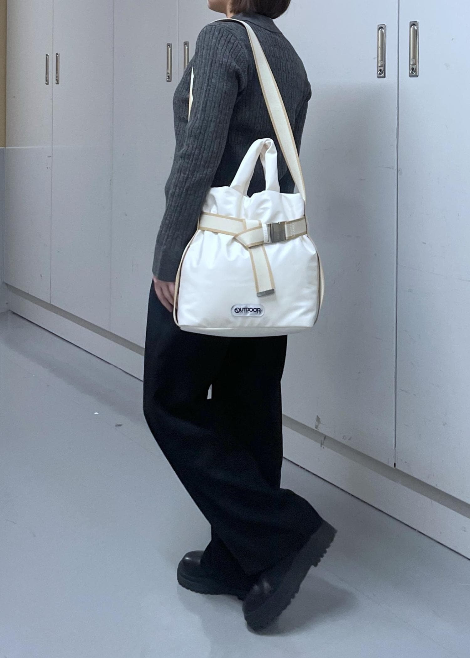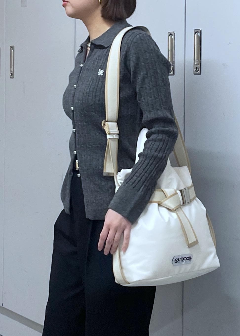 ベルトテープ×バックルのデザインが、シンプルコーデに合わせても様になります。