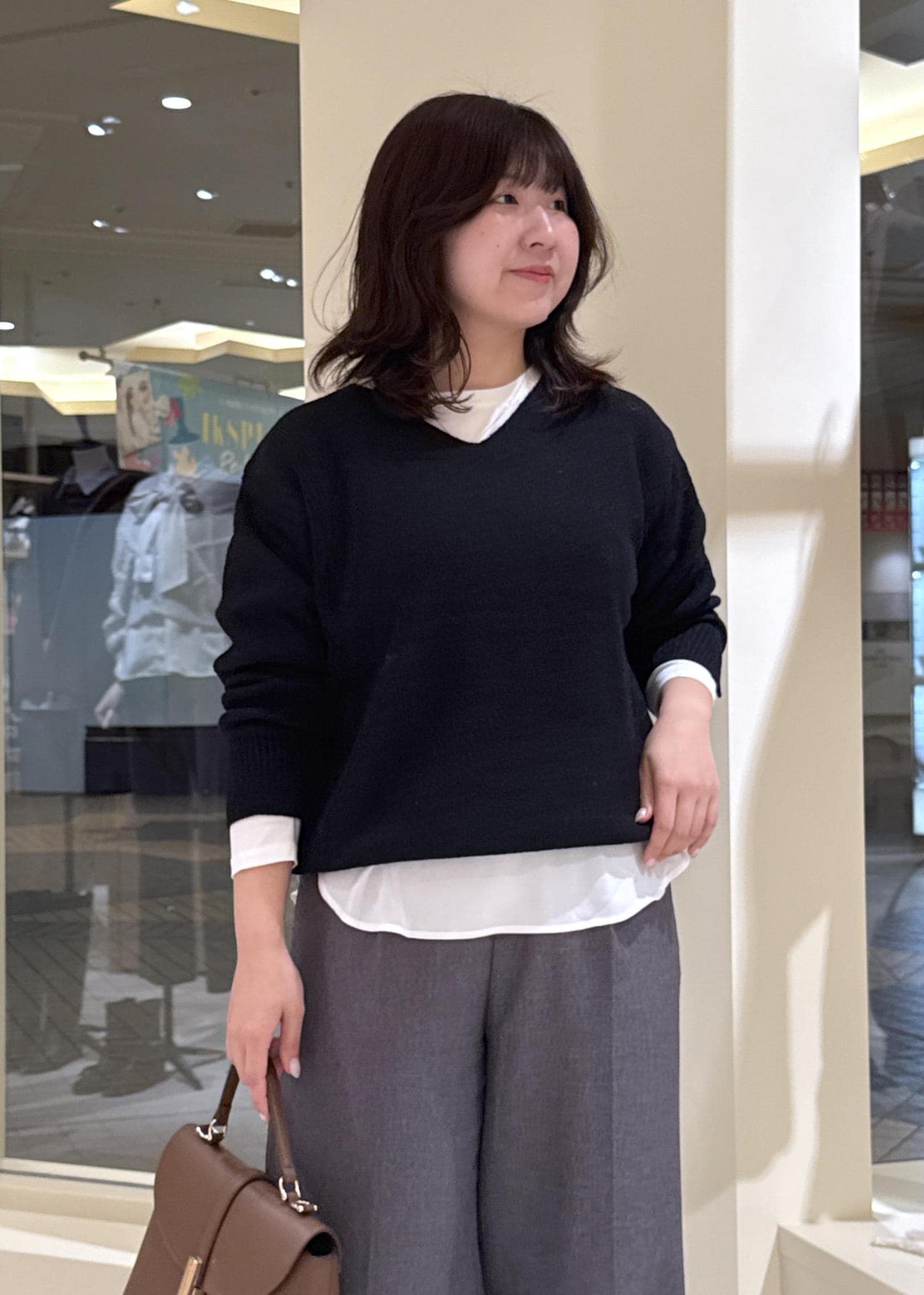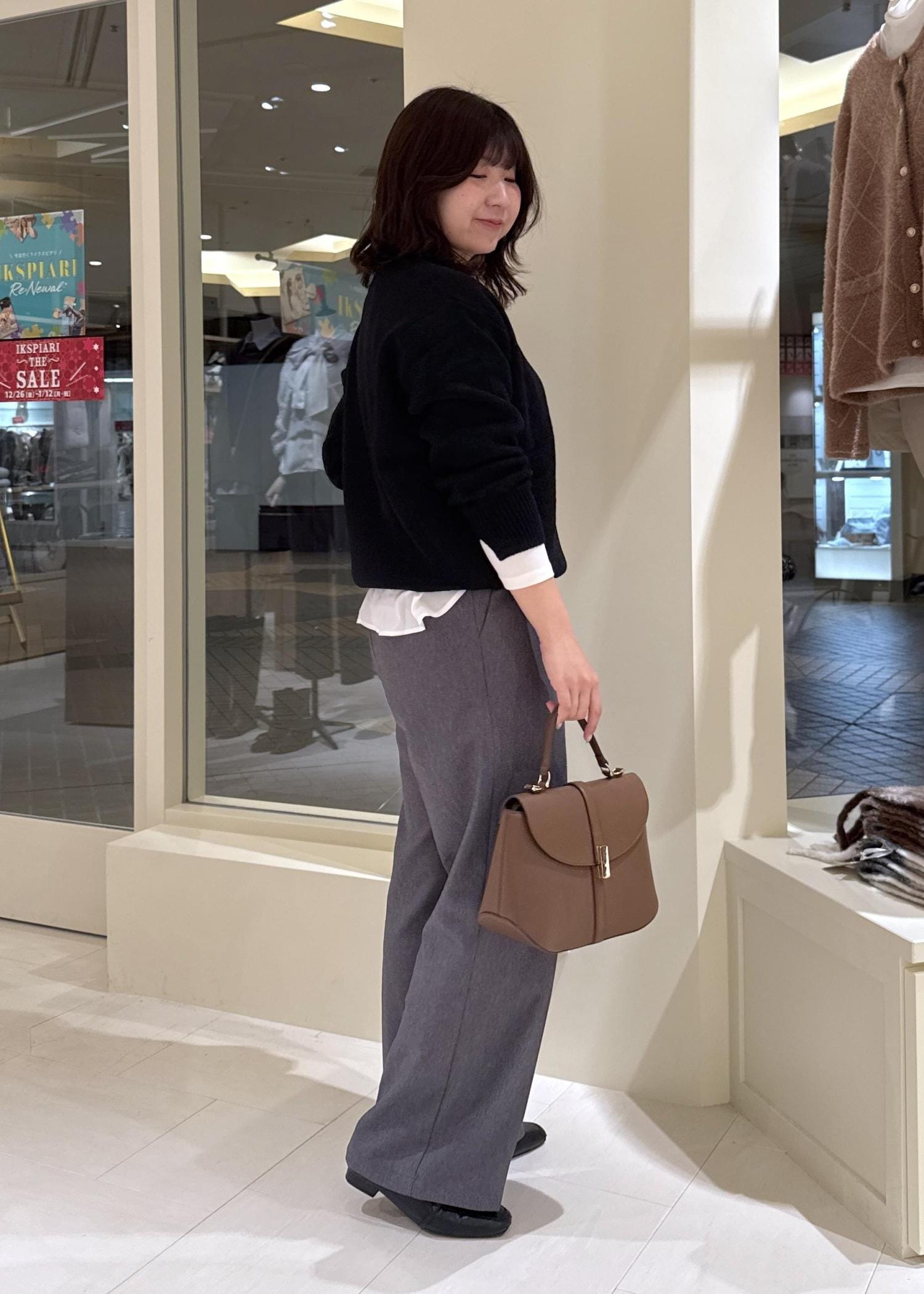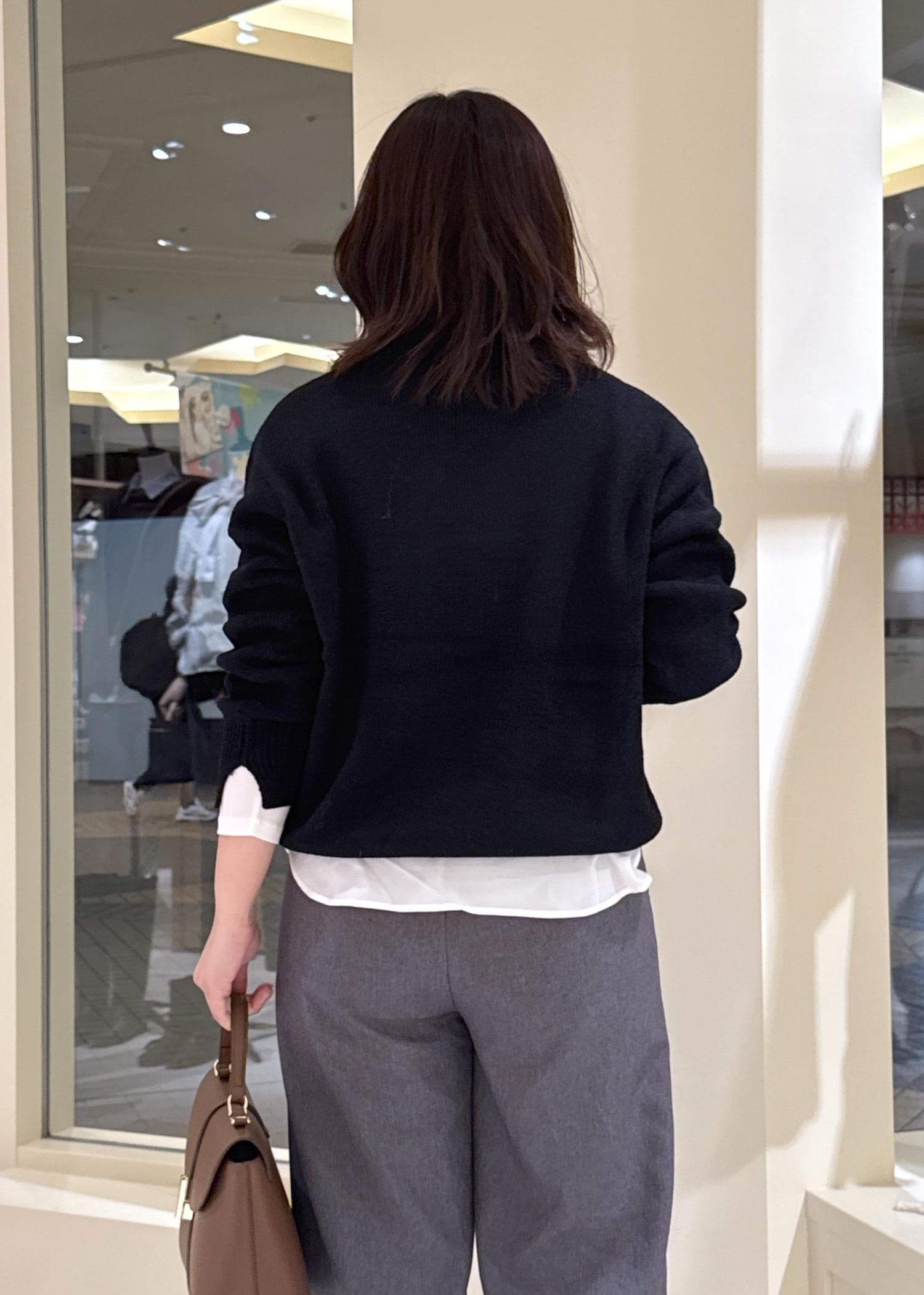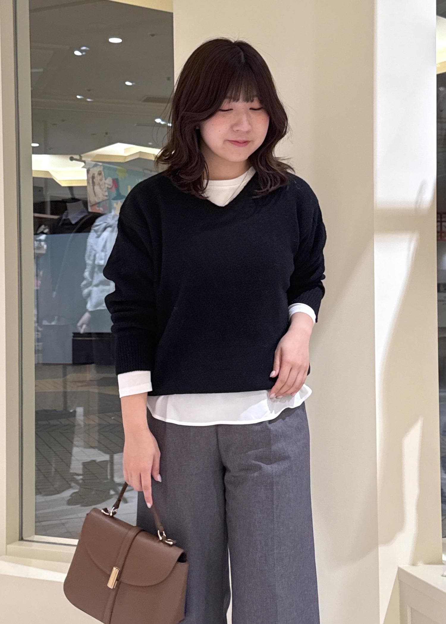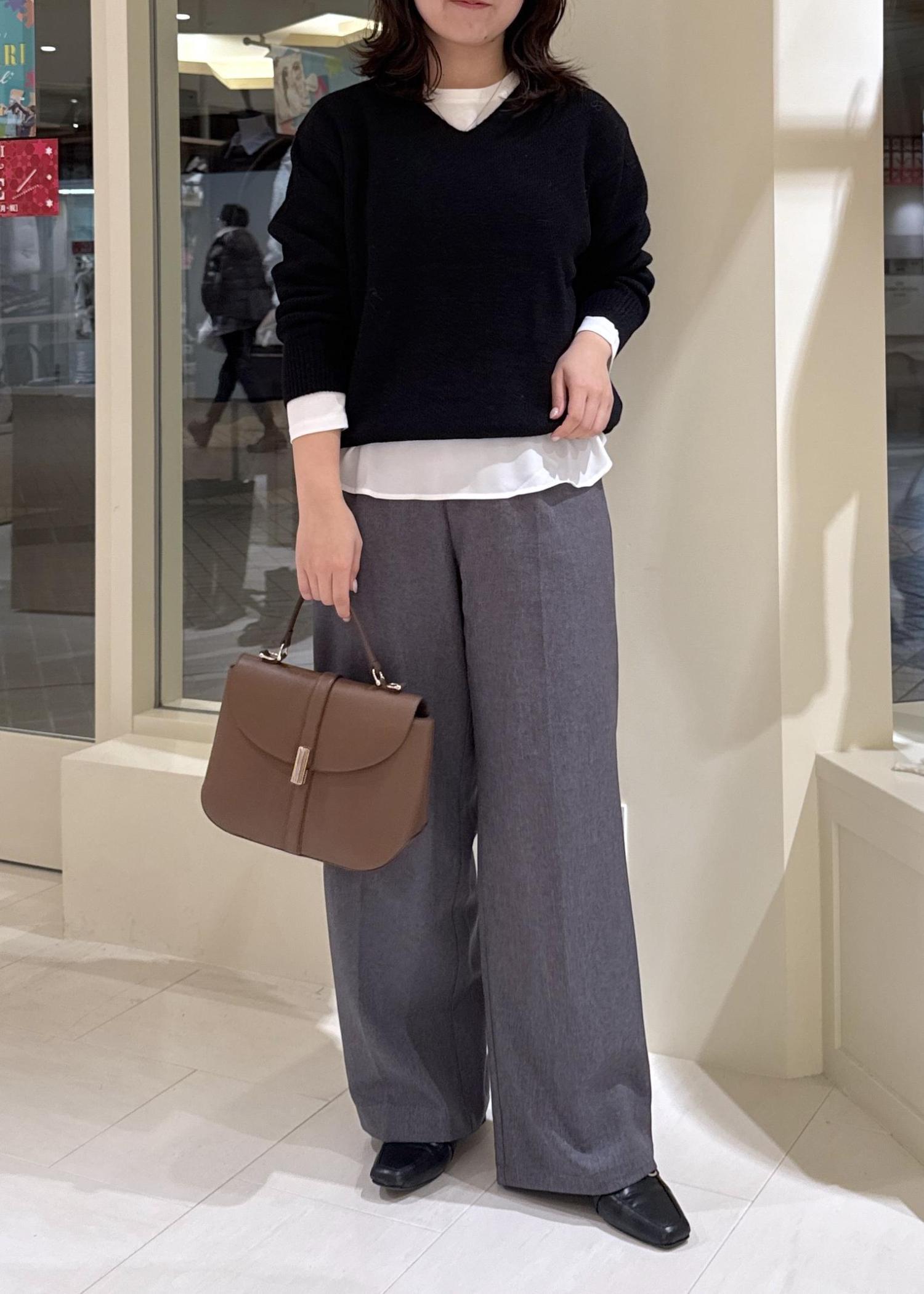 着丈が少し長めのものを合わせる時は、丈感のバランスを取るように心がけます。 -
