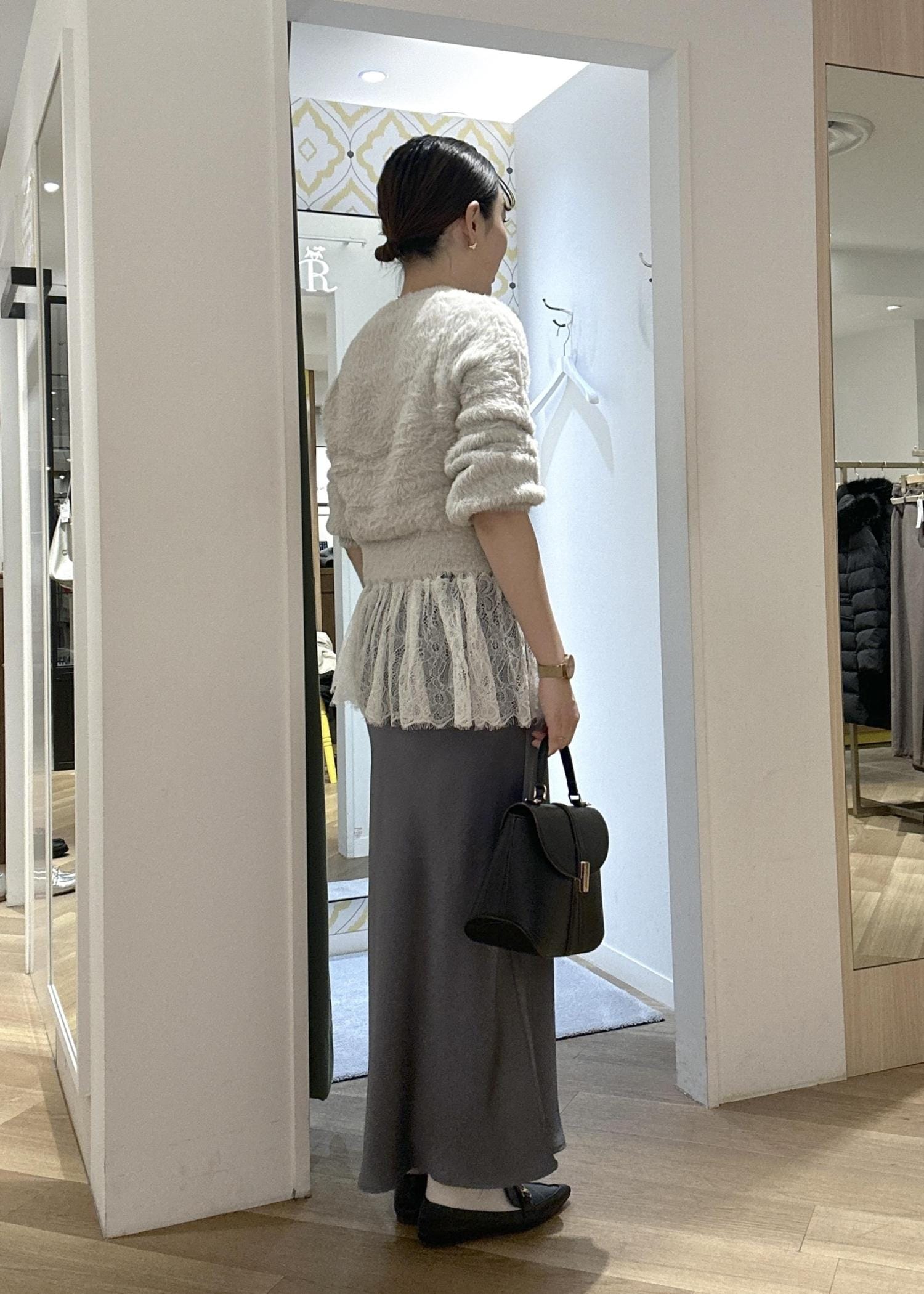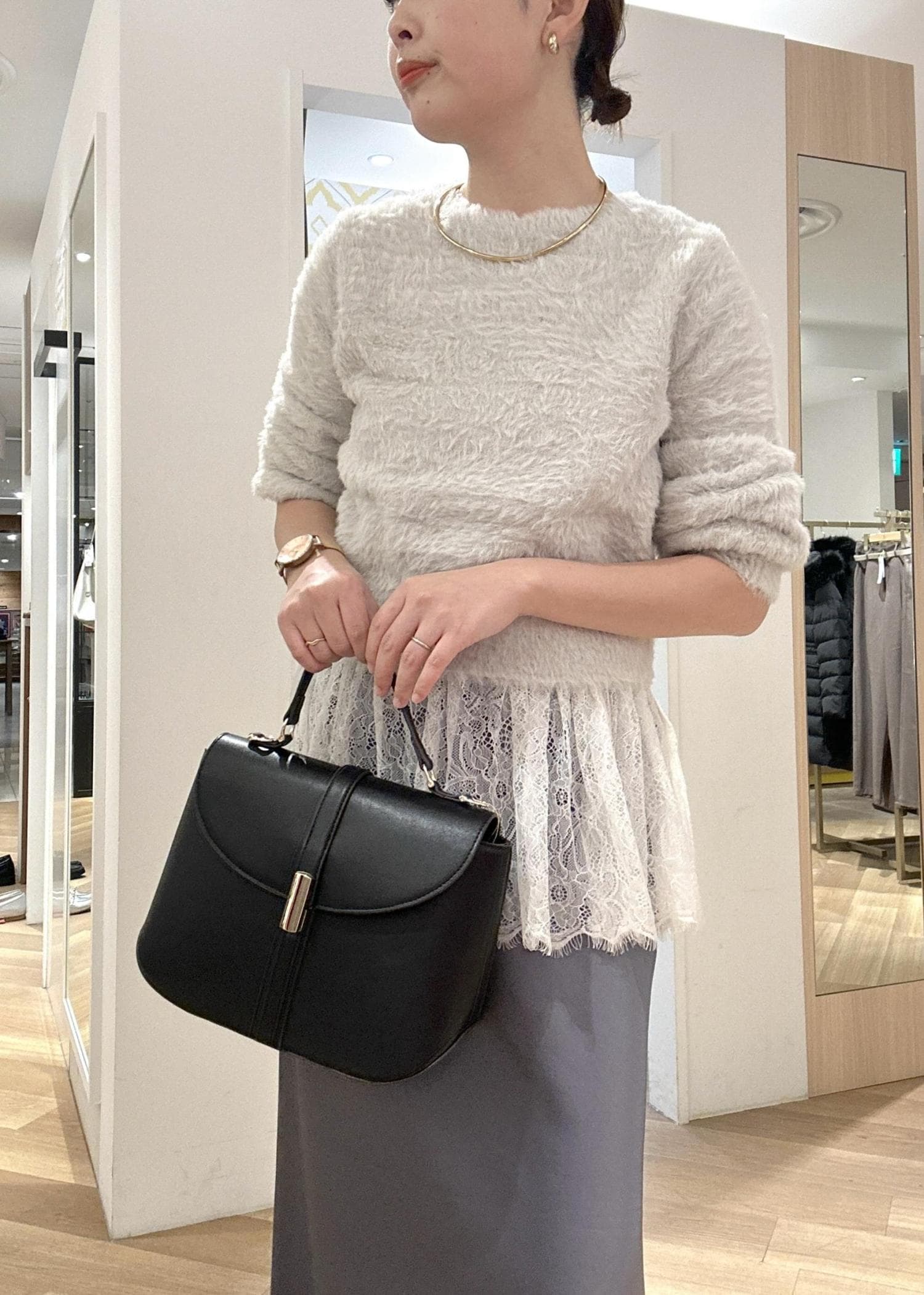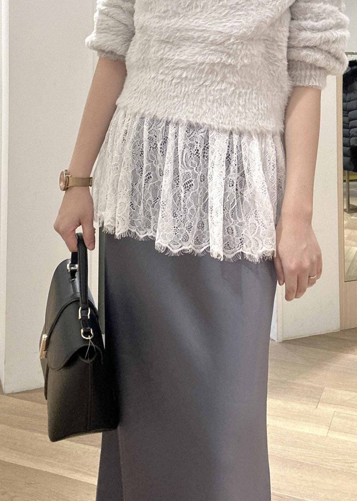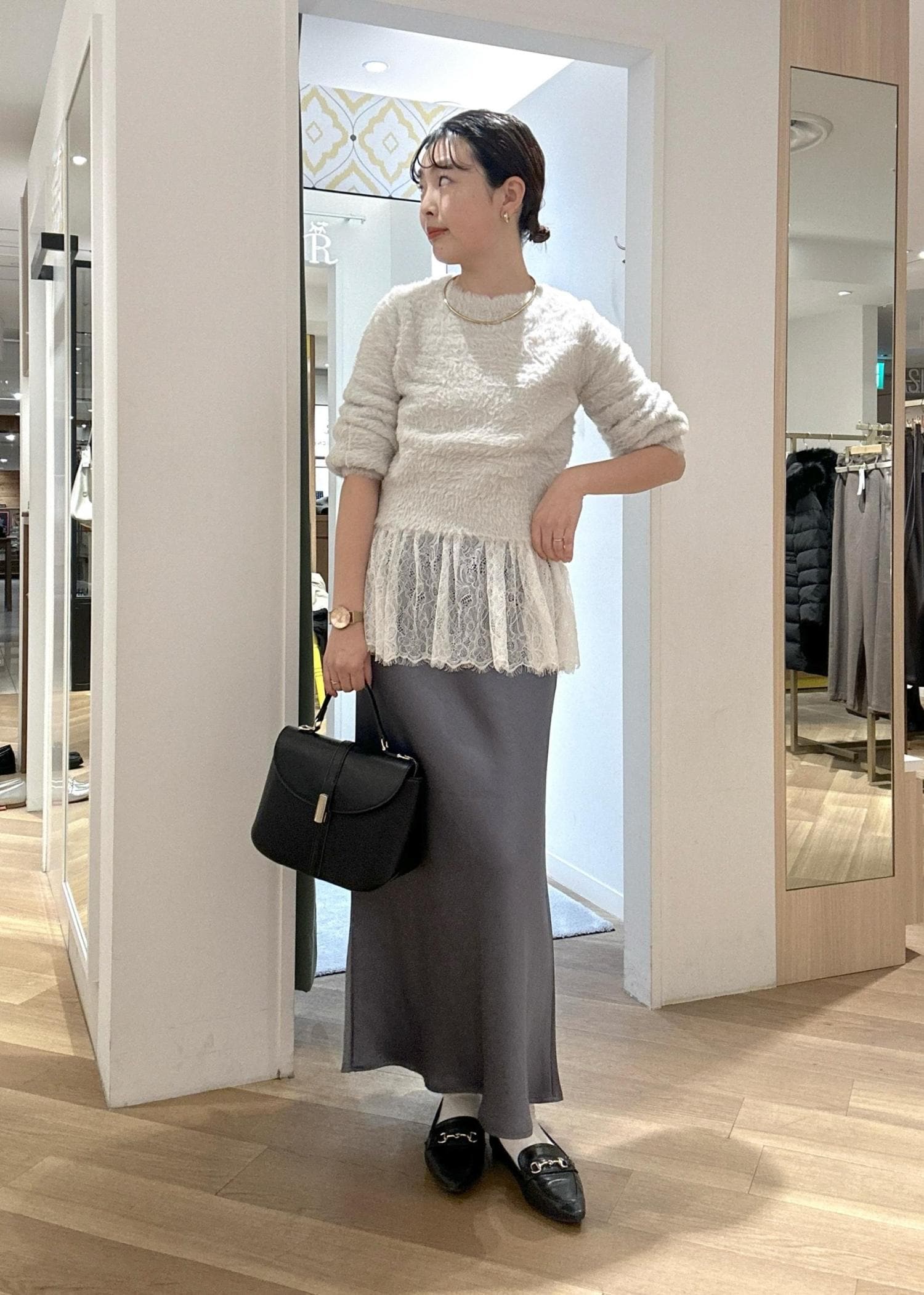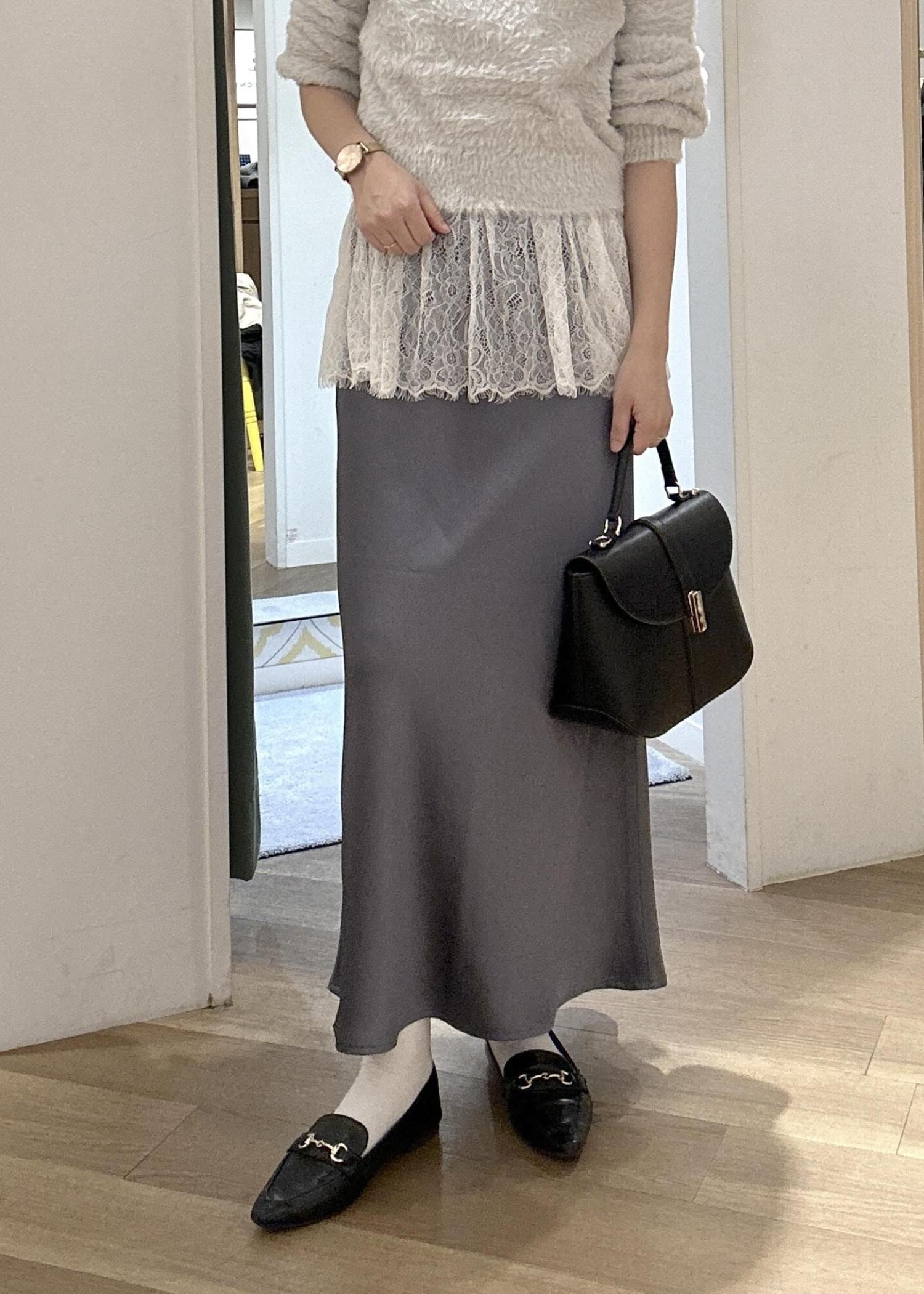 光沢のあるスカートに、コンパクトなフェザーニットを合わせても品のあるカラーコーデで大人っぽく♪ 黒の小物で締めて甘過ぎない大人のフェミニンスタイルです。