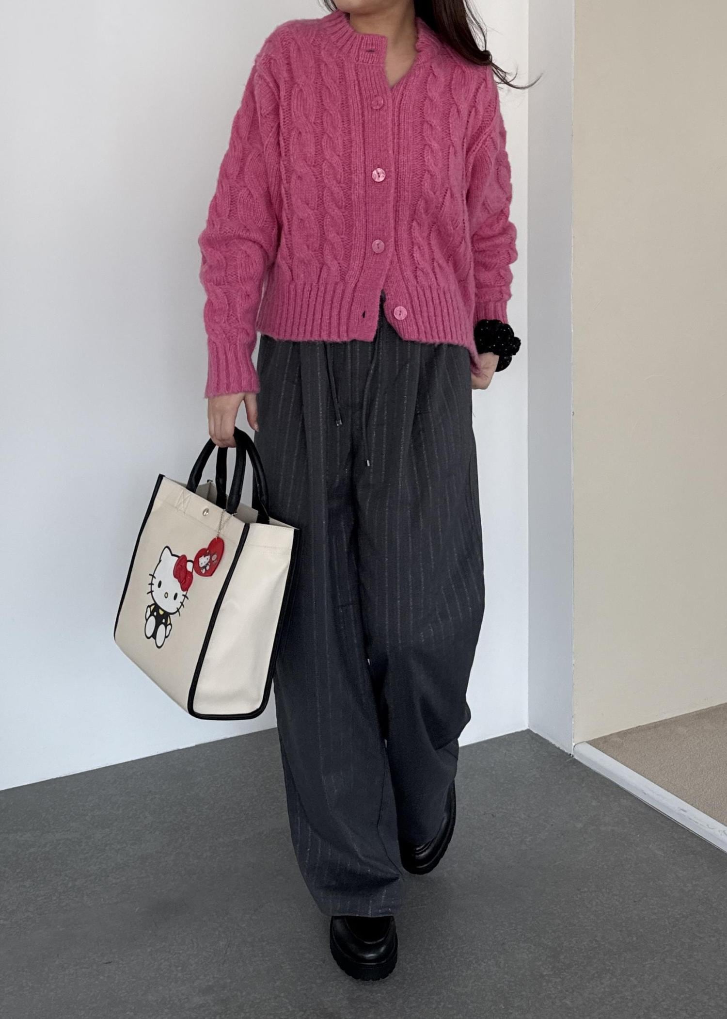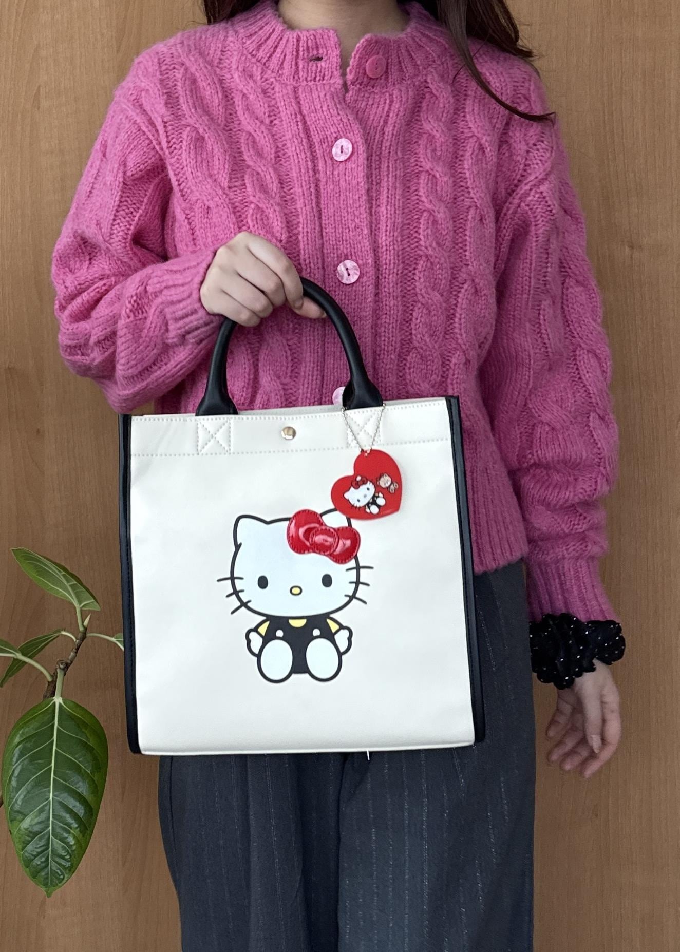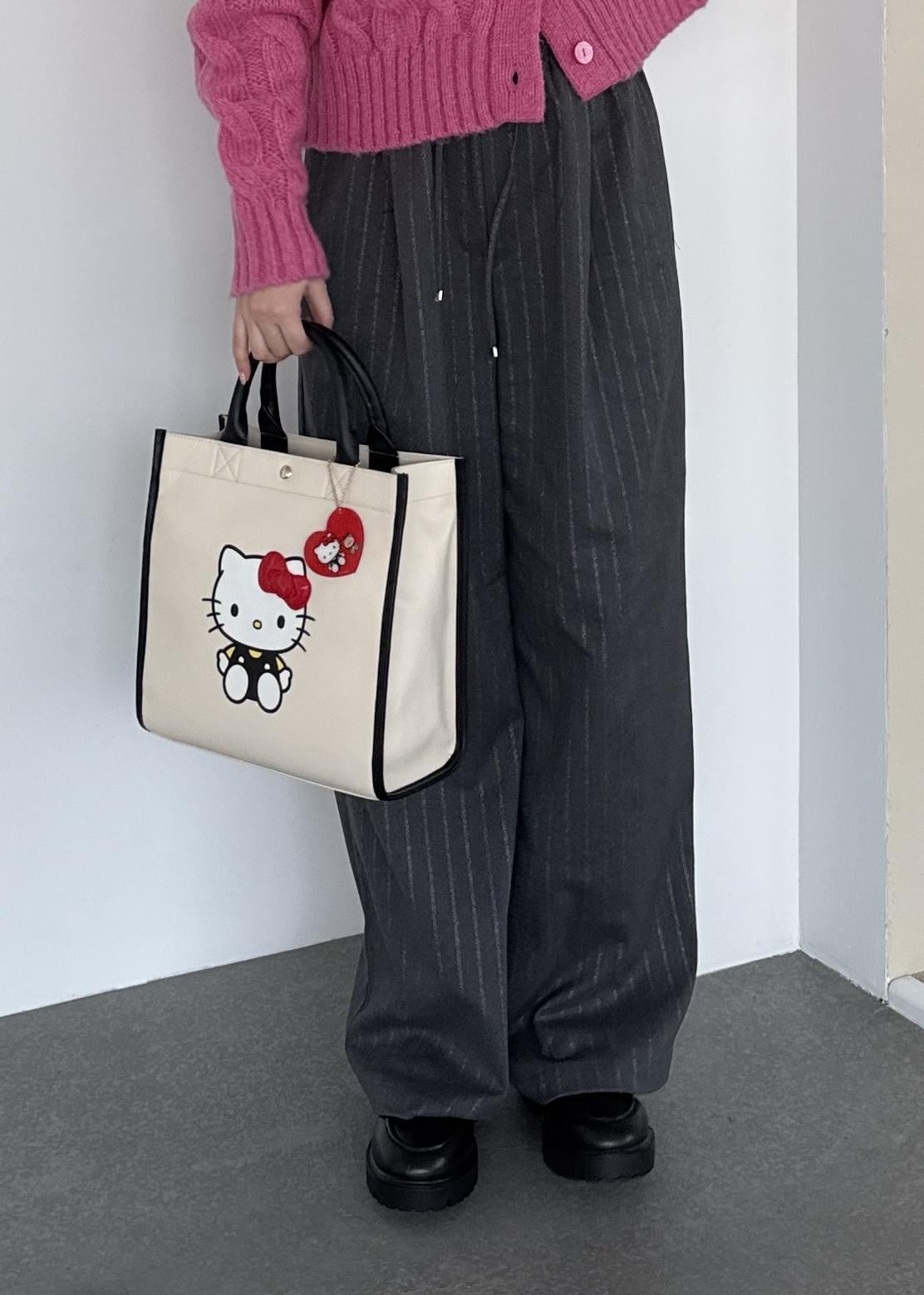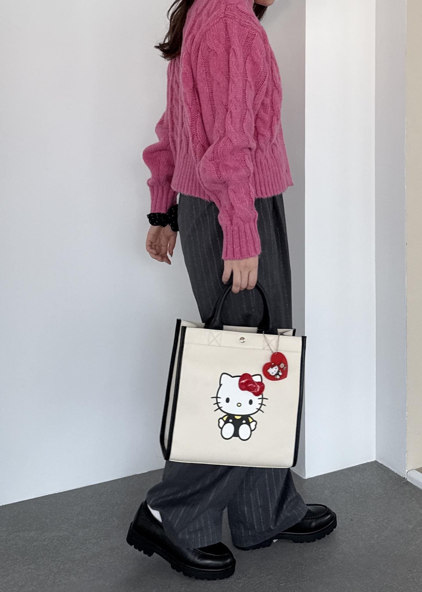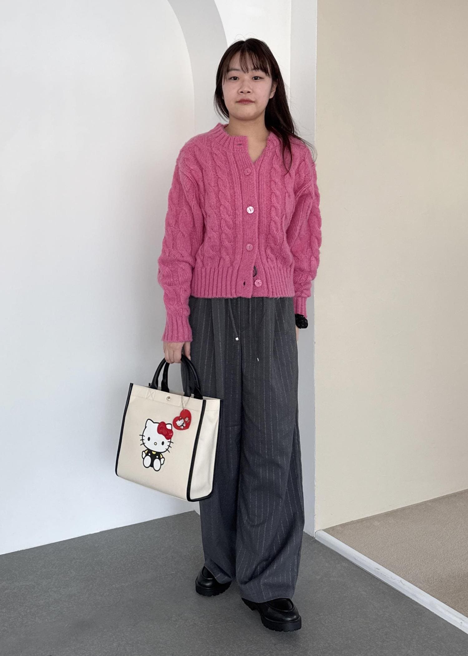 ビビットピンクが目を惹くコーディネートで、ハローキティのバッグを合わせて可愛さをプラス。