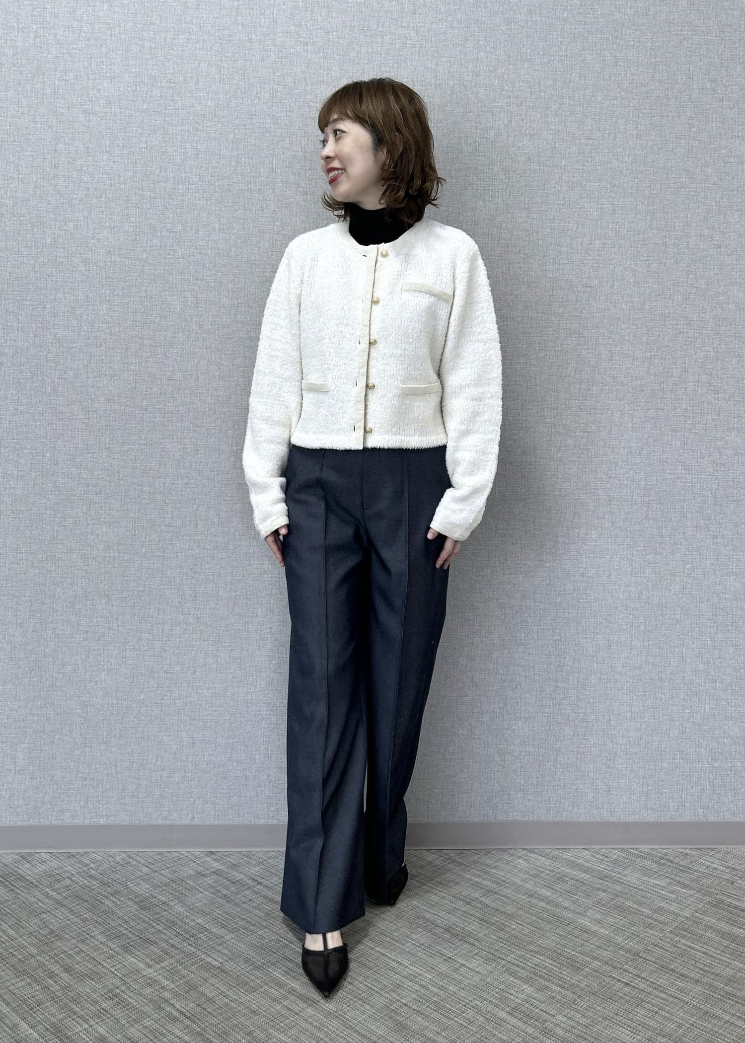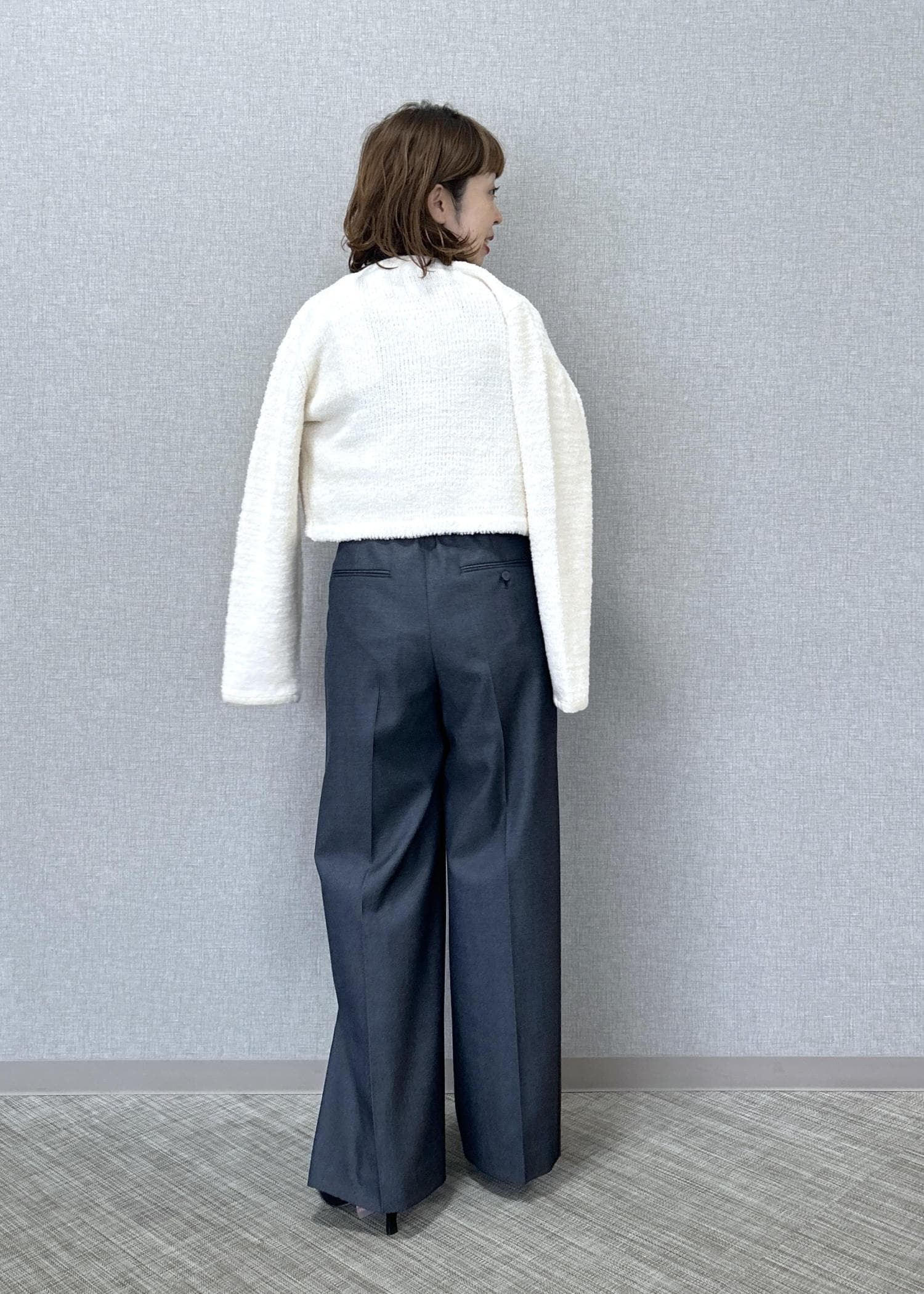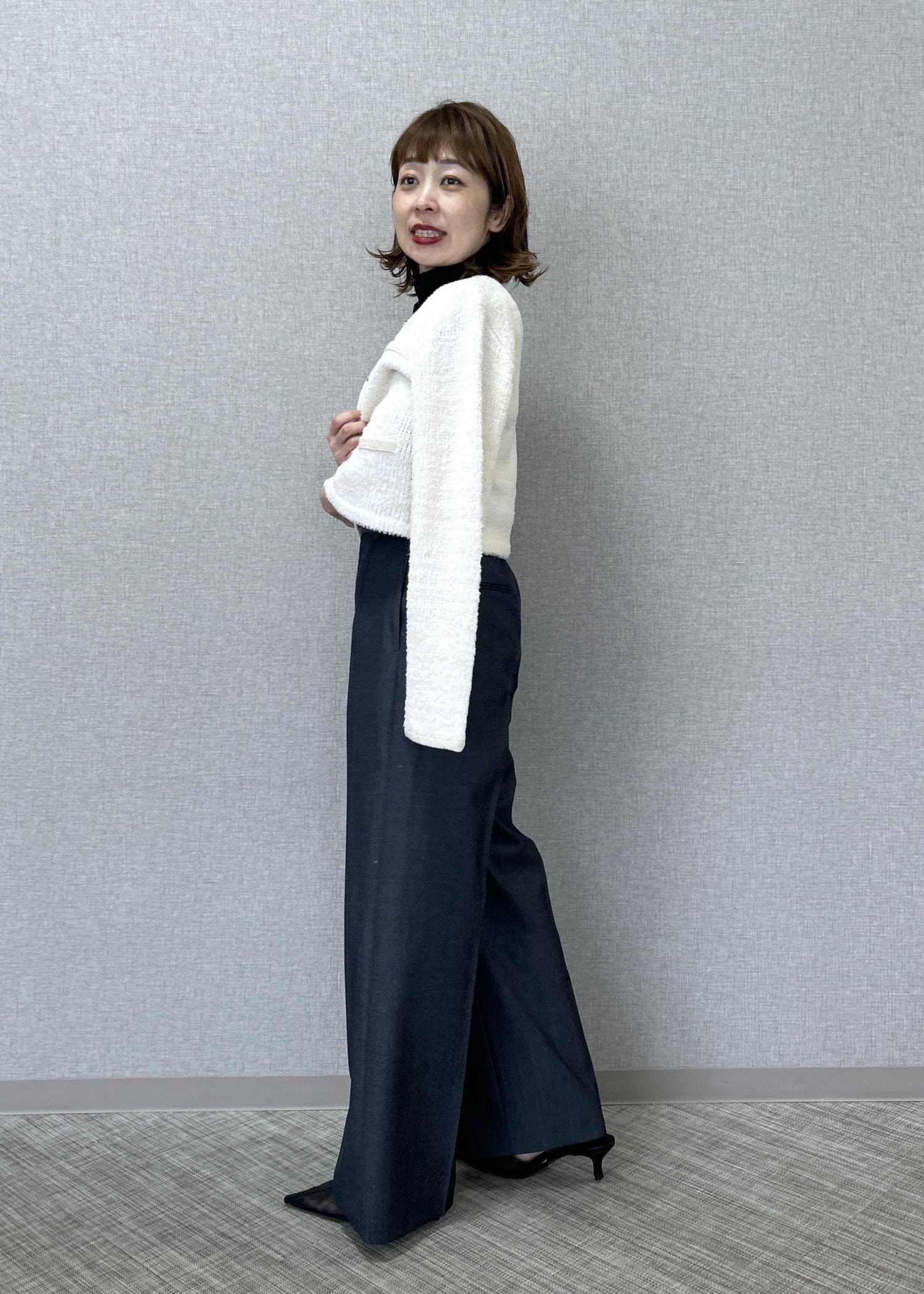ROPÉツイードニットショート丈カーディガン/イージーケアキナリ / F¥37,400レビュー着丈は腰〜ヒップの上辺り迄の長さです。