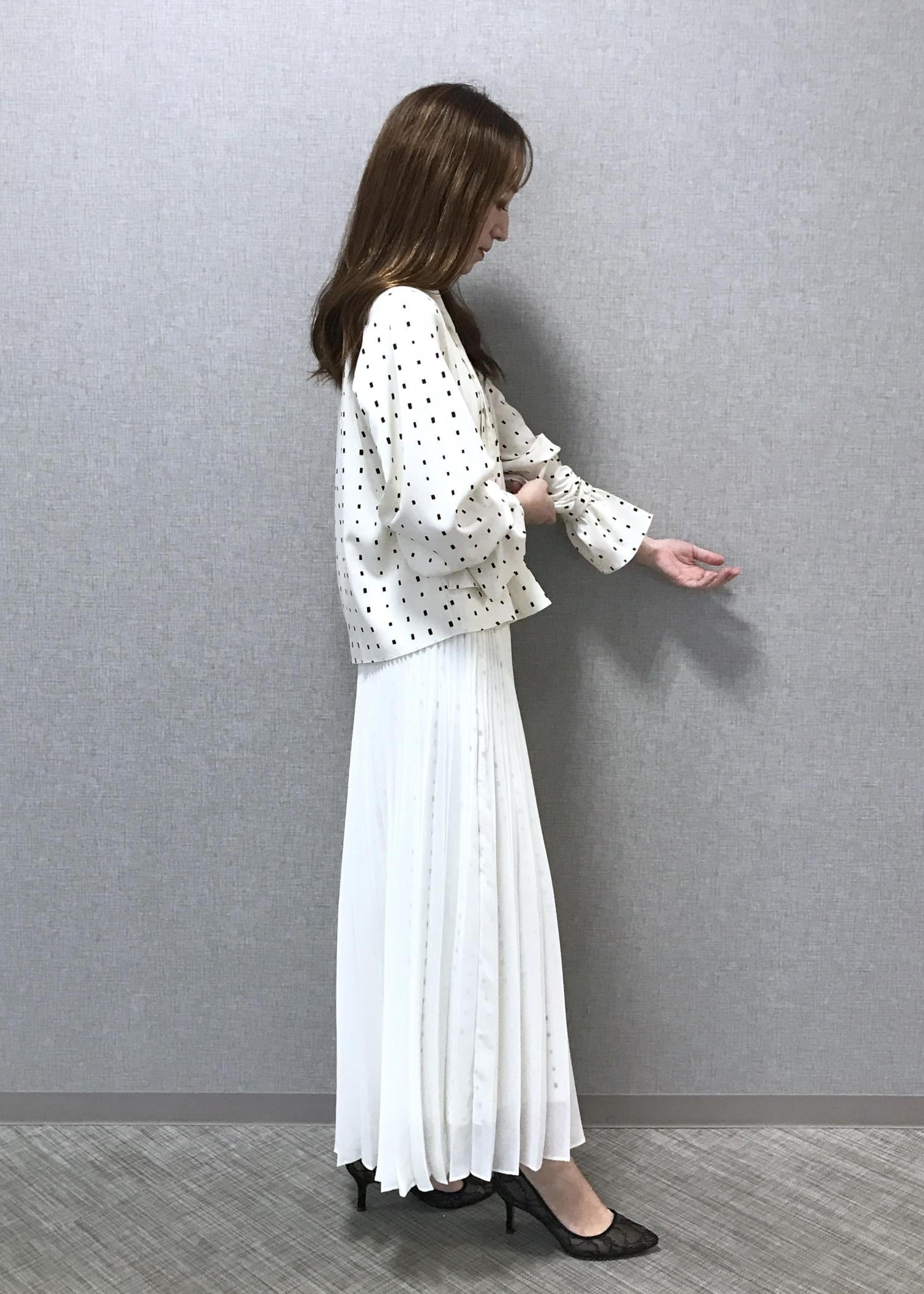 ROPÉスクエアドットプリントププリーツスカートキナリ / 38¥25,410レビュー長さや、プリーツのボリューム感がを楽しめるスカートです。裏地のさりげないドット柄が覗くのがかわいいです。
