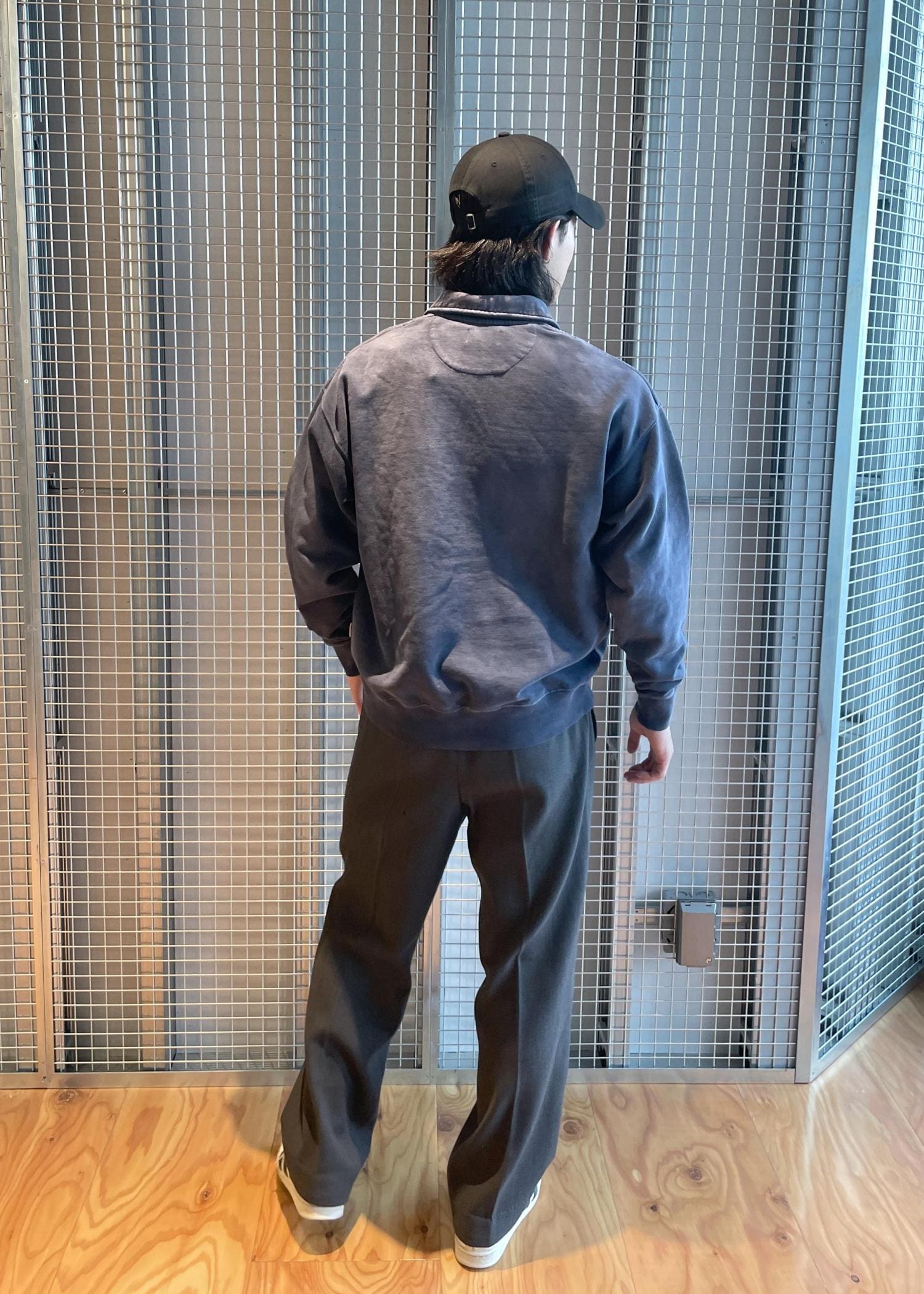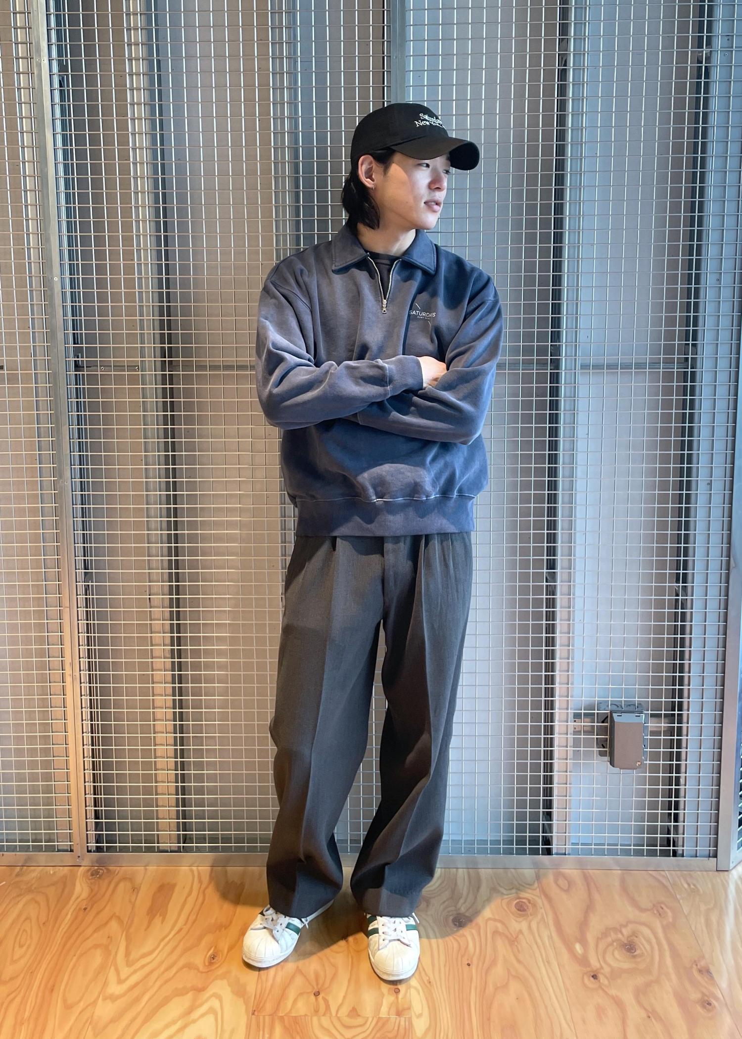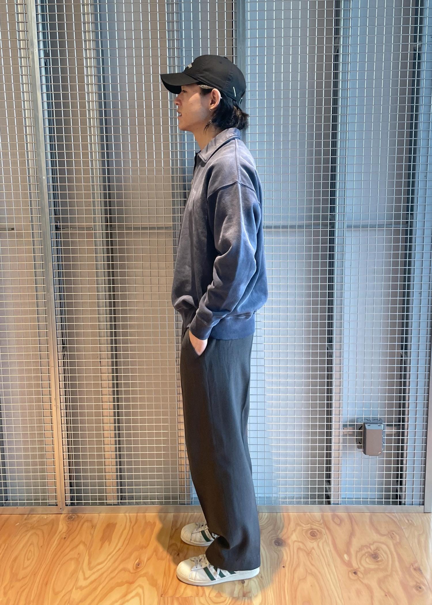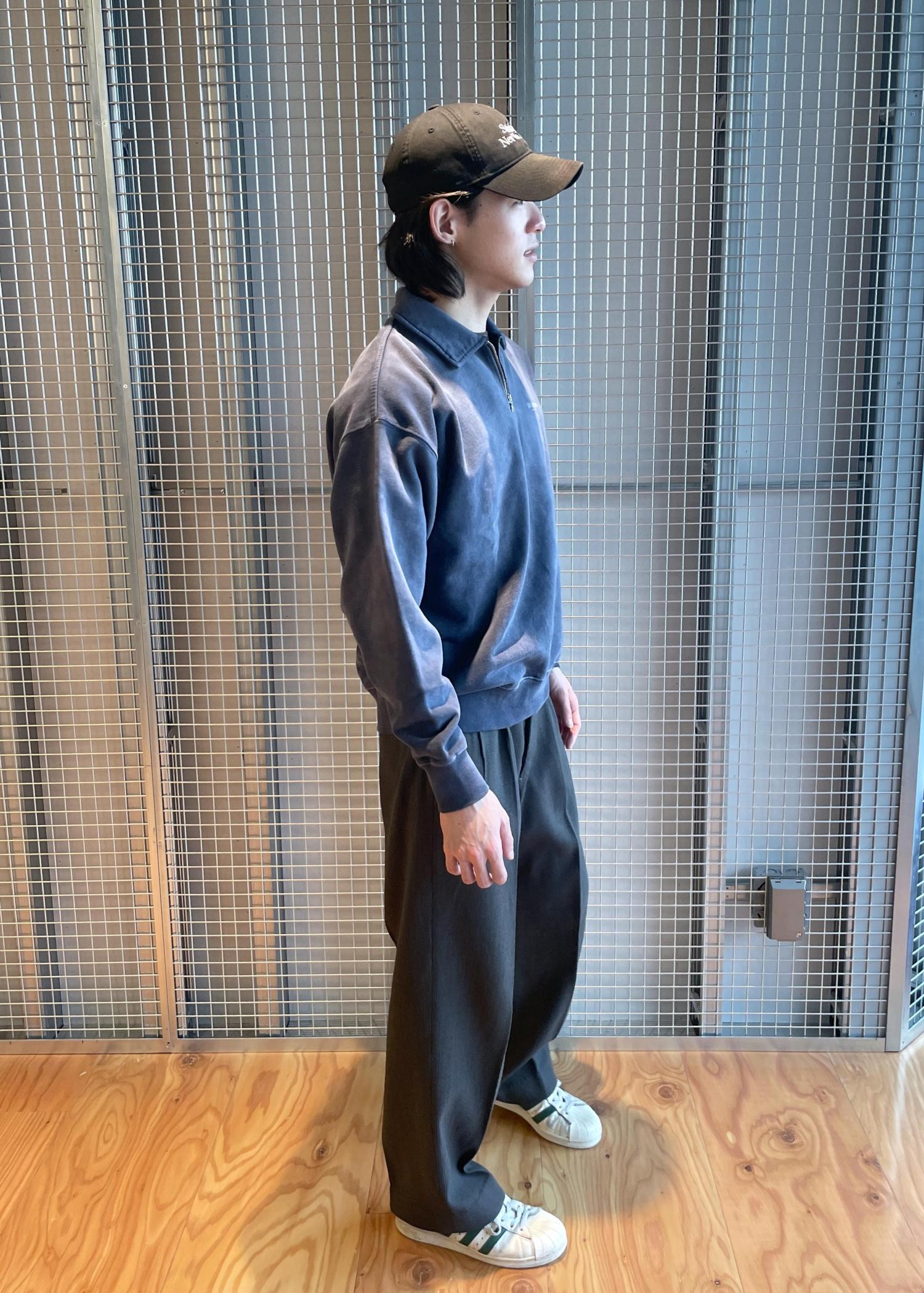 衿付きジップポロデザインのスウェットシャツは、ヘビーウェイトの裏毛素材に日焼け加工を施したビンテージライクな仕上がりに!リラックスしたサイジングで現代的なシルエットになっています。