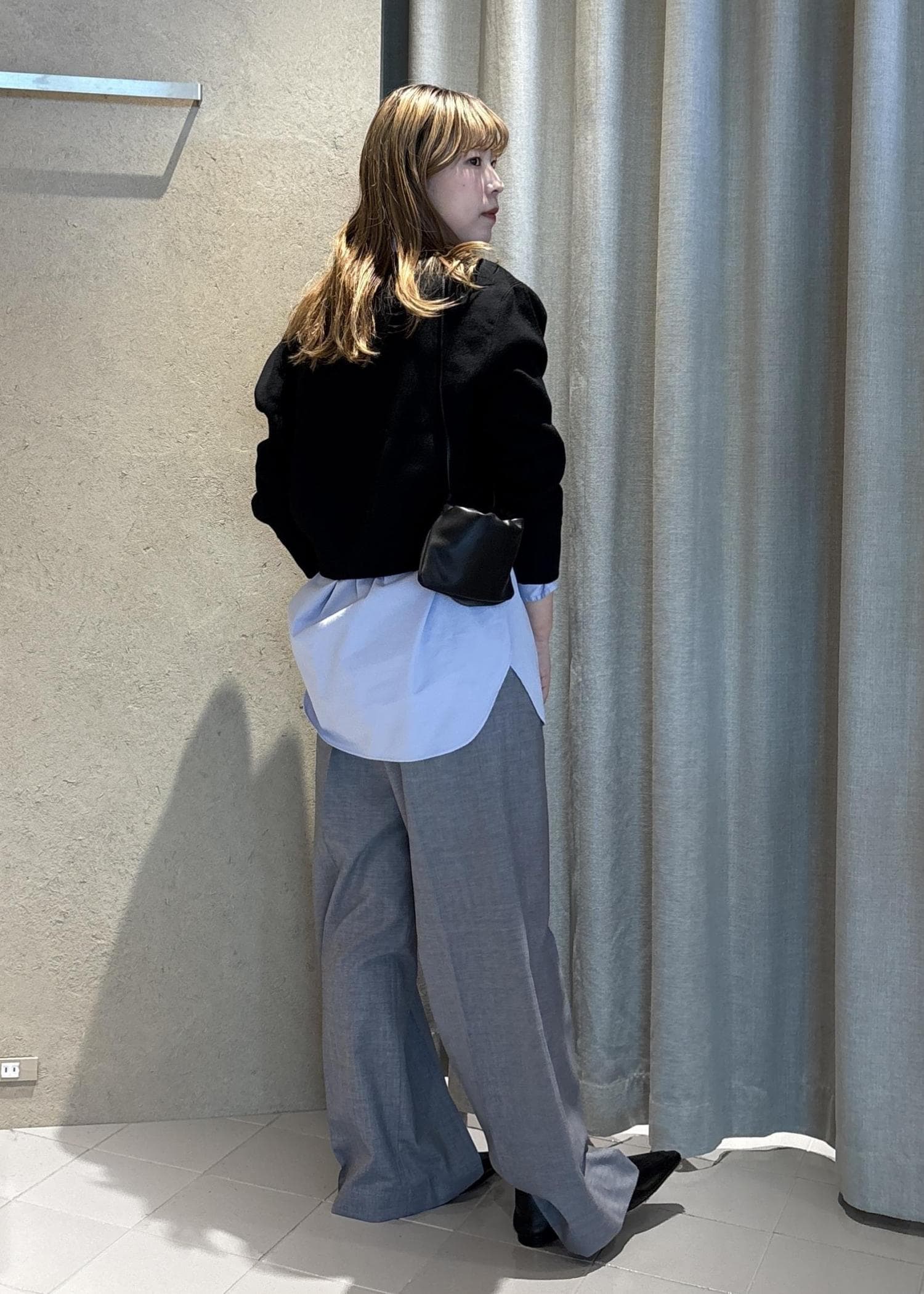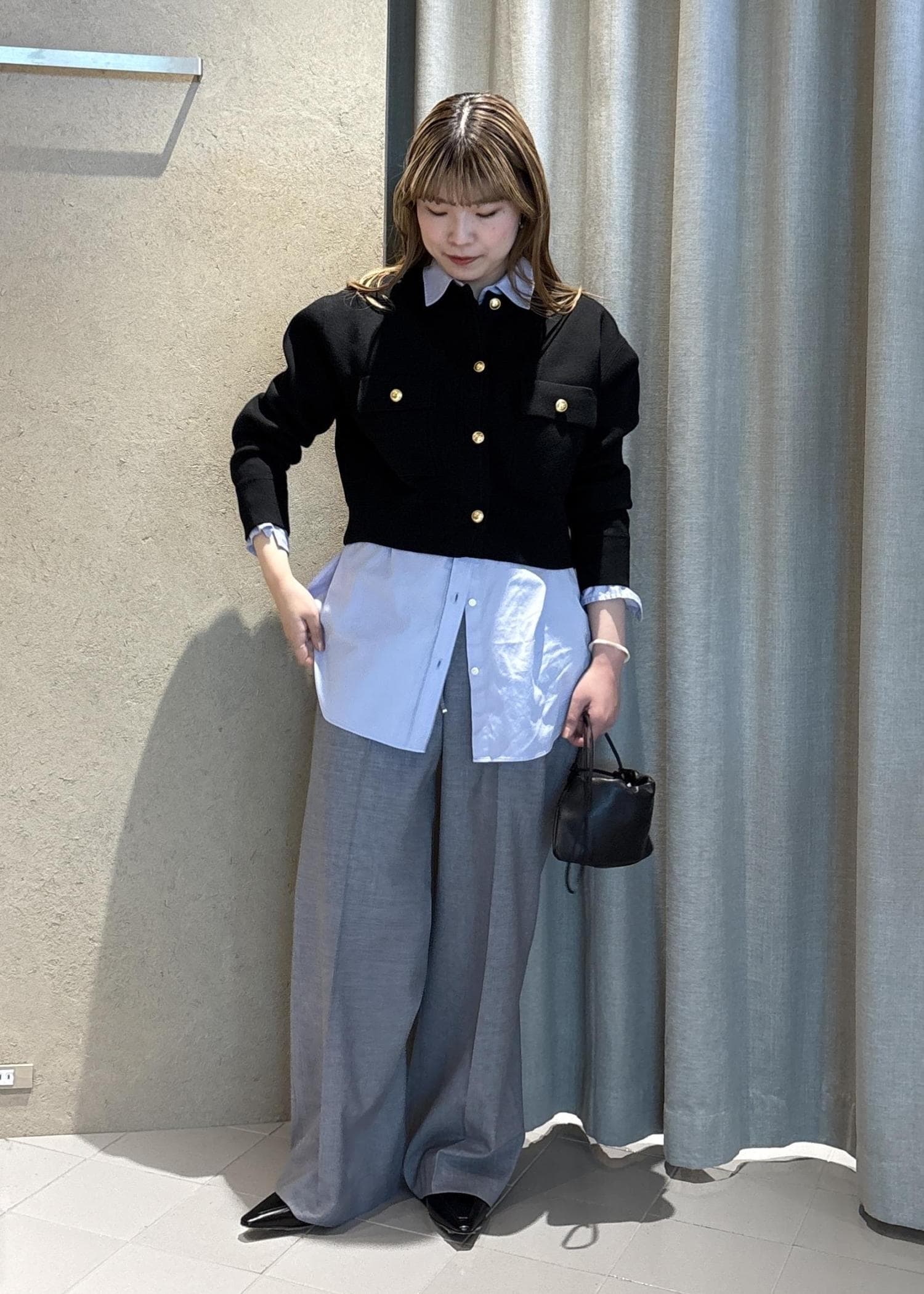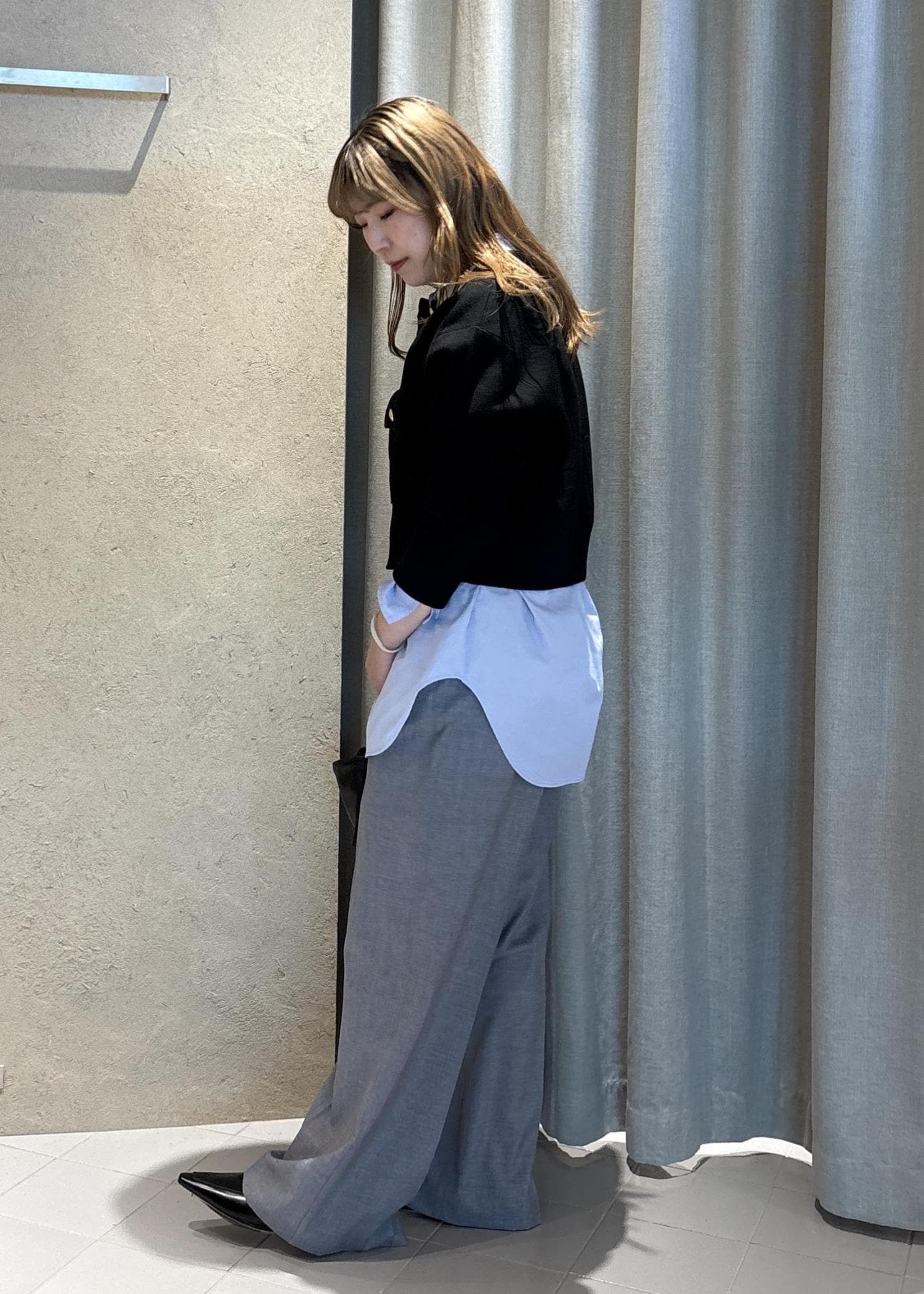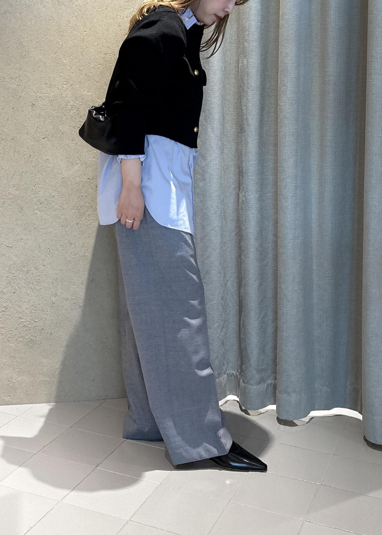 ブルーのシャツは個人的にとてもすきなアイテムで、白シャツだとマニッシュになりそうなところを(それはそれで好き)少し遊び心があるような感じになるのが推しポイントです。