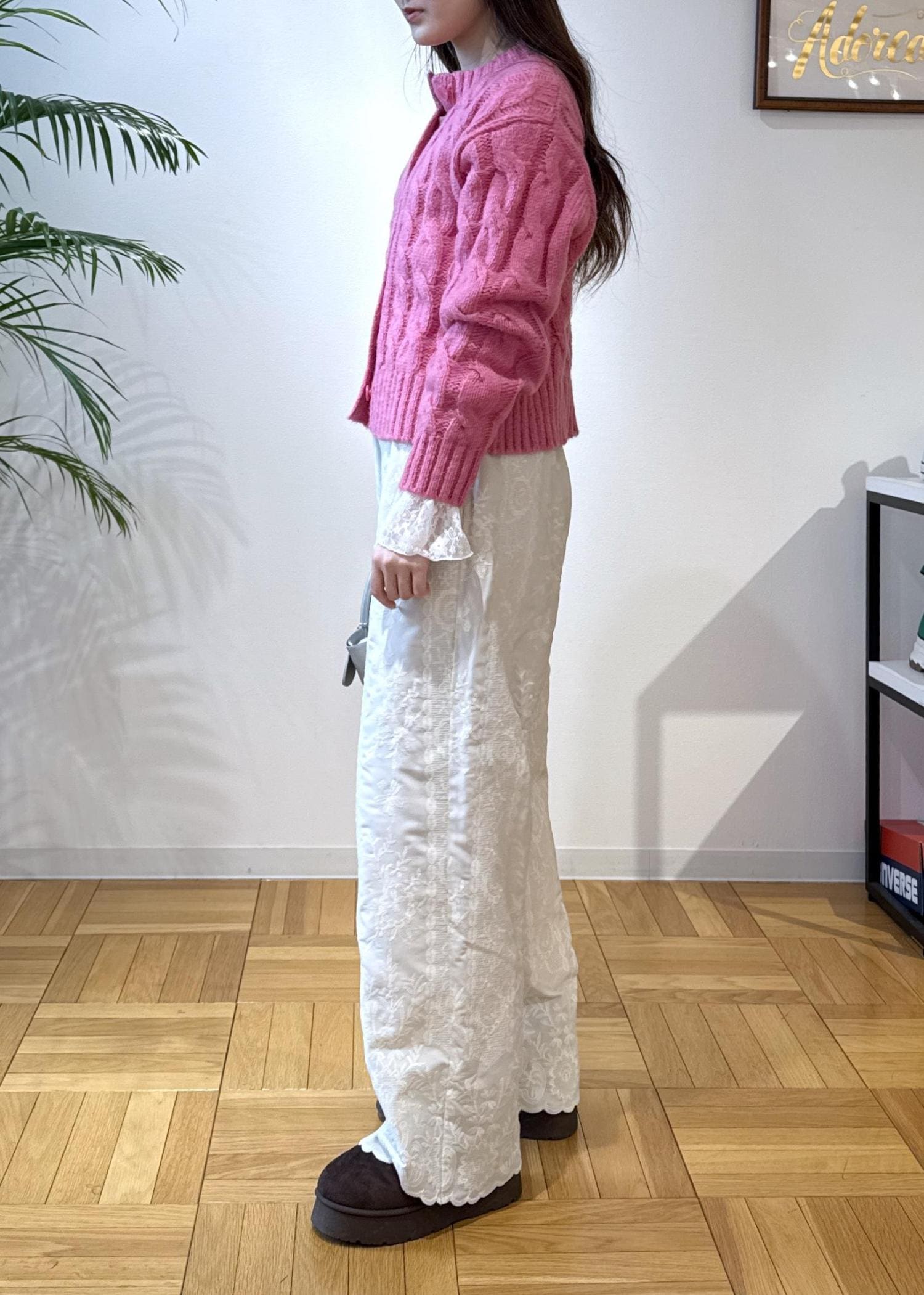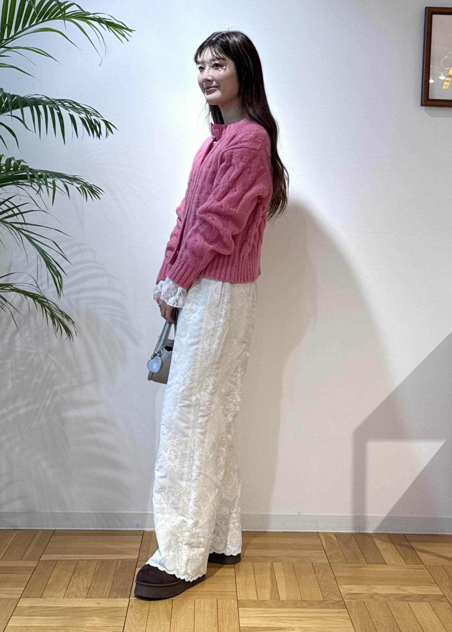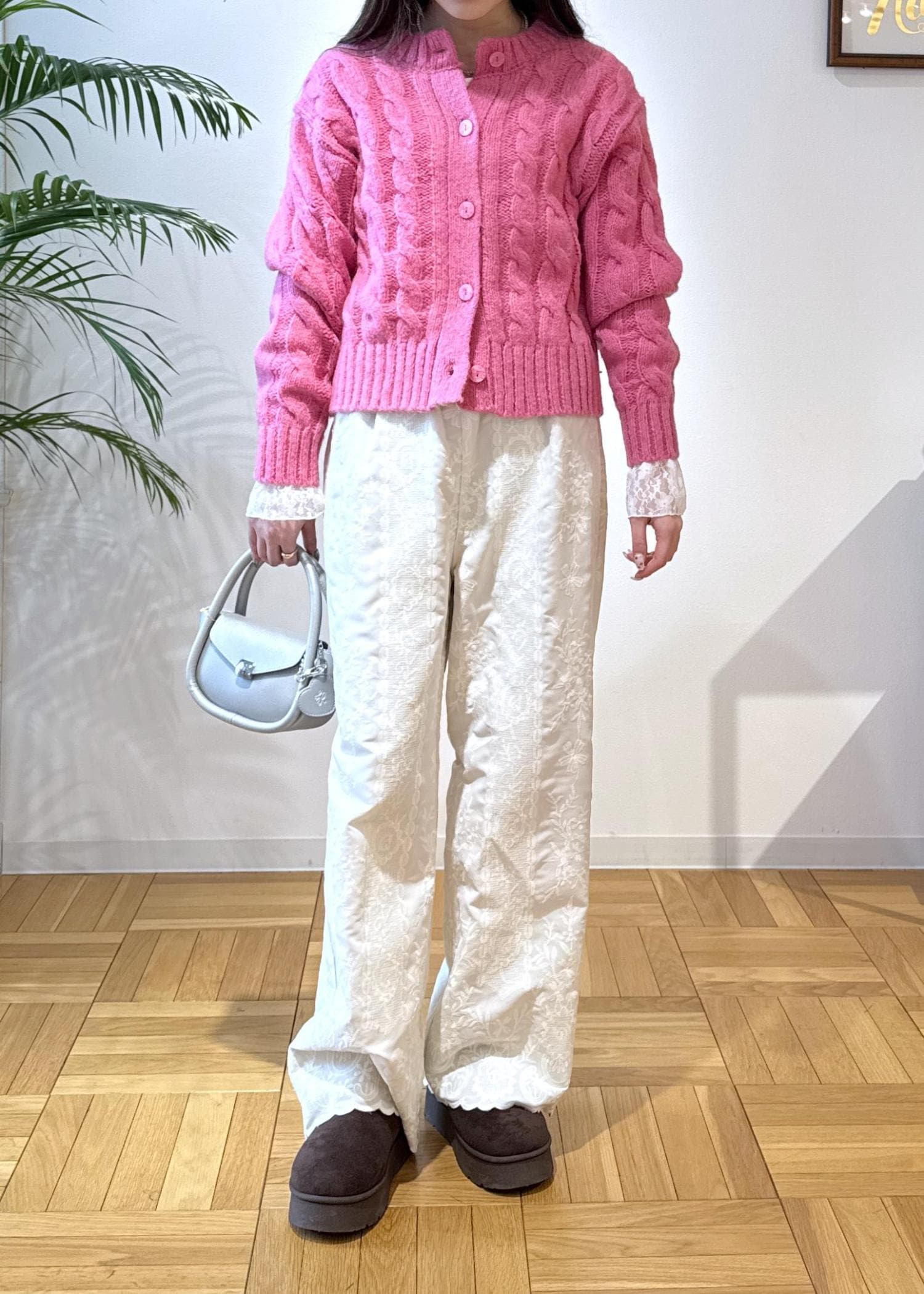 冬場は落ち着いたお色味を着がちですが、ピンクがアクセントに!