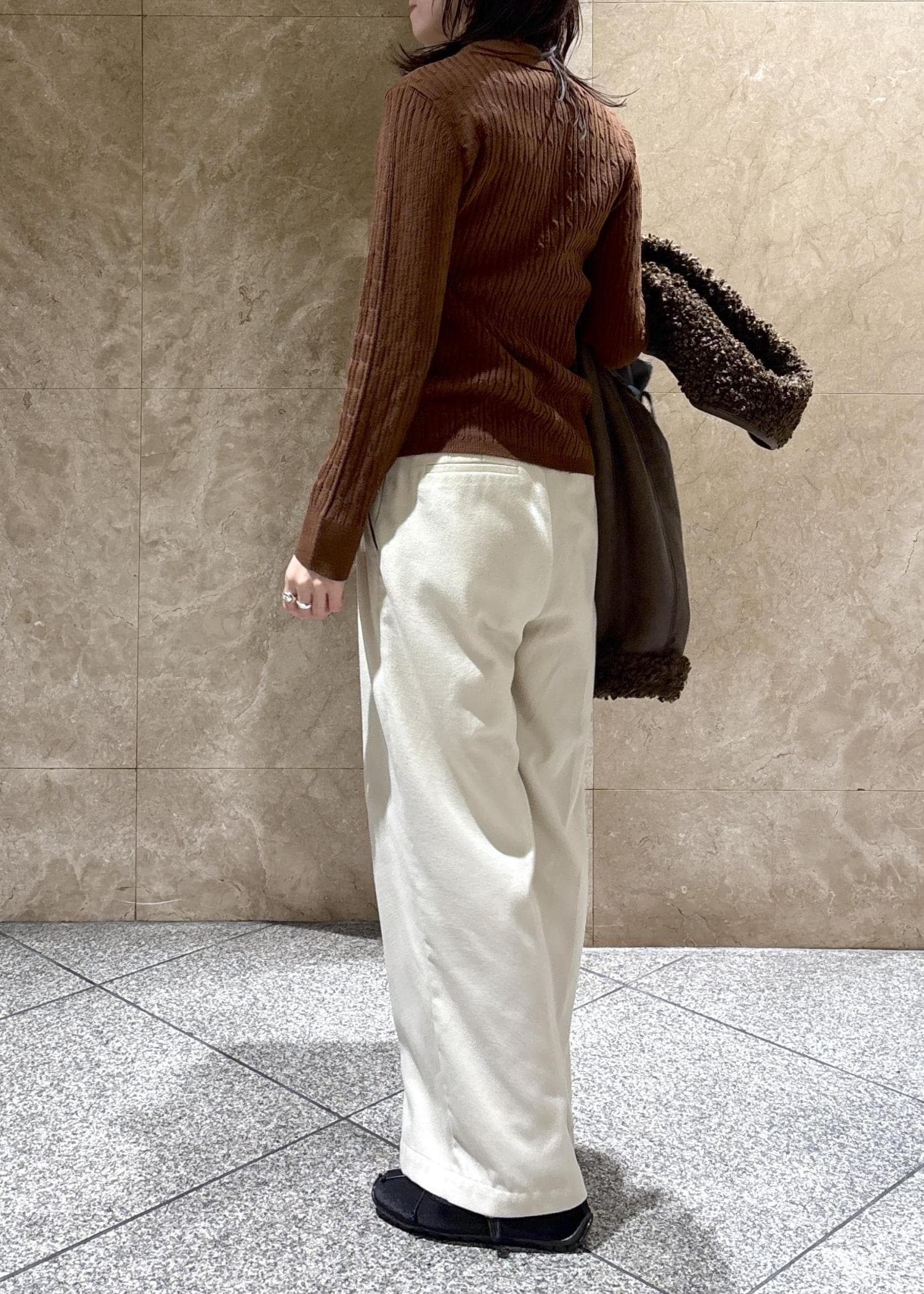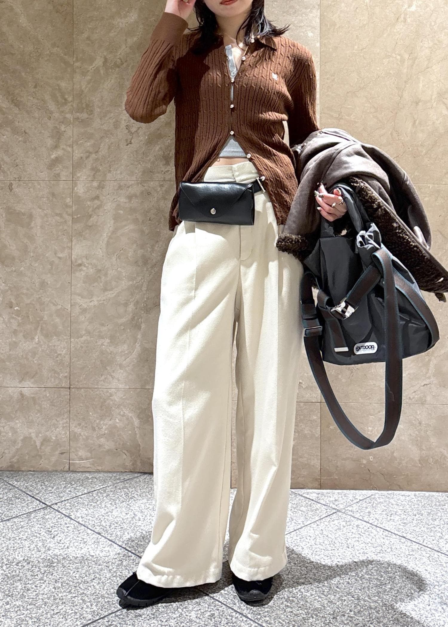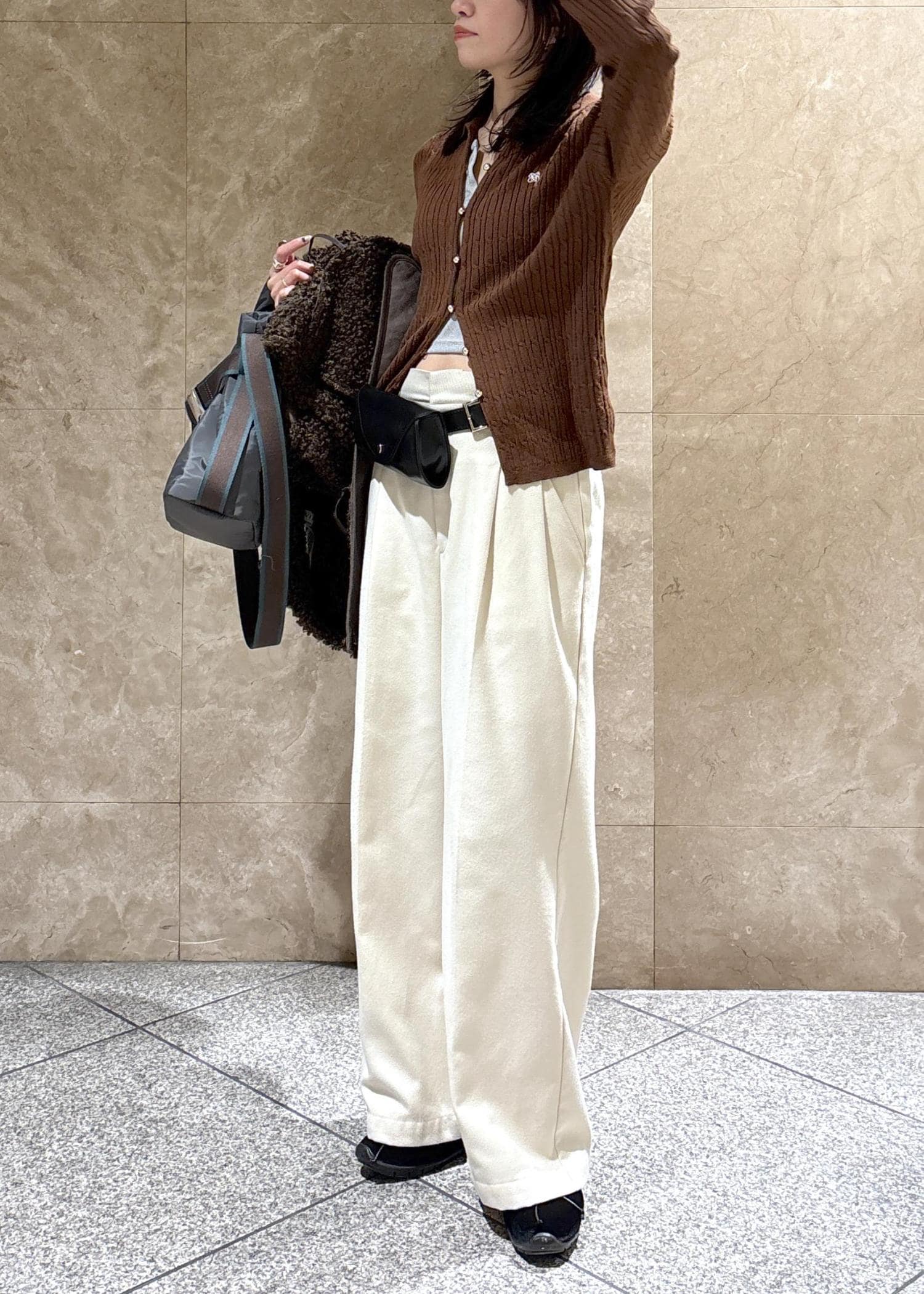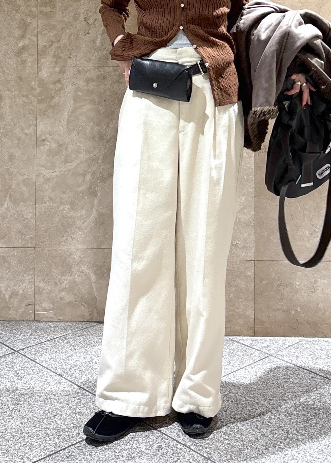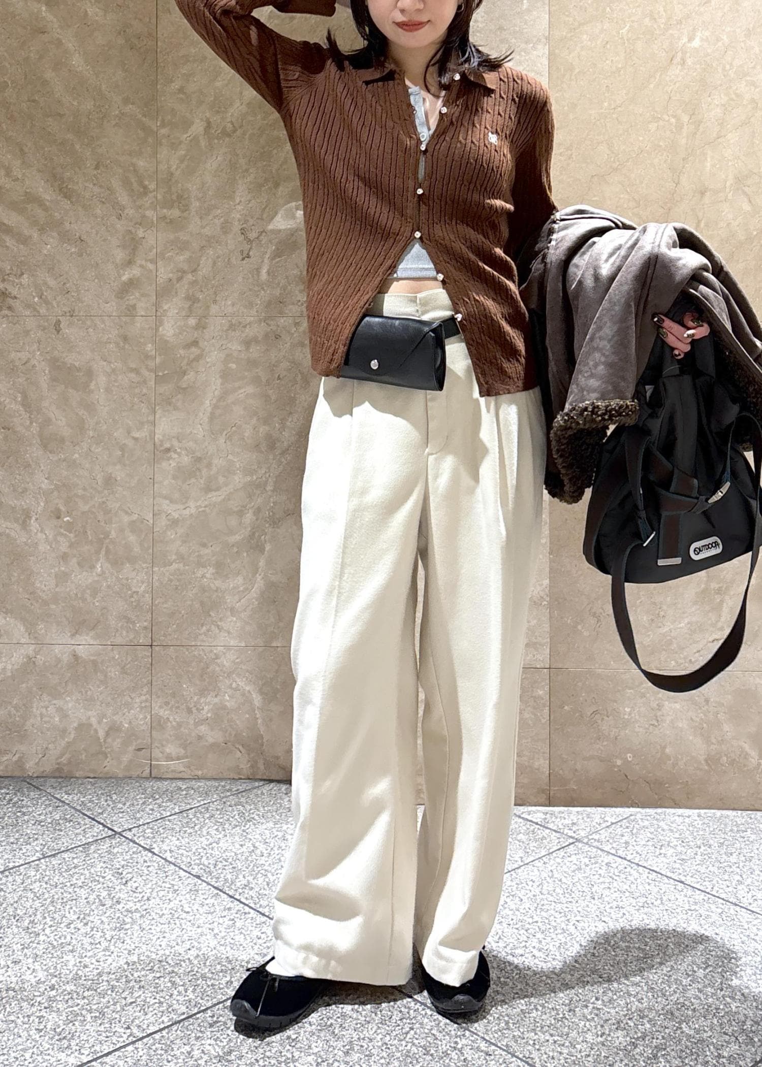 2BUY10%OFFVIS起毛ウールライク版ベルトディテールタックワイドパンツキナリ / M¥5,271レビューベルトをおへその位置でしっかりハイウエストで履くと足首が出る丈ですが、へそ下で履いてもシルエットが崩れなかったので、敢えて腰で落として着丈長めに着用しています。
