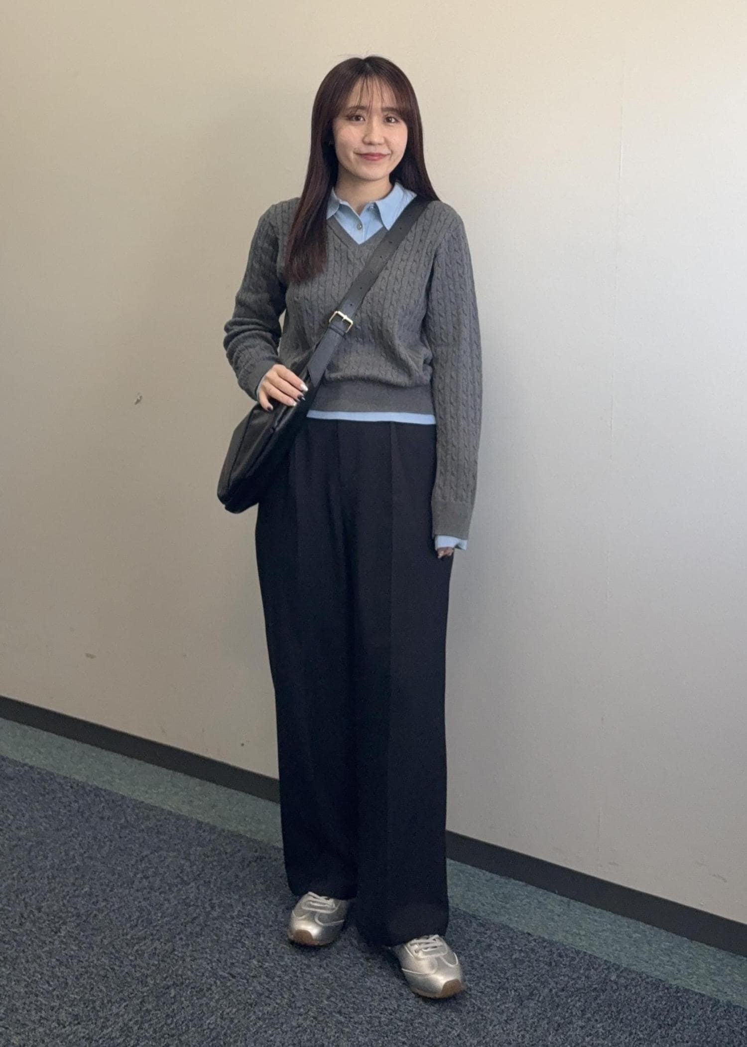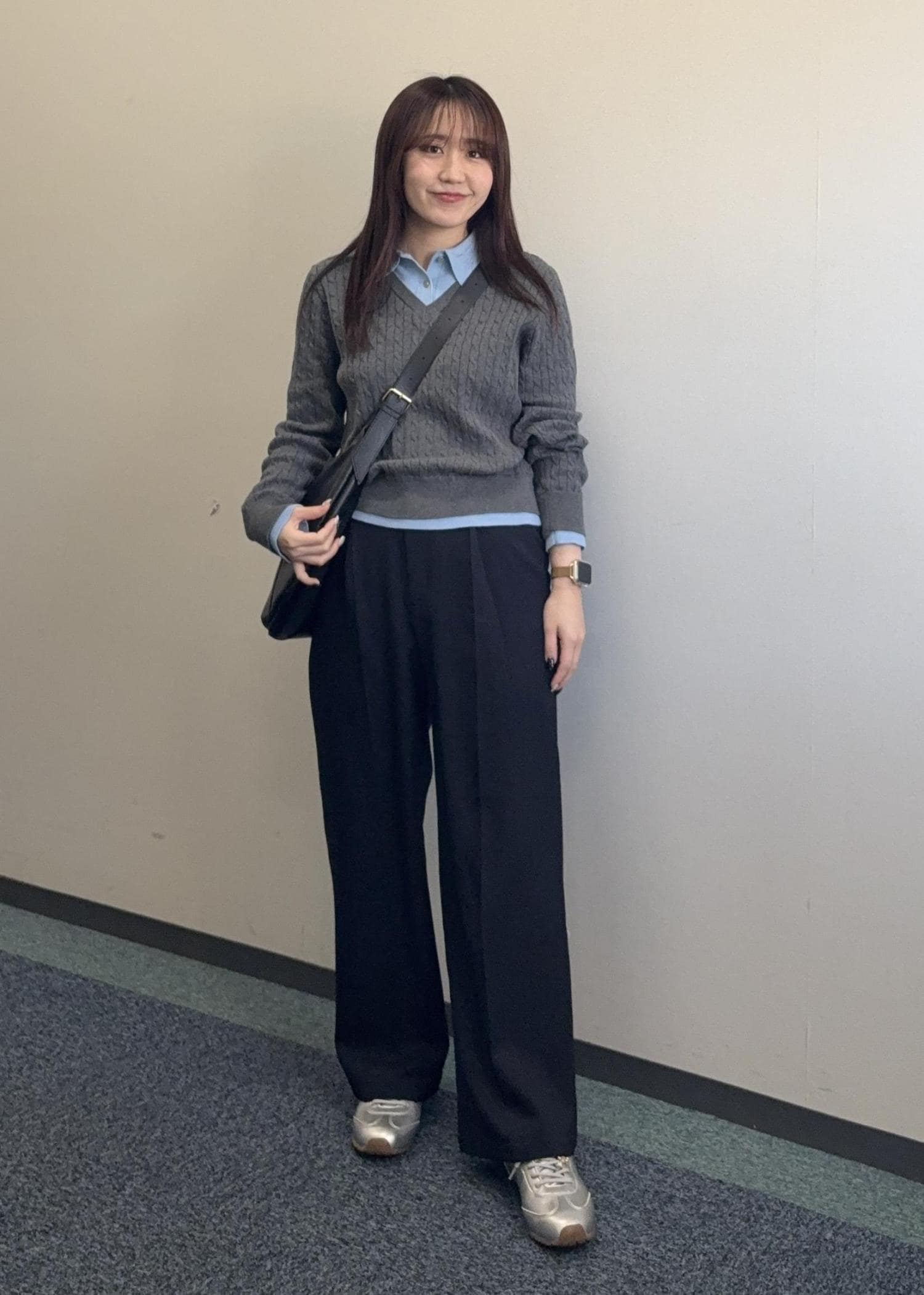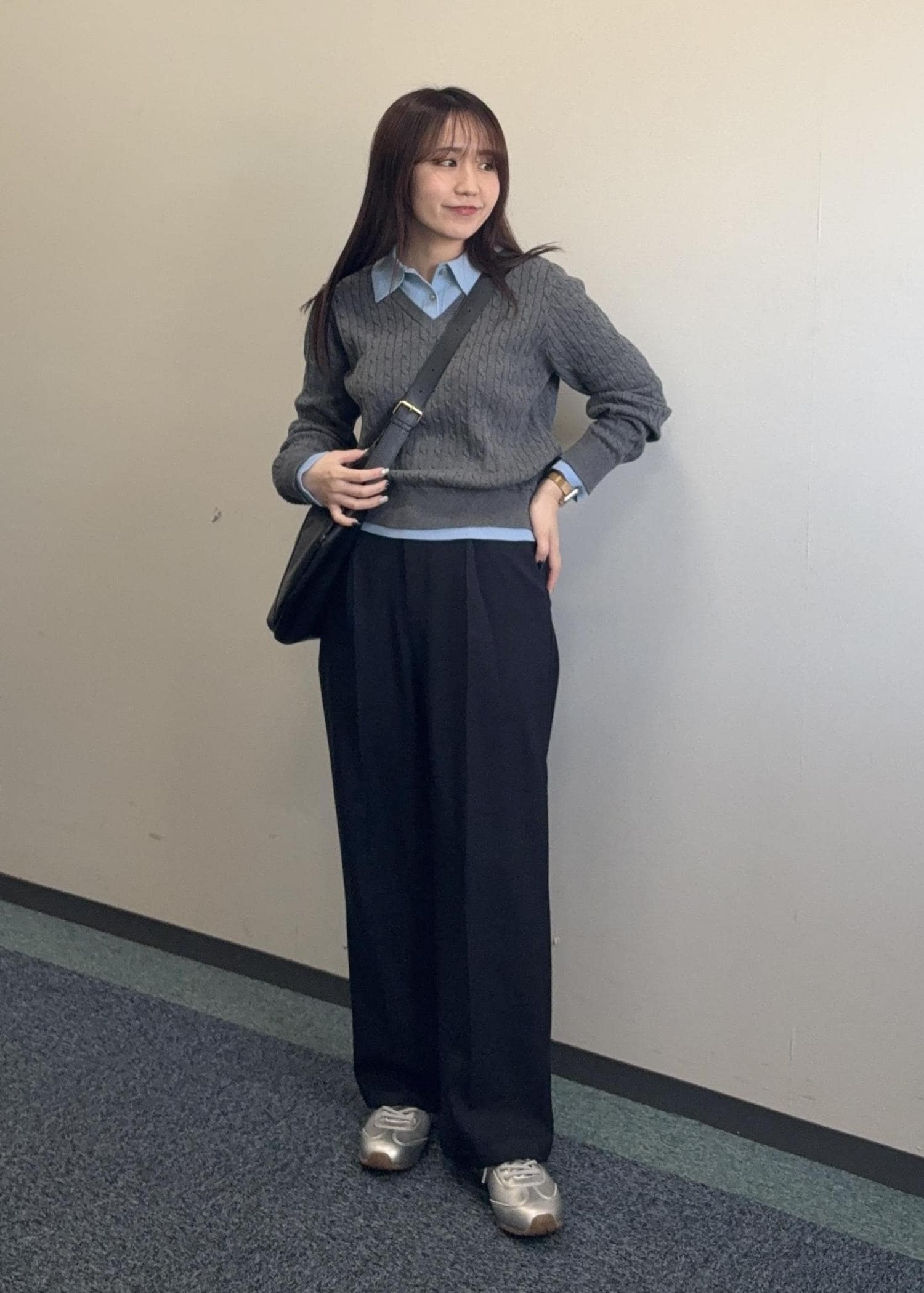1枚で着映えするレイヤード風トップスにネイビーの綺麗めパンツを合わせた綺麗めカジュアルコーデ。