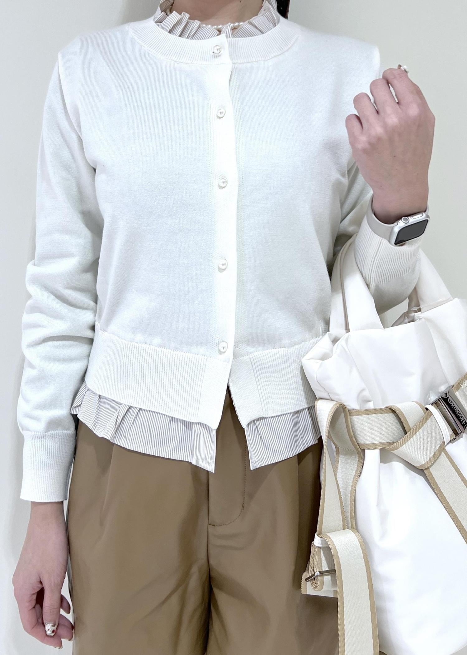 VIS【美得】フリル襟ドッキングニットカーディガントップスオフホワイト / F¥5,929レビュー襟や裾はニットにドッキングされているので、着ぶくれする事なく1枚でお洒落にスタイリング出来ます◎着丈は腰にかかるくらいで、コンパクト過ぎないサイズ感でした!