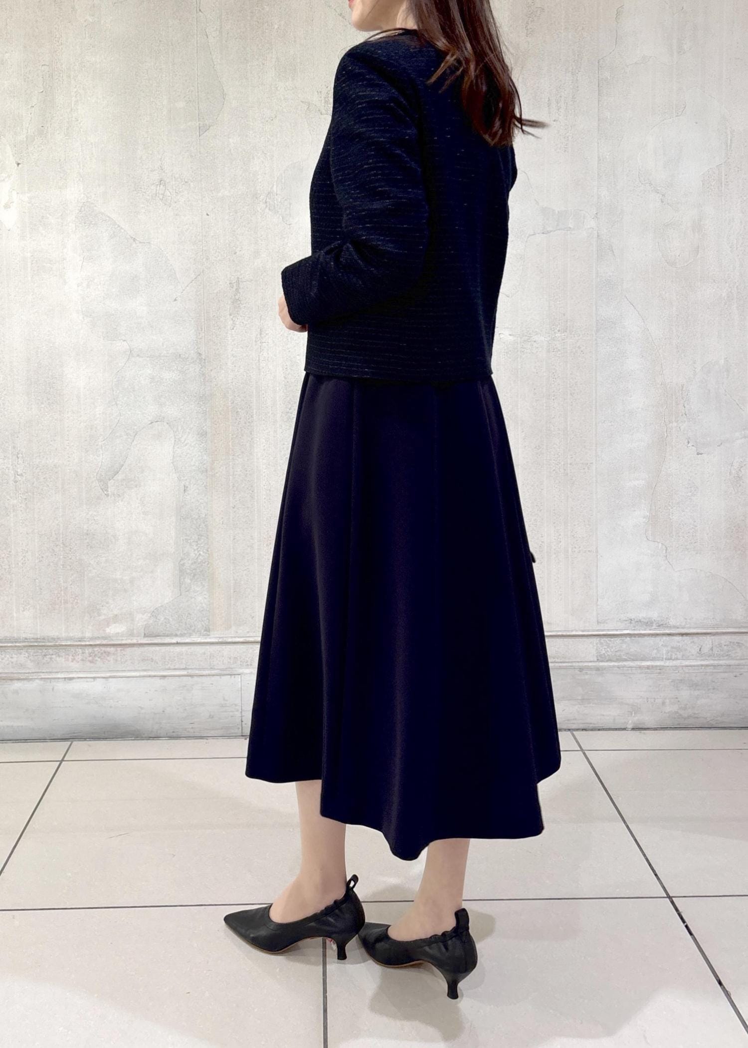 腰回りがすっきり見え、裾にかけて緩やかに広がるシルエット。座った時も膝が見えないので、安心。