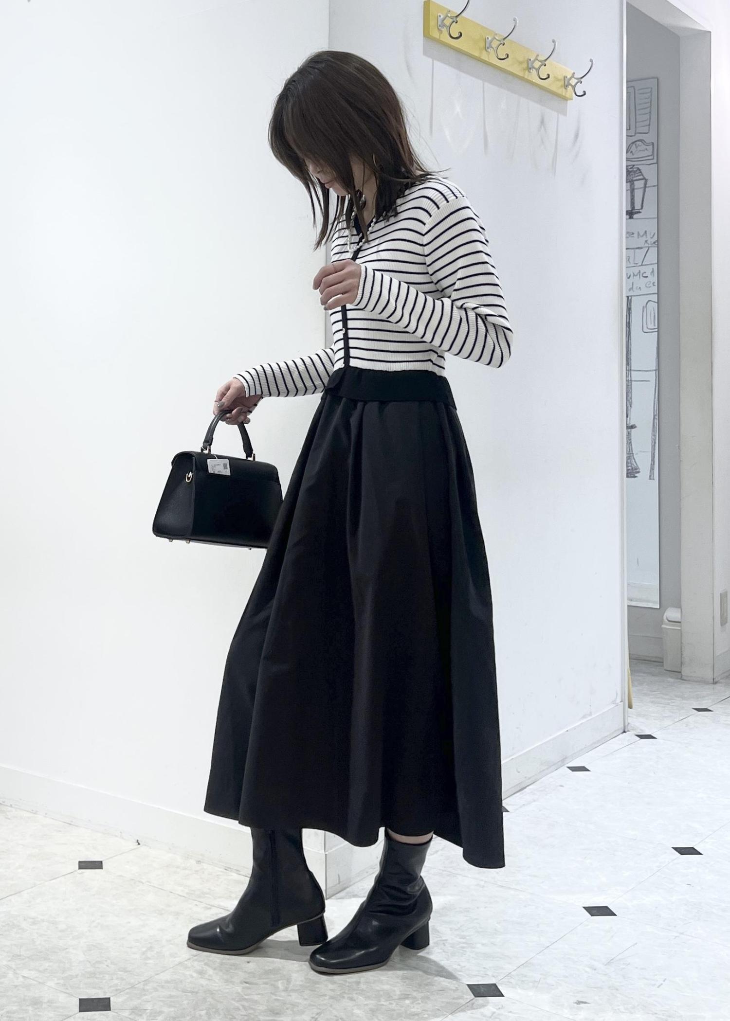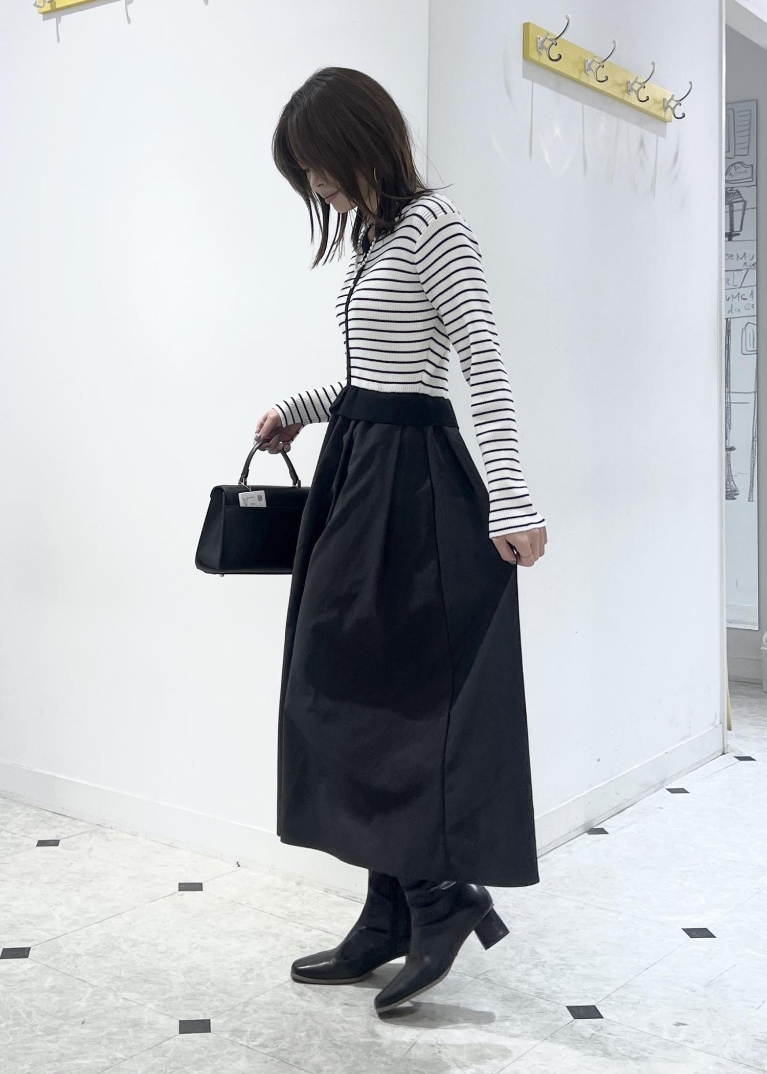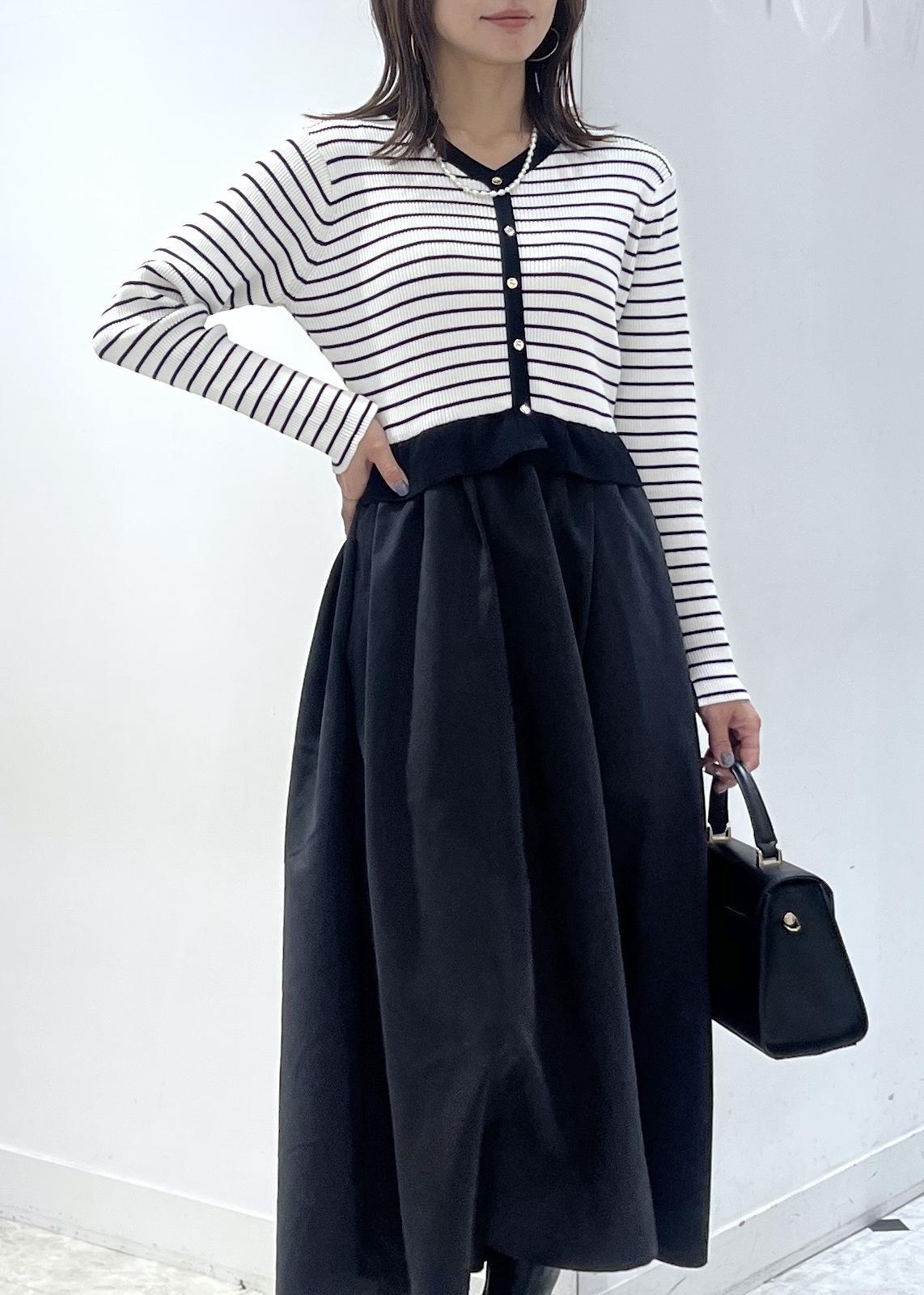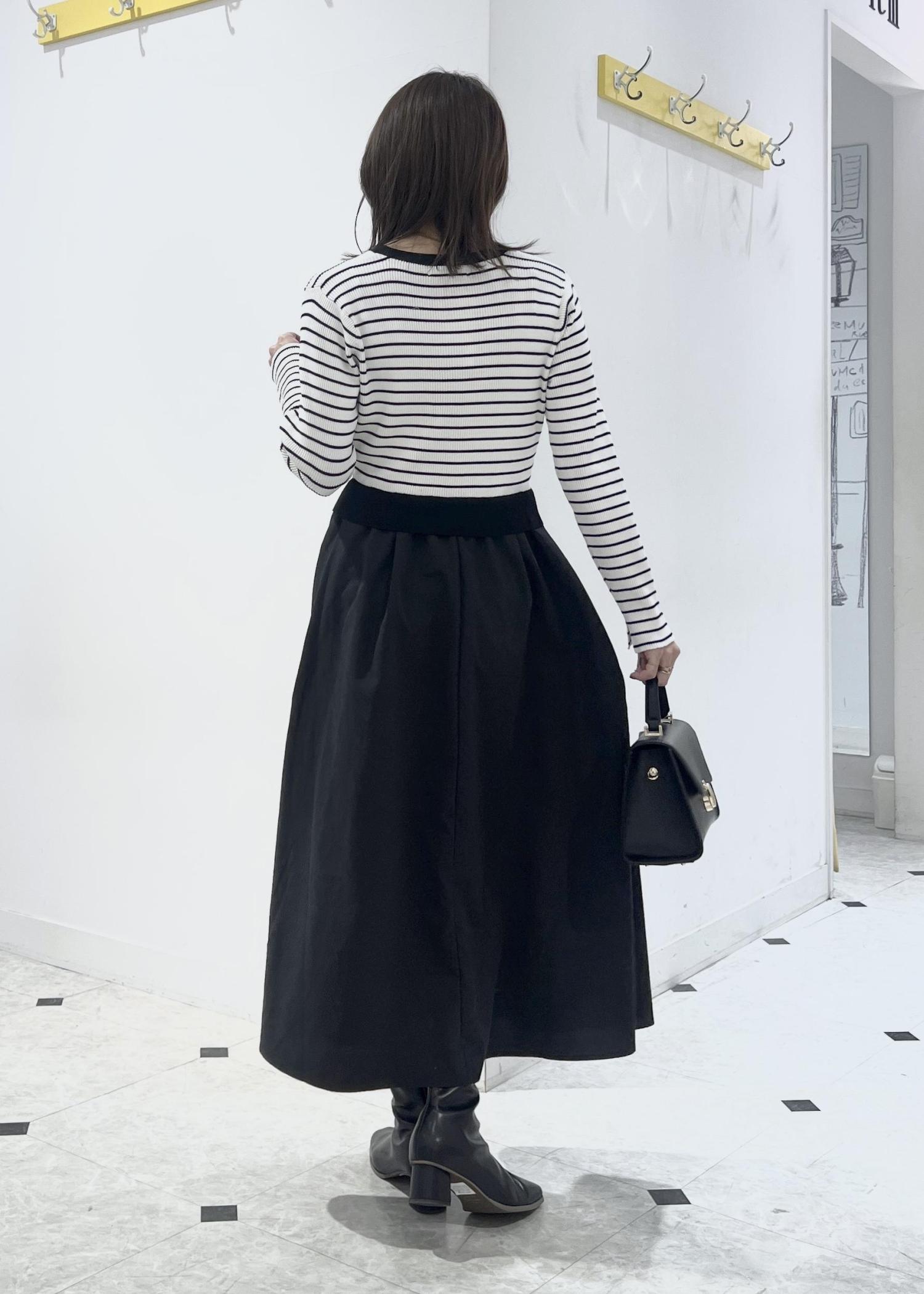 リブニットとフレアスカートがドッキングされたワンピースは、1枚着るだけでコーデが完成できるアイテム◎。