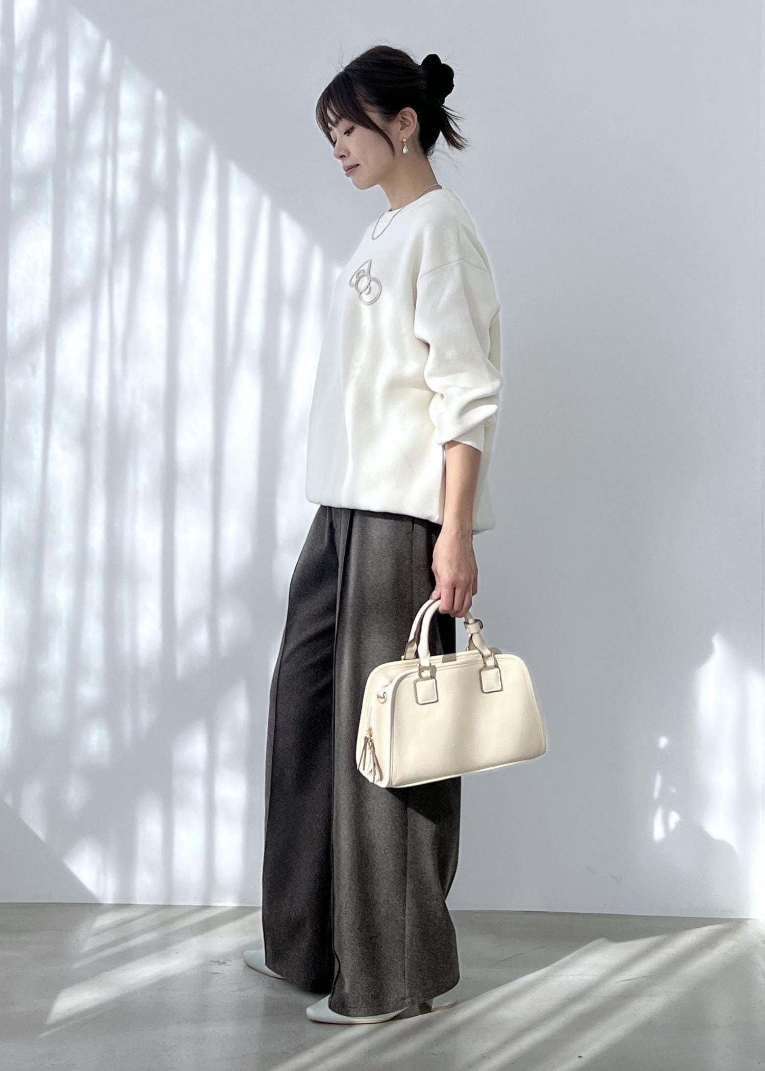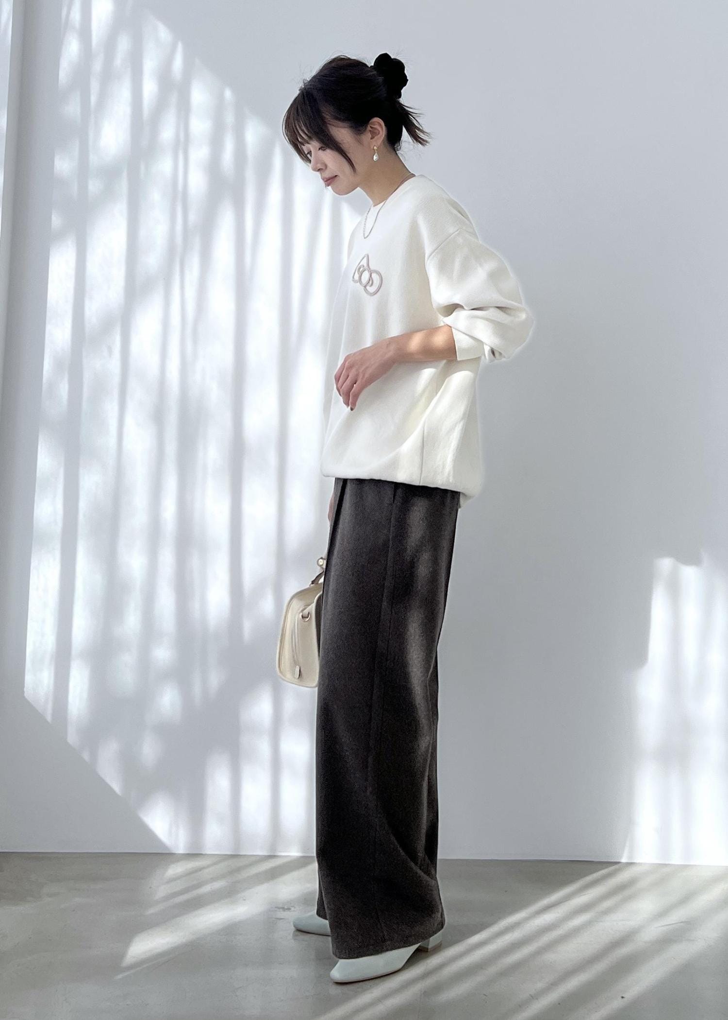 可愛らしいキャラクターアイテムには、ワイドパンツでシンプルなスタイリングにしました。