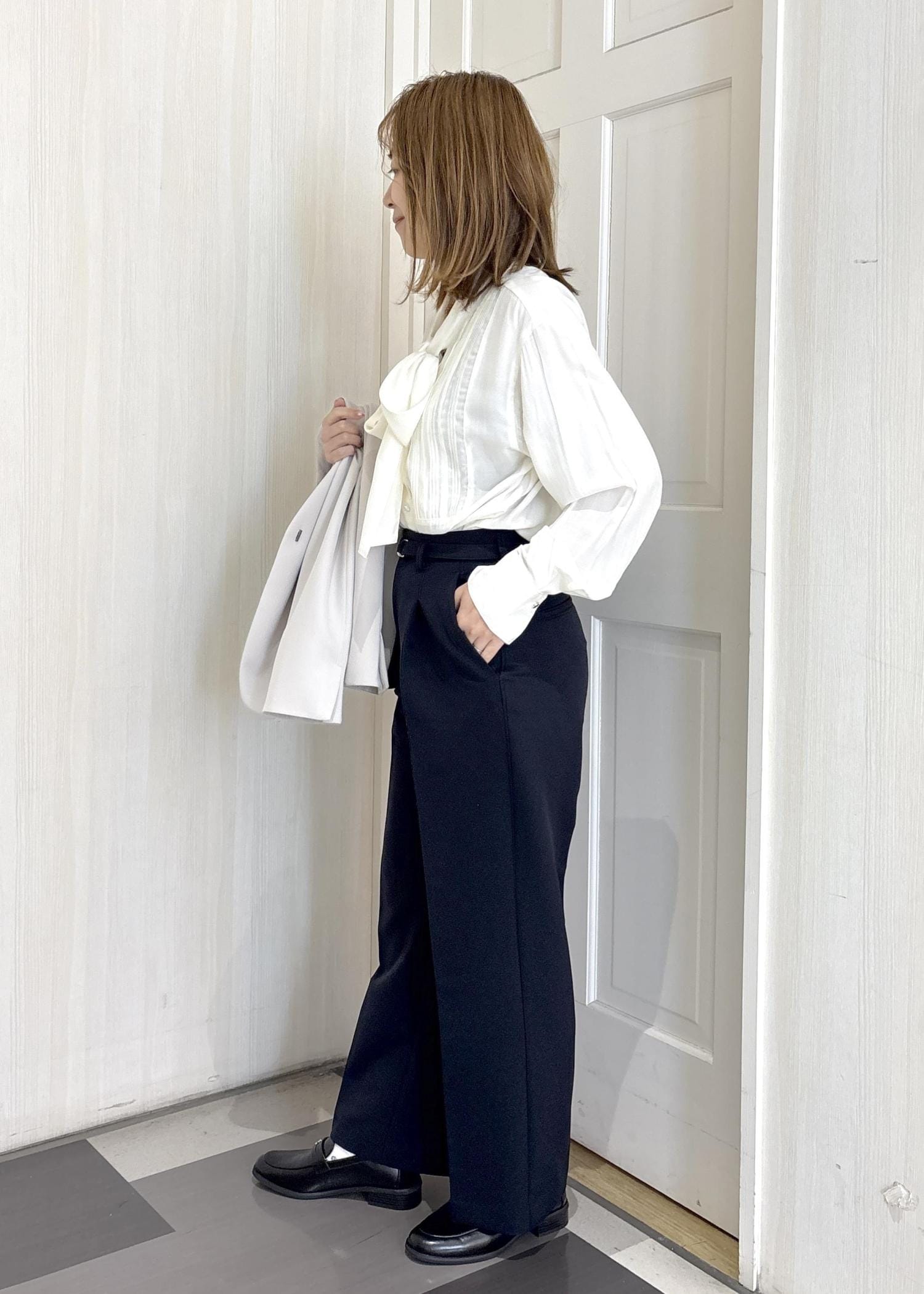 2BUY10%OFFVISランダムピンタックボウタイブラウスホワイト系 / F¥5,271レビューややシアー感があり、ピンタック入りなので生地感もたっぷりと高級感ある仕立てになっています。