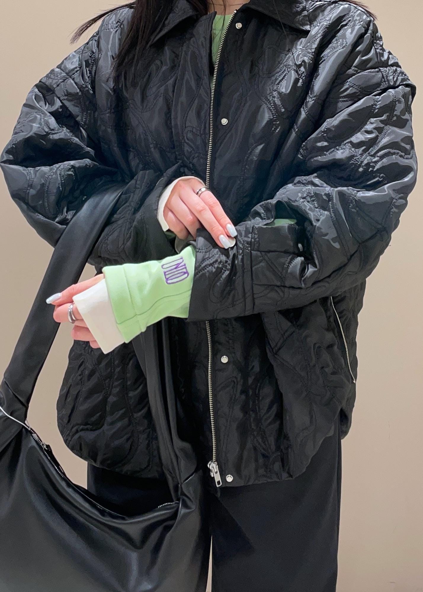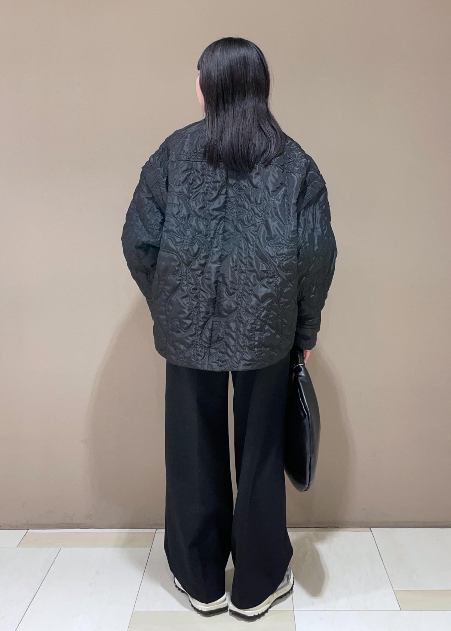店頭でも大人気なキルティングジャケットとNIKKEのデニムを黒でまとめ、インナーに春らしいライトグリーンを持ってきました◎差し色になっていてかわいい、、、!